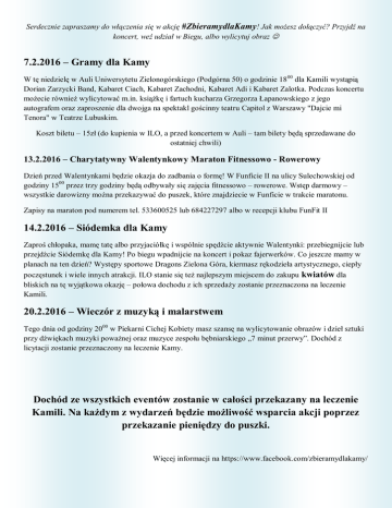 Serdecznie zapraszamy do włączenia się w akcję #ZbieramydlaKamy! Jak możesz dołączyć? Przyjdź na koncert, weź udział w Biegu, albo wylicytuj obraz 7.2.2016 – Gramy dla Kamy W tę niedzielę w Auli Uniwersytetu Zielonogórskiego (Podgórna 50) o godzinie 18 00 dla Kamili wystąpią Dorian Zarzycki Band, Kabaret Ciach, Kabaret Zachodni, Kabaret Adi i Kabaret Zalotka. Podczas koncertu możecie również wylicytować m.in. książkę i fartuch kucharza Grzegorza Łapanowskiego z jego autografem oraz zaproszenie dla dwojga na spektakl gościnny teatru Capitol z Warszawy "Dajcie mi Tenora" w Teatrze Lubuskim. Koszt biletu – 15zł (do kupienia w ILO, a przed koncertem w Auli – tam bilety będą sprzedawane do ostatniej chwili) 13.2.2016 – Charytatywny Walentynkowy Maraton Fitnessowo - Rowerowy Dzień przed Walentynkami będzie okazja do zadbania o formę! W Funficie II na ulicy Sulechowskiej od godziny 1500 przez trzy godziny będą odbywały się zajęcia fitnessowo – rowerowe. Wstęp darmowy – wszystkie darowizny można przekazywać do puszek, które znajdziecie w Funficie w trakcie maratonu. Zapisy na maraton pod numerem tel. 533600525 lub 684227297 albo w recepcji klubu FunFit II 14.2.2016 – Siódemka dla Kamy Zaproś chłopaka, mamę tatę albo przyjaciółkę i wspólnie spędźcie aktywnie Walentynki: przebiegnijcie lub przejdźcie Siódemkę dla Kamy! Po biegu wpadnijcie na koncert i pokaz fajerwerków. Co jeszcze mamy w planach na ten dzień? Występy sportowe Dragons Zielona Góra, kiermasz rękodzieła artystycznego, ciepły poczęstunek i wiele innych atrakcji. ILO stanie się też najlepszym miejscem do zakupu kwiatów dla bliskich na tę wyjątkowa okazję – połowa dochodu z ich sprzedaży zostanie przeznaczona na leczenie Kamili. 20.2.2016 – Wieczór z muzyką i malarstwem Tego dnia od godziny 2000 w Piekarni Cichej Kobiety masz szansę na wylicytowanie obrazów i dzieł sztuki przy dźwiękach muzyki poważnej oraz muzyce zespołu bębniarskiego „7 minut przerwy”. Dochód z licytacji zostanie przeznaczony na leczenie Kamy. Dochód ze wszystkich eventów zostanie w całości przekazany na leczenie Kamili. Na każdym z wydarzeń będzie możliwość wsparcia akcji poprzez przekazanie pieniędzy do puszki. Więcej informacji na https://www.facebook.com/zbieramydlakamy/