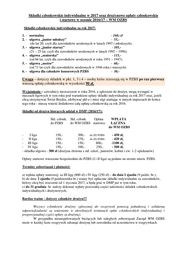 Składki członkowskie indywidualne w 2017 oraz drużynowe opłaty członkowskie i startowe w sezonie 2016/17 – WM OZBS Składki członkowskie indywidualne za rok 2017: 1. - normalna - 160,-zł 2. - ulgowa „junior młodszy” - 55,(do lat 20, czyli dla zawodników urodzonych w latach 1997 i młodszych), 3. - ulgowa „junior starszy” - 105,(21 – 25 lat, czyli dla zawodników urodzonych w latach 1992 – 1996), 4. - ulgowa „seniorska” - 115,(od 66 lat, czyli dla zawodników urodzonych w roku 1951 – 1947), 5. - ulgowa „nestor” - 60,(od 71 lat czyli dla zawodników urodzonych w 1946 roku i starszych) 6. - ulgowa dla członków honorowych PZBS - 30,- Uwaga – dotyczy składek w pkt. 1, 3 i 4 – osoby które zrzeszają się w PZBS po raz pierwszy wnoszą opłatę członkowską w wysokości 90 zł. Wyjaśnienie – zawodnicy niezrzeszeni w roku 2016, a zgłoszeni do drużyn, mogą wystąpić w meczach ligowych w tym roku pod warunkiem opłaty składki indywidualnej za rok 2017 oraz, jeżeli chcą otrzymywać Świat Brydża, zdobywać pkl-e i mieć ulgi startując w innych imprezach do końca tego roku - muszą wnieść dodatkowo całą opłatę członkowską za rok 2016. Składki od drużyn biorących udział w DMP (2016/17): Skł. członk. Skł. członk. Opłata do PZBS do WM OZBS startowa WPŁATA ŁĄCZNA do WM OZBS I liga 150,300,- do ZG PZBS - 450 zł, II liga 150,270,- do ZG PZBS - 420 zł, - III liga 150,150,800,-1100 zł, - IV liga 150,100,250,- 500 zł, - składka ulgowa - 300 zł (drużyna złożona z mł. szkol., juniorów, kobiet i ew. 1-2 opiekunów) Opłaty startowe wnoszone bezpośrednio do PZBS (I i II liga) są podane na stronie intern. PZBS. Terminy zobowiązań i płatności: a) wpłata opłaty startowej: za III ligę (800 zł) i IV ligę (250 zł) – do dnia I zjazdu (9 paźdz. br.), b) do dnia I zjazdu (9 października br.) winny być opłacone składki indywidualne za zawodników, którzy chcą być zrzeszeni od 1 stycznia 2017, a będą grać w DMP już w tym roku, c) do 31 grudnia br. należy dokonać wpłaty pozostałej części należności składek członkowskich indywidualnych i drużynowych, Bardzo ważne - dotyczy członków drużyn!!! Wszyscy członkowie drużyny zgłoszonej do rozgrywek ponoszą jednakową i solidarną odpowiedzialność za wniesienie w określonych terminach opłat członkowskich (indywidualnej i proporcjonalnej części opłaty za drużynę). W przypadku nieuregulowanych bieżących lub zaległych zobowiązań Zarząd WM OZBS może w każdej fazie rozgrywek odsunąć drużynę lub zawodnika od uczestnictwa w rozgrywkach.