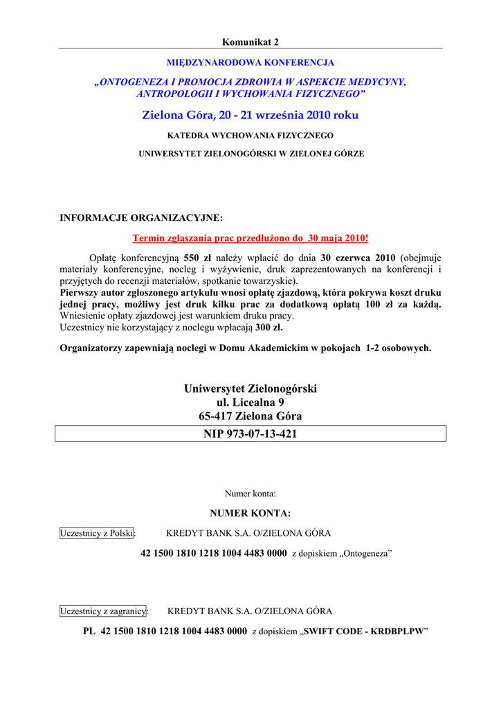 Komunikat 2 MIĘDZYNARODOWA KONFERENCJA „ONTOGENEZA I PROMOCJA ZDROWIA W ASPEKCIE MEDYCYNY, ANTROPOLOGII I WYCHOWANIA FIZYCZNEGO” Zielona Góra, 20 - 21 września 2010 roku KATEDRA WYCHOWANIA FIZYCZNEGO UNIWERSYTET ZIELONOGÓRSKI W ZIELONEJ GÓRZE INFORMACJE ORGANIZACYJNE: Termin zgłaszania prac przedłużono do 30 maja 2010! Opłatę konferencyjną 550 zł należy wpłacić do dnia 30 czerwca 2010 (obejmuje materiały konferencyjne, nocleg i wyżywienie, druk zaprezentowanych na konferencji i przyjętych do recenzji materiałów, spotkanie towarzyskie). Pierwszy autor zgłoszonego artykułu wnosi opłatę zjazdową, która pokrywa koszt druku jednej pracy, możliwy jest druk kilku prac za dodatkową opłatą 100 zł za każdą. Wniesienie opłaty zjazdowej jest warunkiem druku pracy. Uczestnicy nie korzystający z noclegu wpłacają 300 zł. Organizatorzy zapewniają noclegi w Domu Akademickim w pokojach 1-2 osobowych. Uniwersytet Zielonogórski ul. Licealna 9 65-417 Zielona Góra NIP 973-07-13-421 Numer konta: NUMER KONTA: Uczestnicy z Polski: KREDYT BANK S.A. O/ZIELONA GÓRA 42 1500 1810 1218 1004 4483 0000 z dopiskiem „Ontogeneza” Uczestnicy z zagranicy: KREDYT BANK S.A. O/ZIELONA GÓRA PL 42 1500 1810 1218 1004 4483 0000 z dopiskiem „SWIFT CODE - KRDBPLPW” Komunikat 2 Wymagania podstawowe dotyczące maszynopisu i wydruków komputerowych: Praca powinna być nie mniejsza niż 10 stron (maksymum15) tj. ponad 20000 znaków wraz ze spacjami i zawierać kolejno następujące dane: nazwa i miejsce zakładu pracy w języku polskim i angielskim, pełne imię i nazwisko autora (ów), tytuł artykułu w języku polskim i angielskim. Pracę należy podzielić na następujące części: a) streszczenie w języku polskim i angielskim obejmujące ok. 20 wierszy (200 słów) z umieszczonymi poniżej słowami kluczowymi. b) krótki wstęp (omówienie niezbędnych pojęć i celu badań), c) materiał (charakterystyka materiału badawczego), d) metoda (zwięzłe przedstawienie stosowanej metody i technik badawczych), e) wyniki (tekst, tabele, ilustracje i wykresy wyników badań – wyłącznie w edytorze Word, wskazane jest stosowanie metod statystycznych dla uwiarygodnienia wniosków), f) omówienie (wyników badań własnych w konfrontacji z doświadczeniami innych badaczy), g) wnioski (zwięzłe uogólnienia wynikające z badań), h) piśmiennictwo: powinno być ułożone alfabetycznie według nazwisk autorów pozycji, a w przypadku prac zbiorowych – według tytułów. Elementy zapisu należy oddzielić przecinkami. Każda pozycja powinna zawierać nazwisko i inicjał imienia autora, pełny tytuł dzieła, ewentualnie – inicjał imienia i nazwisko redaktora pracy zbiorowej, miejsce i rok wydania; wydawnictwo, w przypadku pracy będącej częścią większej całości (pracy zbiorowej) – również tytuł dzieła, z którego pochodzi; w przypadku pracy będącej artykułem zamieszczonym w czasopiśmie – tytuł czasopisma w cudzysłowach, rok jego wydania i kolejny numer. W przypadku umieszczenia w bibliografii kilku dzieł tego samego autora nie należy powtarzać w kolejnych pozycjach jego nazwiska, lecz powinno się zastąpić je myślnikiem. Przykład: Bielawski A., Niektóre zagadnienia woprosów, Poznań 1833. Bożonarodzeniowe szopki na przestrzeni dziejów, red. A. Kowalski, Zielona Góra 1945. Bratt W., Takie jest życie, „Wiedza i Życie” 1956, nr 13. – , Życie jest ciężkie, Warszawa 1957. Bujacz S., Zanęcanie, [w:] Makieta i co dalej, red. B. Malinowska, Lublin 1976. Burczyński M., Zanęty i przynęty, t. 1-24, Wrocław-Warszawa-Nowa Sól 1970-2001. Praca przeznaczona do wydania w Oficynie Wydawniczej UZ powinna być dostarczona w dwóch egzemplarzach wydruku i jako wydruk komputerowy CD-RW nie później niż w dniu konferencji. Tekst powinien być pisany stopniem czcionki 12 z zachowaniem marginesów: górnego ok. 25 mm, lewego ok. 35 mm. Na jednej kartce wydruku powinno być ok. 30 wierszy, odstęp między nimi na 1,5 wiersza, w każdym wierszu ok. 60 znaków (licząc łącznie z odstępami między wyrazami). Wersja elektroniczna winna być przygotowana z użyciem edytora Microsoft Word. Nie należy w tekście stosować żadnych wyróżnień. Cytaty w tekście powinny być opatrzone cudzysłowami na początku i na końcu. Tabele, rysunki, schematy powinny być kolejno numerowane, (edytor wyłącznie Word) nie mogą przekraczać poza margines artykułu. Nr tabeli należy oznaczyć cyfrą rzymską, a tytuł tabeli powinien być umieszczony nad tabelą – np. Tab. I. Ryciny, zdjęcia, wykresy należy oznaczyć cyfrą arabską z tytułem umieszczonym poniżej. Pozycje piśmiennictwa w tekście należy pisać w kwadratowych nawiasach przed kropką kończącą zdanie np.: [2, 6, 9]. Niedostosowanie się do wyżej określonych metod pisania artykułów będzie powodem zwrotu pracy do autora. Wszystkie materiały przedstawione do druku będą przedmiotem recenzowania. Rada Redakcyjna zastrzega sobie prawo do poprawek językowych, graficznych i układu tekstu. Za publikowane prace autorzy nie otrzymują honorarium. Komitet Organizacyjny Komunikat 2 MIĘDZYNARODOWA KONFERENCJA „ONTOGENEZA I PROMOCJA ZDROWIA W ASPEKCIE MEDYCYNY, ANTROPOLOGII I WYCHOWANIA FIZYCZNEGO” Zielona Góra, 20 - 21 wrzesień 2010 Imię i nazwisko: …………………………………………………………………………………………………………………….… ………………………………………………………………………………………………………………………. Proszę o rezerwację noclegu: Dom Akademicki ul. Wyspiańskiego 60 A/B, 65-001 Zielona Góra 19 / 20.09.2010 □ pokój 1 osobowy □ pokój 2 osobowy 20 / 21.09.2010 □ pokój 1 osobowy □ pokój 2 osobowy Dane instytucji, na którą wystawiona zostanie faktura VAT za udział w Konferencji: ………………………………………………………………………