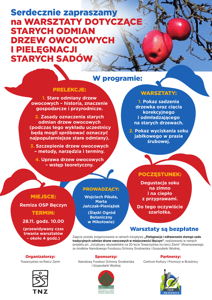 Serdecznie zapraszamy na WARSZTATY DOTYCZĄCE STARYCH ODMIAN DRZEW OWOCOWYCH I PIELĘGNACJI STARYCH SADÓW W programie: PRELEKCJE: WARSZTATY: 1. Stare odmiany drzew owocowych – historia, znaczenie gospodarcze i przyrodnicze. 2. Zasady oznaczenia starych odmian drzew owocowych (podczas tego wykładu uczestnicy będą mogli spróbować oznaczyć najpopularniejsze stare odmiany). 3. Szczepienie drzew owocowych – metody, narzędzia i terminy. 1. Pokaz sadzenia drzewka oraz cięcia korekcyjnego i odmładzającego na starych drzewach. 2. Pokaz wyciskania soku jabłkowego w prasie śrubowej. 4. Uprawa drzew owocowych – wstęp teoretyczny. POCZĘSTUNEK: Degustacja soku na zimno i na ciepło z przyprawami. PROWADZĄCY: MIEJSCE: Remiza OSP Bęczyn TERMIN: 28.11. godz. 10.00 (przewidywany czas trwania warsztatów – około 4 godz.) Wojciech Pikuła, Marta Jańczak-Pieniążek Do tego oczywiście szarlotka. (Śląski Ogród Botaniczny w Mikołowie) Warsztaty są bezpłatne Zajęcia zostały zorganizowane w ramach inicjatywy „Pielęgnacja i odtwarzanie starego sadu tradycyjnych odmian drzew owocowych w miejscowości Bęczyn”, realizowanej w ramach projektu pn. „Inicjatywy obywatelskie na 20-lecie Towarzystwa na rzecz Ziemi” sfinansowanego ze środków Narodowego Funduszu Ochrony Środowiska i Gospodarki Wodnej. Organizatorzy: Sponsorzy: Partnerzy: Towarzystwo na Rzecz Ziemi Narodowy Fundusz Ochrony Środowiska i Gospodarki Wodnej Centrum Kultury i Promocji w Brzeźnicy