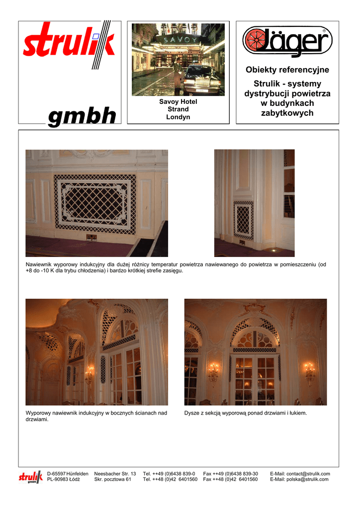 Obiekty referencyjne Savoy Hotel Strand Londyn Strulik - systemy dystrybucji powietrza w budynkach zabytkowych Nawiewnik wyporowy indukcyjny dla dużej różnicy temperatur powietrza nawiewanego do powietrza w pomieszczeniu (od +8 do -10 K dla trybu chłodzenia) i bardzo krótkiej strefie zasięgu. Wyporowy nawiewnik indukcyjny w bocznych ścianach nad drzwiami. D-65597 Hünfelden PL-90983 Łódź Neesbacher Str. 13 Skr. pocztowa 61 Dysze z sekcją wyporową ponad drzwiami i łukiem. Tel. ++49 (0)6438 839-0 Tel. ++48 (0)42 6401560 Fax ++49 (0)6438 839-30 Fax ++48 (0)42 6401560 E-Mail: [email protected] E-Mail: [email protected] Zamontowane nawiewniki: Nawiewniki wyporowe indukcyjne w niskiej części ściany, w ścianach bocznych i ścianach bocznych drzwi. Nawiewniki z dyszami i sekcją wyporową powyżej drzwi i łuków. Savoy Hotel Londyn Lancaster Room Renowacja Problem: System klimatyzacji w sali balowej (Lancaster Room) Hotelu Savoy w Londynie miał ulec renowacji. System miał zapewnić warunki komfortu dla rozmaitego wykorzystania sali, różnego wydatku powietrza nawiewanego oraz dla różnych zapotrzebowań na chłód. Wygląd sali wewnątrz nie mógł się zmienić. Powierzchnia sali: 23,5 m x 18,2 m = 428 m² Całkowita ilość nawiewanego pow.: 27.500 m³/h (7.639 l/s) Maksymalna różnica temperatur pomiędzy powietrzem nawiewanym a w pomieszczeniu: 10 K Nawiewniki mogły być rozmieszczone w określonych miejscach: grzejników znajdujących się na sole ścian, na bocznych ścianach przy drzwiach, w elementach powyżej drzwi i nad łukami. Strulik – systemy dystrybucji powietrza dla budynków zabytkowych Rozwiązanie: Dla nawiewników zainstalowanych w ścianie zastosowano nawiewniki wyporowe indukcyjne z bardzo krótką strefą strumienia krytycznego. 14 nawiewników po 860 m³/h (240 l/s) i 600 m³/h (167 l/s) W bocznych ścianach przy drzwiach zastosowano podobne nawiewniki wyporowe. 20 nawiewników po 150 m³/h (42 l/s) Ponad drzwiami i łukami zastosowano nawiewniki z dyszami i sekcją wyporową. 10 x 1.270 m³/h (353 l/s) i 1 x 2270 m³/h (630 l/s) Wzornictwo, wygląd wszystkich nawiewników został dopasowany do wewnętrznej architektury, zgodnie z wymaganiami architekta. Architekt: Kontrax Management Ltd. 63 Chestfield Road, Chestfield Whitstable, Kent CT5 3JS D-65597 Hünfelden PL-90983 Łódź Neesbacher Str. 13 Skr. pocztowa 61 Tel. ++49 (0)6438 839-0 Tel. ++48 (0)42 6401560 Fax ++49 (0)6438 839-30 Fax ++48 (0)42 6401560 E-Mail: [email protected] E-Mail: [email protected]