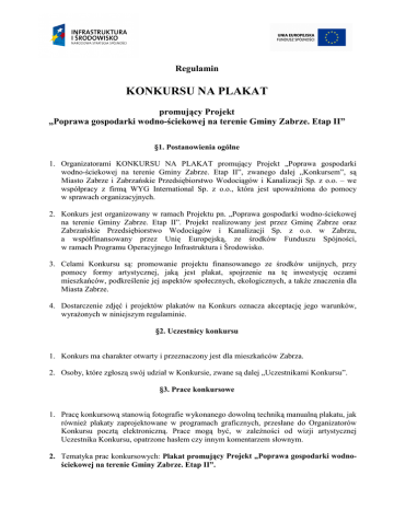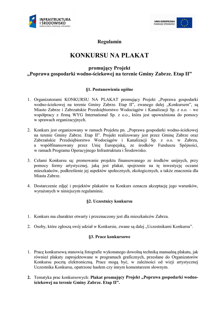 Regulamin KONKURSU NA PLAKAT promujący Projekt „Poprawa gospodarki wodno-ściekowej na terenie Gminy Zabrze. Etap II” §1. Postanowienia ogólne 1. Organizatorami KONKURSU NA PLAKAT promujący Projekt „Poprawa gospodarki wodno-ściekowej na terenie Gminy Zabrze. Etap II”, zwanego dalej „Konkursem”, są Miasto Zabrze i Zabrzańskie Przedsiębiorstwo Wodociągów i Kanalizacji Sp. z o.o. – we współpracy z firmą WYG International Sp. z o.o., która jest upoważniona do pomocy w sprawach organizacyjnych. 2. Konkurs jest organizowany w ramach Projektu pn. „Poprawa gospodarki wodno-ściekowej na terenie Gminy Zabrze. Etap II”. Projekt realizowany jest przez Gminę Zabrze oraz Zabrzańskie Przedsiębiorstwo Wodociągów i Kanalizacji Sp. z o.o. w Zabrzu, a współfinansowany przez Unię Europejską, ze środków Funduszu Spójności, w ramach Programu Operacyjnego Infrastruktura i Środowisko. 3. Celami Konkursu są: promowanie projektu finansowanego ze środków unijnych, przy pomocy formy artystycznej, jaką jest plakat, spojrzenie na tę inwestycję oczami mieszkańców, podkreślenie jej aspektów społecznych, ekologicznych, a także znaczenia dla Miasta Zabrze. 4. Dostarczenie zdjęć i projektów plakatów na Konkurs oznacza akceptację jego warunków, wyrażonych w niniejszym regulaminie. §2. Uczestnicy konkursu 1. Konkurs ma charakter otwarty i przeznaczony jest dla mieszkańców Zabrza. 2. Osoby, które zgłoszą swój udział w Konkursie, zwane są dalej „Uczestnikami Konkursu”. §3. Prace konkursowe 1. Pracę konkursową stanowią fotografie wykonanego dowolną techniką manualną plakatu, jak również plakaty zaprojektowane w programach graficznych, przesłane do Organizatorów Konkursu pocztą elektroniczną. Prace mogą być, w zależności od wizji artystycznej Uczestnika Konkursu, opatrzone hasłem czy innym komentarzem słownym. 2. Tematyka prac konkursowych: Plakat promujący Projekt „Poprawa gospodarki wodnościekowej na terenie Gminy Zabrze. Etap II”. 3. Każdy Uczestnik Konkursu może dostarczyć maksymalnie 3 prace – zdjęcia, bądź projekty graficzne plakatu. Zdjęcia prac wykonanych technikami manualnymi muszą być dobrej jakości. 4. Prace konkursowe należy dostarczyć w formie pliku jpg lub tiff (wielkość pojedynczego pliku nie większa, niż 4 MB) na adres mailowy: [email protected]. 5. Prace konkursowe dostarczone w formie papierowej nie będą brały udziału w Konkursie. 6. W tytule maila należy wpisać „Konkurs”, w treści wiadomości podać swoje imię, nazwisko i adres zamieszkania. 7. Prace konkursowe nie mogą być wcześniej publikowane oraz nagradzane w innych konkursach. 8. Do maila dołączyć należy, oprócz pracy konkursowej: - oświadczenie Uczestnika Konkursu, a w przypadku, gdy jest niepełnoletni – rodziców lub opiekunów prawnych o posiadanych prawach autorskich do przesłanych prac oraz o zgodzie na przetwarzanie danych osobowych przez Organizatorów Konkursu w celach wynikających z regulaminu Konkursu, zgodnie z ustawą z dnia 29 sierpnia 1997 roku o ochronie danych osobowych (Dz. U. z 2002 r. Nr 101, poz. 926 ze zm.) (Załącznik Nr 1 do Regulaminu); 9. Udział w Konkursie oznacza zgodę na bezpłatne wykorzystanie plakatów przez Organizatorów Konkursu w celu promocji projektu (m.in. na stronach internetowych) oraz w innych materiałach promocyjnych, z podaniem nazwiska autora oraz miejsca zajętego w Konkursie. Organizatorzy Konkursu oświadczają, że nie będą z tego tytułu czerpać korzyści finansowych. §4. Terminarz konkursu 1. Prace należy dostarczyć do dnia 30 maja 2014 roku. 2. O wynikach Konkursu Uczestnicy zostaną powiadomieni drogą mailową do dnia 16 czerwca 2014 roku. §5. Komisja konkursowa 1. Oceny prac dokona Komisja Konkursowa, powołana przez Organizatorów Konkursu, w skład której wejdą przedstawiciele Miasta Zabrze oraz Zabrzańskiego Przedsiębiorstwa Wodociągów i Kanalizacji Sp. z o.o. 2. Ocenie będą podlegały: pomysł na oryginalne ujęcie tematu, unikalność plakatu, czytelność i obrazowość. 3. Komisja konkursowa przyzna 1 nagrodę główną i 3 wyróżnienia. 4. W przypadku zdjęć plakatów wykonanych technikami manualnymi, Organizatorzy Konkursu zastrzegają sobie prawo zwrócenia się do laureatów o dostarczenie pocztą tradycyjną, bądź osobiście, oryginałów plakatów, celem profesjonalnego ich sfotografowania, umożliwiającego ich wykorzystywanie w pokonkursowych materiałach promocyjnych. 5. Decyzje Komisji Konkursowej są ostateczne. §6. Nagrody 1. Zwycięzcom Konkursu przyznana zostanie 1 nagroda główna oraz 3 wyróżnienia. Nagroda główna – aparat cyfrowy Wyróżnienia – ramki cyfrowe Dodatkowo wszyscy laureaci otrzymają gadżety związane z Projektem, a ich prace zamieszczone zostaną w mediach lokalnych oraz w kalendarzach na 2015 rok, wydawanych w ramach Projektu. 2. Nagrody zostaną wręczone laureatom Konkursu w Urzędzie Miasta Zabrze, we wskazanym wcześniej terminie. 3. Za przyznane nagrody nie przysługuje ekwiwalent pieniężny. §7. Postanowienia końcowe 1. Datę ogłoszenia informacji dotyczącej Konkursu w mediach lokalnych uznaje się za dzień rozpoczęcia Konkursu. 2. Regulamin wchodzi w życie z dniem ogłoszenia Konkursu i będzie dostępny na stronie internetowej projektu www.fs.zabrze.pl. 3. Uczestnik Konkursu oświadcza, że prace wykonane w ramach Konkursu wykonał własnoręcznie i posiada do nich pełne prawa autorskie. 4. Uczestnik Konkursu wyraża zgodę na przetwarzanie danych osobowych przez Organizatorów KONKURSU NA PLAKAT promujący Projekt „Poprawa gospodarki wodno-ściekowej na ternie Gminy Zabrze. Etap II”, w celach wynikających z regulaminu Konkursu, zgodnie z ustawą z dnia 29 sierpnia 1997 roku o ochronie danych osobowych (Dz. U. z 2002 r. Nr 101, poz. 926 ze zm.). 5. Uczestnicy konkursu akceptują przeniesienie na rzecz organizatorów Konkursu majątkowych praw autorskich do prac p