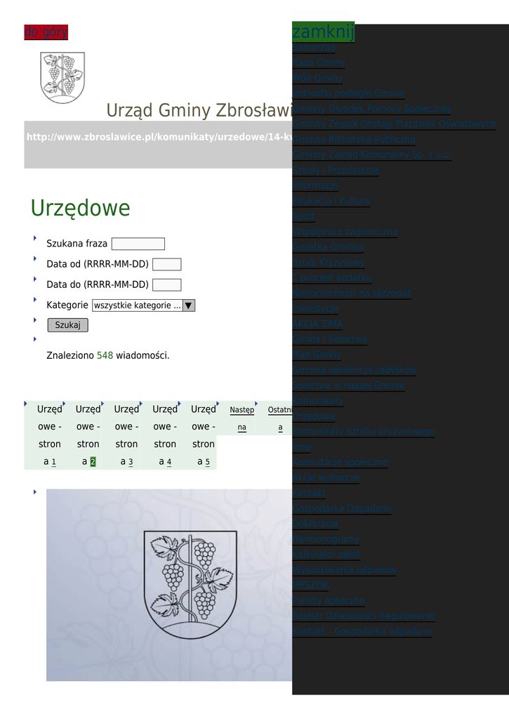 zamknij do góry Samorząd Rada Gminy Wójt Gminy Jednostki podległe Gminie Gminny Ośrodek Pomocy Społecznej Urząd Gminy Zbrosławice Gminny Zespół Obsługi Placówek Oświatowych http://www.zbroslawice.pl/komunikaty/urzedowe/14-kwietnia-przetarg-na-nieruchomosci-Pt/ Gminna Biblioteka Publiczna printpdf/st:2 Gminny Zakład Komunalny Sp. z o.o. Szkoły i Przedszkola Informacje Urzędowe Edukacja i Kultura Sport Współpraca zagraniczna Szukana fraza Gazetka Gminna Data od (RRRR-MM-DD) Sztab Kryzysowy 1 procent podatku Data do (RRRR-MM-DD) Nieruchomości na sprzedaż Kategorie wszystkie kategorie ... ▼ Inwestycje AKCJA ZIMA Szukaj Gmina i Sołectwa Plan Gminy Znaleziono 548 wiadomości. Gminna ewidencja zabytków Sołectwa w naszej Gminie Komunikaty Urzęd Urzęd Urzęd Urzęd Urzęd Następ Ostatni owe - owe - owe - owe - owe - na a stron stron stron stron stron a3 a4 a5 a1 a 2 Urzędowe Komunikaty Sztabu kryzysowego Inne Konsultacje społeczne Akcje wyborcze Kontakt Gospodarka Odpadami Deklaracja Harmonogramy Kalkulator opłat Wyszukiwarka odpadów MPSZOK Punkty Apteczne Rejestr Działalności Regulowanej Kontakt - Gospodarka odpadami 26 WRZ 2016 INFORMACJA - SPADEK CIŚNIENIA WODY W MIEDARACH kategoria: Aktualności Zakład Gospodarki Komunalnej i Mieszkaniowej w Zbrosławicach zawiadamia, że w dniach: 27 i 28.09.2016 w godzinach od 9 00 w dniu 27.09-2016 do godziny 17 00 w dniu 28.09.2016 wystąpi spadek ciśnienia wody na sieci z powodu prac na ujęciu wody. 23 WRZ 2016 Bezpłatne badania profilaktyczne USG piersi kategoria: Aktualności Dla kobiet z terenu Gminy Zbrosławice w wieku od 20 do 49 roku życia (rocznik:1967-1996) 21 WRZ 2016 Sprzedzaż nieruchomości - w Łubiu i Szałszy kategoria: Aktualności W dniu 27 października 2016r. w Centrum Usług Publicznych w Zbrosławicach, przy ul. Oświęcimskiej 2, rozpocznie się pierwszy ustny przetarg nieograniczony na sprzedaż prawa własności nieruchomości gruntowych niezabudowanych położonych w obrębie Łubie (k.m. 1) określonych następującymi numerami działek: 20 WRZ 2016 kategoria: Szansa na remont łazienki szkolnej w Wieszowie Komunikaty urzędowe Szkoła w Wieszowie przystąpiła do konkursu WZOROWA ŁAZIENKA. Konkurs wygrywa szkoła, która uzyska największą liczbę głosów w głosowaniu internetowym. Przekażcie znajomym i przyjaciołom! Głosujcie na Szkołę w Wieszowie codziennie do 30.10.2016 Link do strony: https://www.wzorowalazienka.pl/ 19 WRZ 2016 Przerwa w dostawie wody w Ptakowicach kategoria: Komunikaty urzędowe Zakład Gospodarki Komunalnej i Mieszkaniowej zawiadamia, że w dniu: 20.09.2016 w godzinach od 8 00 do 15 00 wystąpi przerwa w dostawie wody w Ptakowicach, z powodu prac na sieci wodociągowej. W wyniku wykonywanych prac mogą wystąpić zabrudzenia wody spowodowane zaburzeniami przepływów na sieci. Przepraszamy za utrudnienia. 16 WRZ 2016 kategoria: Zebrania Wiejskie Komunikaty urzędowe Prezentujemy listę pozostałych zebrań wiejskich. 19 września o godz. 18:00 w Kamieńcu (Zespół Szkół Ogólnokształcących w Kamieńcu), 20 września o godz. 18:00 w Karchowicach (Zajaz u Rysia), 21 września o godz. 17:00 w Zawadzie (Plac Zabaw), 21 września o godz. 18:00 w Łubiu (Dom Parafialny), 22 września o godz. 17:45 w Zbrosławicach (Centrum Usług Publicznych), 22 września o godz. 18:00 w 16 WRZ 2016 Działo się! kategoria: Aktualności TRZECIA EDYCJA ŚWIĘTA GMINY ZBROSŁAWICE PRZESZŁA DO HISTORII. BYŁO BARWNIE, RÓŻNORODNIE, TŁOCZNO I UROCZYŚCIE. 09 WRZ 2016 kategoria: Zebrania Wiejskie Komunikaty urzędowe Prezentujemy listę najbliższych zebrań wiejskich. Terminy pozostałych można odszukać w kalendarzu w lewej części strony. 12 września o godz. 18:00 w Boniowicach (Zespół Szkół Ogólnokształcących w Kamieńcu), 13 września o godz. 18:00 w Przezchlebiu (świetlica), 14 września o godz. 18:00 w Łubkach (siedziba Koła Łowieckiego), 15 września o godz. 18:00 w Szałszy (siedziba OSP), 16 września 05 WRZ 2016 Zebrania Wiejskie kategoria: Komunikaty urzędowe Rozpoczął się cykl zebrań wiejskich w sołectwach Gminy Zbrosławice, których głównym celem będzie rozdysponowanie funduszu sołeckiego na rok 2017. Za nami zebrania w Świętoszowicach i Ziemięcicach, a w tym tygodniu odbędzie się pięć kolejnych spotkań: 5 września o godz. 18:00 w Księżym Lesie (siedziba OSP), 6 września o godz. 18:00 w Miedarach (świetlica), 7 września o godz. 18:00 w Jasionie 02 WRZ 2016 kategoria: Opóźnienie w wydawaniu kart śKUP Komunikaty urzędowe W związku z kłopotami technicznymi wynikającymi z przyłączenia MZKP do systemu ŚKUP nastąpiło opóźnienie w wydawaniu przez MZKP kart ŚKUP z biletem szkolnym dla uczniów szkół podstawowych i gimnazjów zlokalizowanych na terenie gmin należących do MZKP. W związku z powyższym Dyrekcja MZKP informuje, że uczniowie ww. szkół będą mogli korzystać od 1.09.2016r do 16.09.2016r z przejazdów komunikacją miejską na trasie Urzęd Urzęd Urzęd Urzęd Urzęd Następ Ostatni owe - owe - owe - owe - owe - na a stron stron stron stron stron a3 a4 a5 a1 a 2