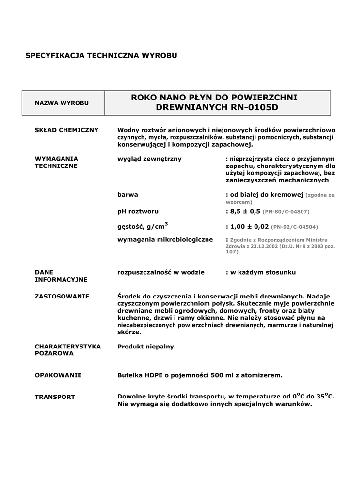SPECYFIKACJA TECHNICZNA WYROBU NAZWA WYROBU ROKO NANO PŁYN DO POWIERZCHNI DREWNIANYCH RN-0105D SKŁAD CHEMICZNY Wodny roztwór anionowych i niejonowych środków powierzchniowo czynnych, mydła, rozpuszczalników, substancji pomocniczych, substancji konserwującej i kompozycji zapachowej. WYMAGANIA TECHNICZNE wygląd zewnętrzny : nieprzejrzysta ciecz o przyjemnym zapachu, charakterystycznym dla użytej kompozycji zapachowej, bez zanieczyszczeń mechanicznych barwa : od białej do kremowej (zgodna ze wzorcem) pH roztworu gęstość, g/cm : 8,5 ± 0,5 (PN-80/C-04807) 3 wymagania mikrobiologiczne : 1,00 ± 0,02 (PN-92/C-04504) : Zgodnie z Rozporządzeniem Ministra Zdrowia z 23.12.2002 (Dz.U. Nr 9 z 2003 poz. 107) DANE INFORMACYJNE rozpuszczalność w wodzie : w każdym stosunku ZASTOSOWANIE Środek do czyszczenia i konserwacji mebli drewnianych. Nadaje czyszczonym powierzchniom połysk. Skutecznie myje powierzchnie drewniane mebli ogrodowych, domowych, fronty oraz blaty kuchenne, drzwi i ramy okienne. Nie należy stosować płynu na niezabezpieczonych powierzchniach drewnianych, marmurze i naturalnej skórze. CHARAKTERYSTYKA POŻAROWA Produkt niepalny. OPAKOWANIE Butelka HDPE o pojemności 500 ml z atomizerem. TRANSPORT Dowolne kryte środki transportu, w temperaturze od 0 C do 35 C. Nie wymaga się dodatkowo innych specjalnych warunków. o o WARUNKI MAGAZYNOWANIA Zamknięte opakowania w suchych i krytych pomieszczeniach, w DANE Produkt nietoksyczny. o o temperaturze od 5 C do 35 C. Chronić przed zamarznięciem. TOKSYKOLOGICZNE OBJAWY I ZATRUCIA OKRES WAŻNOŚCI Nie stwierdzono. Okres trwałości wynosi 2 lata, licząc od daty wyprodukowania. Po tym okresie może być stosowany po sprawdzeniu zgodności parametrów z wymaganiami technicznymi. NUMER STW: 039/A WYDANIE 01 DATA 12.08.2012