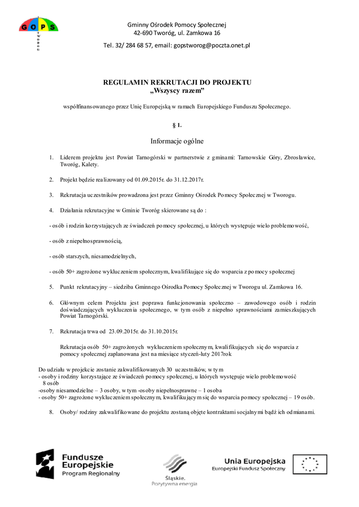 Gminny Ośrodek Pomocy Społecznej 42-690 Tworóg, ul. Zamkowa 16 Tel. 32/ 284 68 57, email: [email protected] REGULAMIN REKRUTACJI DO PROJEKTU „Wszyscy razem” współfinans owanego przez Unię Europejską w ramach Eu ropejskiego Funduszu Społecznego. § 1. Informacje ogólne 1. Liderem projektu jest Powiat Tarnogórski w partnerstwie z g minami: Tarnowskie Góry, Zbrosławice, Tworóg, Kalety. 2. Projekt będzie rea lizowany od 01.09.2015r. do 31.12.2017r. 3. Rekrutacja uc zestników prowadzona jest przez Gminny Ośrodek Po mocy Społec znej w Tworogu. 4. Działania rekrutacyjne w Gminie Tworóg skierowane są do : - os ób i rodzin ko rzystających ze świadczeń po mocy społecznej, u których występuje wielo problemo wość, - osób z niepełnosprawnością, - osób starszych, niesamodzielnych, - osób 50+ zagrożone wykluczeniem społecznym, kwalifikujące się do wsparcia z po mocy społecznej 5. Punkt rekrutacyjny – siedziba Gminnego Ośrodka Pomocy Społec znej w Tworogu ul. Zamkowa 16. 6. Głó wnym celem Projektu jest poprawa funkcjonowania społeczno – zawodowego osób i rodzin doś wiadczających wykluczen ia społecznego, w tym osób z niepełno sprawnościami zamieszkujących Powiat Tarnogórski. 7. Rekrutacja trwa od 23.09.2015r. do 31.10.2015r. Rekrutacja osób 50+ zagro żonych wykluczeniem społeczny m, kwalifikujących się do wsparcia z pomocy społecznej zaplanowana jest na miesiące styczeń-luty 2017rok Do udziału w projekcie zos tanie zakwalifikowanych 30 uczestników, w ty m - osoby i rodziny korzys tające ze świadczeń po mocy społecznej, u których wys tępuje wielo problemo wość 8 osób -osoby niesamodzielne – 3 osoby, w tym -os oby niepełnosprawne – 1 osoba - osoby 50+ zagrożone wykluczeniem społeczny m, kwalifiku jący m się do wsparcia po mocy społecznej – 19 osób. 8. Osoby/ rodziny zakwalifiko wane do projektu zostaną objęte kontraktami socjalny mi bądź ich od mianami. Gminny Ośrodek Pomocy Społecznej 42-690 Tworóg, ul. Zamkowa 16 Tel. 32/ 284 68 57, email: [email protected] § 2. Kryteri a uczestnictwa w Projekcie. 1. Uczestnikiem projektu może zos tać osoba mieszkająca na terenie Gminy Tworóg. 2. Projekt jest adresowany do osób, które spełniają jedno z poniższych kryteriów: - os oby lub rodziny korzys tające ze świadczeń pomocy społecznej, u których występuje wielo problemo wość - niepełnosprawnoś ć, - długotrwała choroba - koniec znoś ć wsparcia ze strony osób drugich - koniec zność zagospodarowania czasu wolnego - brak zatrudnienia (dot. 1 osoby niepełnosprawnej w wieku aktywności zawodowej), - Brak zagos podarowania czasu wo lnego, samotnoś ć, wykluczen ie społeczne. 3. Wypełnione ankiety rekrutacyjne należy złożyć ww. punkcie rekrutacyjnym w n ieprzekraczalny m termin ie do 31.10.2015r.. 4. Rekrutacja dla osób 50+ przewidziana jest w 2017r. - Wypełnione ankiety rekrutacyjne należy zło żyć w w/ punkcie rekrutacyjnym w n ieprzekraczalny m termin ie do 28.02.2017r.. 5. Osoby spełniające powyższe kryteria będą kwalifiko wane do udziału w projekcie przez ko misję rekrutacyjną po dokonaniu weryfikacji an kiet rekrutacyjnych. 6. Osoby zakwalifiko wane do udziału w projekcie zostaną poinformowane o ty m przez praco wnika jednostki.