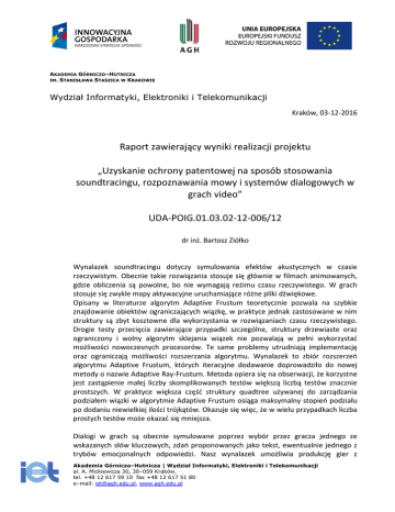 AKADEMIA GÓRNICZO–HUTNICZA IM. STANISŁAWA STASZICA W KRAKOWIE Wydział Informatyki, Elektroniki i Telekomunikacji Kraków, 03-12-2016 Raport zawierający wyniki realizacji projektu „Uzyskanie ochrony patentowej na sposób stosowania soundtracingu, rozpoznawania mowy i systemów dialogowych w grach video” UDA-POIG.01.03.02-12-006/12 dr inż. Bartosz Ziółko Wynalazek soundtracingu dotyczy symulowania efektów akustycznych w czasie rzeczywistym. Obecnie takie rozwiązania stosuje się głównie w filmach animowanych, gdzie obliczenia są powolne, bo nie wymagają reżimu czasu rzeczywistego. W grach stosuje się zwykle mapy aktywacyjne uruchamiające różne pliki dźwiękowe. Opisany w literaturze algorytm Adaptive Frustum teoretycznie pozwala na szybkie znajdowanie obiektów ograniczających wiązkę, w praktyce jednak zastosowane w nim struktury są zbyt kosztowne dla wykorzystania w rozwiązaniach czasu rzeczywistego. Drogie testy przecięcia zawierające przypadki szczególne, struktury drzewiaste oraz ograniczony i wolny algorytm sklejania wiązek nie pozwalają w pełni wykorzystać możliwości nowoczesnych procesorów. Te same problemy utrudniają implementację oraz ograniczają możliwości rozszerzania algorytmu. Wynalazek to zbiór rozszerzeń algorytmu Adaptive Frustum, których iteracyjne dodawanie doprowadziło do nowej metody o nazwie Adaptive Ray-Frustum. Metoda opiera się na obserwacji, że korzystne jest zastąpienie małej liczby skomplikowanych testów większą liczbą testów znacznie prostszych. W praktyce większa część struktury quadtree używanej do zarządzania podziałem wiązki w algorytmie Adaptive Frustum osiąga maksymalny stopień podziału po dodaniu niewielkiej ilości trójkątów. Okazuje się więc, że w wielu przypadkach liczba prostych testów może okazać się mniejsza. Dialogi w grach są obecnie symulowane poprzez wybór przez gracza jednego ze wskazanych słów kluczowych, zdań proponowanych jako tekst, ewentualnie jednego z trybów emocjonalnych odpowiedzi. Nasz wynalazek umożliwia produkcję gier z Akademia Górniczo–Hutnicza | Wydział Informatyki, Elektroniki i Telekomunikacji al. A. Mickiewicza 30, 30–059 Kraków, tel. +48 12 617 59 10 fax +48 12 617 51 80 e–mail: [email protected], www.agh.edu.pl możliwością symulacji dialogu w formie mowy, usuwając w ten sposób ograniczenie w postaci konieczności prowadzenia dialogu w postaci gotowych zdań. Wynalazek dotyczy programu kontrolującego sposób prowadzenia dialogów i łączącego je z fabułą gry tworzoną przez scenarzystę i metod utrzymywania głównego scenariusza gry z udziałem zachowań gracza. Gracz musi dostrzegać swój wpływ na świat gry, ale system sterujący grą nie może spowodować, aby narracja odsunęła się za bardzo od głównych wydarzeń, gdyż doprowadziłoby to w efekcie do jego znudzenia. Możliwych jest oczywiście kilka równoległych linii narracji. W podobny sposób konieczne jest zarządzanie dialogami. Z punktu widzenia gracza mają robić wrażenie, że może mówić cokolwiek, a bohater niezależny reaguje zawsze inaczej i całkowicie na podstawie jego wypowiedzi. Jednakże w praktyce musi być utrzymywany graf możliwego rozwoju rozmowy, ze względu na konieczność utrzymania linii fabularnej, konieczność uwzględnienia w fabułę z góry ustalonych wypowiedzi oraz dostosowania systemu do bazy nagranych linii dialogowych. „System and a method for determining approximate set of visible objects in beam tracing” - przygotowano, dokonano i obsłużono zgłoszenia patentowe w następujących urzędach: • w Kanadzie, W dniu 27.11.2013 dokonano zgłoszenia patentowego wynalazku pt. „System and a method for determining approximate set of visible objects in beam tracing” na terenie Kanady. Zgłoszenie otrzymało nr CA 2 835 490. Zgłoszenie opublikowano dnia 27.05.2015. Wnoszono coroczne opłaty za utrzymanie zgłoszenia. Zgłoszenie oczekuje na złożenie wniosku o badanie. • w USA W dniu 28.11.2013 dokonano zgłoszenia patentowego wynalazku pt. „System and a method for determining approximate set of visible objects in beam tracing” na terenie USA bazując na pierwszeństwie ze zgłoszenia kanadyjskiego CA 2 835 490. Zgłoszenie otrzymało nr 14/092,971. Zostało opublikowane dnia 28.05.2015 pod nr US20150146877A1. Oczekuje na badanie. • Japonii W dniu 04.12.2013 dokonano zgłoszenia patentowego wynalazku pt. „System and a method for determining approximate set of visible objects in beam tracing” na terenie Japonii bazując na pierwszeństwie ze zgłoszenia kanadyjskiego CA2835490. Zgłoszenie otrzymało nr JP 2013-250903. Zostało opublikowane dnia 11.06.2015 Oczekuje na badanie. • w trybie europejskim przed EPO Akademia Górniczo–Hutnicza | Wydział Informatyki, Elektroniki i Telekomunikacji al. A. Mickiewicza 30, 30–059 Kraków, tel. +48 12 617 59 10 fax +48 12 617 51 80 e–mail: [email protected], www.agh.edu.pl W dniu 26.11.2014 dokonano zgłoszenia patentowego wynalazku pt. „System and a method for determining approximate set of visible objects in beam tracing” przed EPO bazując na pierwszeństwie ze zgłoszenia kanadyjskiego CA2835490. Zgłoszenie otrzymało nr 14003975.1 Zostało opublikowane dnia 03.06.2015 pod nr EP2879409. Otrzymano europejski raport z poszukiwań z uwagami eksperta. Odpowiedź na te uwagi zostanie złożona z zachowaniem terminu 03.12.2015. “A system and a method for providing a dialog with a user” - przygotowano, dokonano i obsłużono zgłoszenia patentowe w następujących urzędach: • w Kanadzie, W dniu 27.11.2013 dokonano zgłoszenia patentowego wynalazku pt. “A system and a method for providing a dialog with a user” na terenie Kanady. Zgłoszenie otrzymało nr CA2835368. Zgłoszenie opublikowano dnia 27.05.2015. Wnoszono coroczne opłaty za utrzymanie zgłoszenia. Zgłoszenie oczekuje na złożenie wniosku o badanie. • w USA W dniu 28.11.2013 dokona