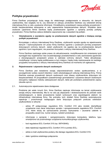 Polityka prywatności Firma Danfoss przywiązuje dużą wagę do właściwego postępowania w stosunku do danych użytkownika, bez względu na to, czy dokonał on zakupu produktów Danfoss czy odwiedził stronę internetową firmy w celu uzyskania informacji. Chcielibyśmy przedstawić naszą politykę prywatności i środki bezpieczeństwa stosowane w celu zapewnienia bezpieczeństwa danych. Wszelkie dane osobowe ujawnione firmie Danfoss będą przetwarzane zgodnie z opisaną poniżej polityką prywatności. Firma Danfoss zaleca dokładne zapoznanie się z zasadami tej polityki. 1. Oświadczenie o wyrażeniu zgody na przetwarzanie danych zgodnie z bieżącą wersją polityki prywatności Korzystając z witryny internetowej firmy Danfoss, użytkownik wyraża zgodę na rejestrowanie danych i wykorzystywanie ich przez firmę Danfoss zgodnie z podanymi poniżej przepisami dotyczącymi ochrony danych. Jeżeli użytkownik nie zgadza się na przetwarzanie danych zgodnie z tymi regulacjami, nie powinien korzystać z witryny internetowej firmy Danfoss. Firma Danfoss zastrzega sobie prawo do aktualizowania, modyfikowania lub zmieniania tych wymagań bez wyjaśnienia i bez wcześniejszego powiadomienia w celu zachowania zgodności z obowiązującymi przepisami prawa w zakresie ochrony danych. Takie aktualizacje, modyfikacje i zmiany będą publikowane w tym miejscu i będą miały zastosowanie do każdego przypadku korzystania z witryny internetowej firmy Danfoss od momentu ich ogłoszenia. 2. Rejestrowanie i używanie danych osobowych Firma Danfoss jest świadoma swojej odpowiedzialności wobec społeczeństwa, a w szczególności wobec swoich klientów i osób odwiedzających witrynę internetową firmy. Firma Danfoss szanuje prywatność danych osobowych oraz obawy użytkowników dotyczące ich bezpieczeństwa. W przypadkach uzasadnionego gromadzenia i używania danych osobowych stosujemy najlepsze metody zabezpieczeń danych, takie jak podwójne potwierdzenie zapisu (double opt-in). 2.1. Automatycznie rejestrowane dane dostępowe Podobnie jak wiele innych firm, firma Danfoss zapisuje informacje na temat użytkowania swojej witryny internetowej. Ma to na celu jej ulepszanie i dostosowywanie do potrzeb osób odwiedzających, a także prowadzenie badań rynkowych oraz zapobieganie atakom na infrastrukturę internetową firmy. Na potrzeby tych działań firma Danfoss automatycznie rejestruje i przechowuje następujące dane dotyczące połączeń podczas odwiedzin użytkowników w witrynie: − adres IP połączonego regulatora ECL Comfort 310 jako środek identyfikacji urządzenia oraz dane dotyczące sprzętu i oprogramowania regulatora ECL Comfort 310, które służą do uproszczenia procesu wykrywania i usuwania usterek w przypadku awarii (np. numer seryjny, tydzień produkcji); − informacje o sprzęcie i oprogramowaniu dotyczące komputera, telefonu typu smartphone lub przenośnego urządzenia komunikacyjnego użytkownika; − kod regulatora ECL Comfort 310 (np. 087H3040); − data rejestracji regulatora ECL Comfort 310 w portalu ECL; − adres e-mail użytkownika podany dla danego regulatora ECL Comfort 310; − data i godzina ostatniego połączenia. www.danfoss.com VJ.HX.A1.49 03/2013 2.2. Inne dane osobowe, które mogą być rejestrowane Inne dane osobowe i biznesowe dotyczące użytkowników będą zapisywane tylko po wyrażeniu zgody na ich rejestrację przez użytkownika, np. podczas rejestracji w portalu ECL. Wszystkie te dane są zapisywane, przetwarzane i wykorzystywane wyłącznie w zakresie koniecznym dla realizacji danego celu lub za zgodą użytkownika (np. w celu rejestracji lub udzielenia odpowiedzi na zapytanie). Dane użytkownika będą przechowywane tylko przez okres wymagany do realizacji danego celu lub, jeśli wymaga tego prawo, przez okres określony w statucie. Dane użytkowników nie będą koordynowane z automatycznie rejestrowanymi danymi dostępowymi. 2.3. Rejestracja w portalu ECL i korzystanie z usług Podczas rejestracji w portalu ECL użytkownik jest proszony o podanie danych osobowych, takich jak imię, nazwisko, adres, adres e-mail, zawód i inne opcjonalne informacje. Dane te są używane w celu świadczenia usług ECL Portal, wystawiania faktur, zapewnienia zgodności z wymogami prawnymi lub urzędowymi, prowadzenia rejestrów baz danych i klientów, realizacji wsparcia technicznego i serwisu, analizowania rozwoju firmy i produktów oraz w celach marketingowych dotyczących towarów i usług firmy Danfoss. W razie konieczności użytkownik może w każdej chwili zmienić lub usunąć podane informacje, jednak usunięcie danych niezbędnych do rejestracji będzie pociągać za sobą brak możliwości uzyskania dostępu do portalu ECL. Podczas korzystania z usług ECL Portal automatycznie zapisywane są następujące informacje: - adres IP połączonego regulatora ECL Comfort 310 jako środek identyfikacji urządzenia; - dane sprzętowe dotyczące regulatora ECL Comfort 310, które służą uproszczeniu procesu wykrywania i usuwania usterek w przypadku awarii (np. numer seryjny, tydzień produkcji); - wszystkie odczyty czujników wyświetlane w portalu ECL, takie jak temperatura, ciśnienie, częstotliwość użycia (czas i ilość) oraz zużycie energii. Dane dotyczące zużycia energii są przechowywane przez pięć lat. Pozostałe wyniki pomiarów czujników są przechowywane przez trzy miesiące. Użytkownik otrzyma dane dostępowe umożliwiające korzystanie z portalu ECL, na które składają się adres e-mail oraz hasło. Informacje te należy przechowywać w bezpiecznym miejscu. Należy pamiętać, że ujawnienie swoich danych dostępowych w celu umożliwienia osobie trzeciej uzyskania dostępu do informacji na temat regulatora ECL Comfort 310 oznacza także udostępnienie tym osobom także innych swoich danych. Firma Danfoss nie ponosi żadnej odpowiedzialności za skutki udostępnienia osobie trzeciej danych użytkownika wynikającego z ujawnienia