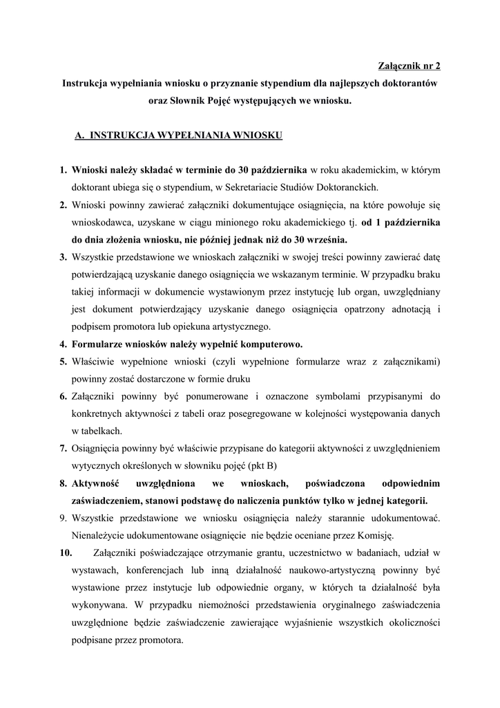 Załącznik nr 2 Instrukcja wypełniania wniosku o przyznanie stypendium dla najlepszych doktorantów oraz Słownik Pojęć występujących we wniosku. A. INSTRUKCJA WYPEŁNIANIA WNIOSKU 1. Wnioski należy składać w terminie do 30 października w roku akademickim, w którym doktorant ubiega się o stypendium, w Sekretariacie Studiów Doktoranckich. 2. Wnioski powinny zawierać załączniki dokumentujące osiągnięcia, na które powołuje się wnioskodawca, uzyskane w ciągu minionego roku akademickiego tj. od 1 października do dnia złożenia wniosku, nie później jednak niż do 30 września. 3. Wszystkie przedstawione we wnioskach załączniki w swojej treści powinny zawierać datę potwierdzającą uzyskanie danego osiągnięcia we wskazanym terminie. W przypadku braku takiej informacji w dokumencie wystawionym przez instytucję lub organ, uwzględniany jest dokument potwierdzający uzyskanie danego osiągnięcia opatrzony adnotacją i podpisem promotora lub opiekuna artystycznego. 4. Formularze wniosków należy wypełnić komputerowo. 5. Właściwie wypełnione wnioski (czyli wypełnione formularze wraz z załącznikami) powinny zostać dostarczone w formie druku 6. Załączniki powinny być ponumerowane i oznaczone symbolami przypisanymi do konkretnych aktywności z tabeli oraz posegregowane w kolejności występowania danych w tabelkach. 7. Osiągnięcia powinny być właściwie przypisane do kategorii aktywności z uwzględnieniem wytycznych określonych w słowniku pojęć (pkt B) 8. Aktywność uwzględniona we wnioskach, poświadczona odpowiednim zaświadczeniem, stanowi podstawę do naliczenia punktów tylko w jednej kategorii. 9. Wszystkie przedstawione we wniosku osiągnięcia należy starannie udokumentować. Nienależycie udokumentowane osiągnięcie nie będzie oceniane przez Komisję. 10. Załączniki poświadczające otrzymanie grantu, uczestnictwo w badaniach, udział w wystawach, konferencjach lub inną działalność naukowo-artystyczną powinny być wystawione przez instytucje lub odpowiednie organy, w których ta działalność była wykonywana. W przypadku niemożności przedstawienia oryginalnego zaświadczenia uwzględnione będzie zaświadczenie zawierające wyjaśnienie wszystkich okoliczności podpisane przez promotora. 11. Za zaświadczenie potwierdzające publikacje uznaje się: a) W przypadku artykułów i monografii opublikowanych: kopię okładki publikacji, spisu treści z nazwiskiem autora i tytułem artykułu oraz pierwszej stronę artykułu, należy również podać numer ISBN lub ISSN b) W przypadku artykułów i monografii nieopublikowanych: zaświadczenie o przyjęciu do druku, podpisane i opieczętowane przez odpowiednią instytucję c) W przypadku katalogu zbiorowego: kopię okładki publikacji, strony redakcyjnej oraz stron zawierających dzieła wnioskodawcy, należy również podać numer ISBN lub ISSN d) w przypadku katalogu indywidualnego: kopię okładki publikacji, strony redakcyjnej zawierającej imię i nazwisko autora, należy również podać numer ISBN lub ISSN 12. W przypadku prezentacji twórczości/sylwetki twórcy w telewizji należy dołączyć materiał filmowy nagrany na płycie CD/DVD lub materiał zdjęciowy (zdjęcia poklatkowe) dokumentujące prezentacje wraz z pisemnym potwierdzeniem jej przez promotora lub osobę współtworzącą materiał prezentacji. 13. W przypadku prezentacji twórczości/sylwetki twórcy w prasie należy dołączyć kopię tejże prezentacji oraz kopię okładki wydawnictwa i strony redakcyjnej. 14. W przypadku współpracy z instytucjami należy przedstawić zaświadczenie wydane przez instytucje określające sposób współpracy wnioskodawcy. W przypadku działalności w samorządzie należy przestawić zaświadczenie wydane przez Kierownika Studiów Doktoranckich określające charakter pełnionej działalności. 15. Wszelkie publikacje i osiągnięcia można wykazywać tylko jeden raz w roku akademickim. 16. Zaświadczenia dokumentujące aktywność wnioskodawcy wystawione w językach obcych powinny zostać opatrzone adnotacją w języku polskim sporządzoną przez opiekuna lub promotora, która będzie zawierać informacje o rodzaju poświadczanej aktywności, czasie jej trwania oraz formie uczestnictwa doktoranta. B. SŁOWNIK POJĘĆ WYSTĘPUJĄCYCH WE WNIOSKU MIĘDZYNARODOWA (konferencja, sympozjum, warsztat, plener, kurs mistrzowski, festiwal) - wydarzenie w którym co najmniej 1/ 3 czynnych uczestników prezentujących referaty reprezentowała zagraniczne ośrodki naukowe. KRAJOWA (konferencja, sympozjum, warsztat, plener, kurs mistrzowski, festiwal) - za wydarzenie o znaczeniu krajowym, uważa się takie, w którym brali udział uczestnicy z co najmniej pięciu różnych ośrodków akademickich, naukowych lub artystycznych REGIONALNA (konferencja, sympozjum, warsztat, plener, kurs mistrzowski, festiwal) - za wydarzenie o znaczeniu regionalnym, uważa się takie, w którym brali udział uczestnicy z nie więcej niż dwóch ośrodków akademickich, naukowych lub artystycznych oraz wydarzenia uczelniane, również wydarzenia zagraniczne o niskiej randze ARTYKUŁ - recenzowany artykuł wydany w punktowanym czasopiśmie naukowym lub w monografii zbiorowej , posiadające numer ISBN lub ISSN, liczące minimum 20 tys. znaków typograficznych, czyli około 0,5 arkusza wydawniczego. MONOGRAFIA - wydawnictwa wydane przez wydawcę lub nakładem własnym autora, posiadające numer ISBN lub ISSN liczące conajmniej 6 arkuszy wydawniczych, zawiera bibliografię naukową, przedstawia dane zagadnienie w sposób oryginalny i twórczy. KONKURS O ZASIĘGU MIĘDZYNARODOWYM - konkurs zorganizowany przez znaczące ośrodki i instytucje odznaczające się uznaniem w środowisku artystycznym/naukowym (uznane galerie, muzea, ośrodki naukowe, organizacje) w którym udział brali artyści z co najmniej trzech różnych państw KONKURS O ZASIĘGU KRAJOWYM - konkurs zorganizowany przez znaczące ośrodki i ins
