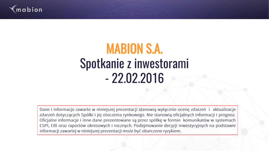 MABION S.A. Spotkanie z inwestorami - 22.02.2016 LEKI BIOPODOBNE - NOWY, DYNAMICZNIE ROSNĄCY RYNEK „Biosimilars and Follow-onBiologics Market to Hit $35 Billion Globally by 2020” Allied Market Research Aug 28, 2015 „The global biosimilars market is expected to reach $35 billion by 2020 from the estimated $1.3 billion in 2013, according to a new report by Allied Market Research titled. This growth is said to be driven by the deeper penetration of biosimilars in developed and emerging markets as a result of clearer regulatory pathways. The next four years will see more than 10 blockbuster biologic drugs with annual sales of $60 billion facing patent expiries in Europe and the United States” UE US Ścieżka regulacyjna Tak (od dekady) Tak (od 2015) Dopuszczone do obrotu leki I generacji – Tak Mabs - Tak I generacji – Tak Mabs - preapproval Wsparcie „health economics” Uzależnione od kraju, zmieniające się pozytywnie Pozytywne sygnały ze strony regulatorów LEKI BIOPODOBNE - NOWY, DYNAMICZNIE ROSNĄCY RYNEK „Biosimilars and Follow-onBiologics Market to Hit $35 Billion Globally by 2020” Allied Market Research Aug 28, 2015 „The global biosimilars market is expected to reach $35 billion by 2020 from the estimated $1.3 billion in 2013, according to a new report by Allied Market Research titled. This growth is said to be driven by the deeper penetration of biosimilars in developed and emerging markets as a result of clearer regulatory pathways. The next four years will see more than 10 blockbuster biologic drugs with annual sales of $60 billion facing patent expiries in Europe and the United States” INFLECTRA (biopodobny infliximab) – success story Udział w rynku w 2-gim roku: od kilkunastu do 50% Średnia erozja ceny : 30-40% Wstępny „preapproval przez FDA” MabionCD20 Biopodobny rituximab Wielu zaczynało – tylko kilku skończy Mabthera, dane sprzedaży za 2015 Żródło: Roche annual report 2015 Pomimo wprowadzania wielu leków o nowym mechanizmie działania RZS Nowotwory krwi Mechanizm Lek Bruton KI Imbruvica (ibrutinib) Pi3Kdelta Zydelig (idelalisib) Alkylation Treanda Bendamustine Sprzedaż 2015 Zarejestrowana Wskazania 754 mln USD, 2015 343 mln USD (IVq, 2015) - MCL relapsed / refractory - CLL second line, first line when 17p/53 mutation 132 mln USD, 2015 (> +700% a/a) Approx. 800 mln USD, 2015 - CLL second line in combination with rituximab - CLL 17p/53 mutation first line in combination with rituximab - CLL - NHL second line after progression on rituximab Mechanizm Lek Sprzedaż 2015 Zarejestrowana wskazania IL-6 Actemra/Roactemra (tocilizumab) 1432 mln USD (+23% a/a) RZS średnia do ciężkiej postaci w kombinacji z MTX lub innym DMARDS Jak-Stat Xeljanz (tofacitinib) 172 mln USD Tylko US: RZS średnia do ciężkiej postaci CD28 blocker Orencia (abatacept) 1885 mln USD (+14% a/a) RZS w kombinacji z MTX Żródła: Roche annual report 2015, Gileas Sciences annual report 2015, BMS annual report 2015, Teva IVq results 2015, Pfizer annual report 2015, www, medicines .org.com Konkurencja dla biopodobnego Rituximabu Program kliniczny wykazujący równoważność – podstawą zatwierdzenia leku biopodobnego Wielkość programów klinicznych: Postęp programów klinicznych: skrinowanych 624 kończących R e z S u s p R e z Minimalna liczba pacjentów dla Uzyskania wyników równoważności (alpha 0,05; Beta – 0,2; clinically relevant margin) Żródło: Memorandum Plexus Venture, 2015 prezentowane w trakcie JP Morgan Conference, San Francisco 2016 POSTĘP PRAC KLINICZNYCH- MabionCD20- 001RA Aktualny Stan badania Klinicznego (koniec stycznia 2016) Ilość pacjentów zrekrutowanych w ośrodkach polskich od momentu wznowienia rekrutacji POSTĘP PRAC KLINICZNYCH- MabionCD20- 001RA Rekrutacja pacjentów PK/PD: Ilość pacjentów PK/PD w badaniu MabionCD20-001RA Aktualna 88 Wymagana 126 Pozostała 38 POSTĘP PRAC KLINICZNYCH- MabionCD20- 001RA Plany rekrutacyjne dla badania MabionCD20-001RA-Polska: MabionCD20-001RA Recrutiment Projection Scenario Number of patients included 120 100 80 60 40 20 0 Dec 2015 Jan 2016 Feb 2016 March 2016 Apr 2016 May 2016 Jun 2016 POSTĘP PRAC KLINICZNYCH- MabionCD20- 001RA MabionCD20-001RA Plany rekrutacyjne dla ukończenia badania MabionCD20-001RA-Total: Number of patients included Recruitment Projection Scenario 180 160 140 120 100 80 60 40 20 0 Ostatni zrekrutowany pacjent POSTĘP PRAC KLINICZNYCH – MabionCD20-002NHL Status submisji : Planowana krzywa rekrutacji : Ostatni zrekrutowany pacjent POSTĘP PRAC KLINICZNYCH – MabionCD20-002NHL Jak chcemy przyśpieszyć tempo rekrutacji w badaniu NHL: • • • • Organizacja spotkań z badaczami Możliwość zwiększenia wynagrodzeń dla Badaczy Bezpośredni kontakt z badaczami w badaniu Powtórzenie procesu feasibillity- poszukiwanie dodatkowych ośrodków zainteresowanych realizacją projektu MabionCD20- 002NHL - 2 nowe ośrodki spośród 19 kontaktowanych wykazały zainteresowanie realizacją projektu MabionCD20- 002NHL • Newslettery i listy motywacyjne kierowane do badaczy • Przyspieszenie terminów wizyt inicjacyjnych w Polsce, Chorwacji Procedura SA (sierpień – listopad 2015): Zakresy tematyczne Potwierdzenie zakresu studium biopodobieństwa + Podejście do leku wytworzonego w skali docelowej vs użycie go w badaniu klinicznym + Potwierdzenie sposobu analizy statystycznej danych z badania klinicznego + Potencjalne rozszerzenie zakresu analizowanych danych w odniesieniu do substytucyjności MabionCD20 i Mabthery + Możliwość redukcji liczby pacjentów włączonych do badania klinicznego w sytuacji, kiedy rzeczywista zmienność danych i moc na statystyczna byłyby bardziej korzystne od zakładanych pierwotnie MabionCD20 Partnering MabionCD20 „VALUE PROPOSITION” for our partners and patients – POTENCJALNIE BARDZIEJ KORZYSTNY PROFIL BEZPIECZEŃSTWA Cechy technologiczne Optymalny poziom ekspresji białka w bioreaktorze - Dobór i ścisła kontrola pH na różnych e