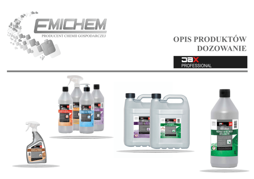 PRODUCENT CHEMII GOSPODARCZEJ OPIS PRODUKTÓW DOZOWANIE Nr 10 Nazwa ODKAMIENIACZ ECO ODKAMIENIACZ PROFI PREPARAT DO ODKAMIENIANIA ekspresów, czajników, zmywarek przemysłowych oraz kotłów Opis produktu Przeznaczenie Usuwa osady mineralne z powierzchni mających kontakt z żywnością, a także plamy Do czyszczenia: po wodzie, zabrudzenia tłuszczowe i pozostałości białek. Środek bezwonny zmywarek, i bezpieczny dla produktów spożywczych, czajników, nie zawiera substancji zapachowych ekspresów do i barwników. kawy i herbaty Skoncentrowany preparat kwasowy przeznaczony do usuwania osadów mineralnych. Regularne stosowanie Do czyszczenia: w przypadku twardej wody zapewnia utrzymanie maksymalnej wydajności maszyn przemysłowych maszyn przez długi czas. Środek bezwonny do mycia naczyń, i bezpieczny dla produktów spożywczych, ekspresów do kawy i herbaty nie zawiera substancji zapachowych i barwników. Oszczędność czasu i niższe zużycie o 20%. 11 Do czyszczenia: ODKAMIENIACZ STRONG Środek silnie skoncentrowany, skutecznie usuwa tłuszcz, osad kamienia oraz resztki spożywcze. Produkt jest przeznaczony do użytku przemysłowego (restauracje, kuchnie przemysłowe, firmy cateringowe, piekarnie itp.) zmywarek podblatowych, kapturowych oraz zmywarek z transportem koszowym i taśmowym; 12 ODTŁUSZCZACZ Należy napełnić zbiorniki myjące 10% roztworem odkamieniacza, a następnie uruchomić urządzenie oraz pompy na 10-15 minut. Po zakończeniu procesu usunąć roztwór, a całe urządzenie dokładnie spłukać czystą wodą. Należy napełnić zbiorniki myjące 10% roztworem odkamieniacza, a następnie uruchomić urządzenie oraz pompy na 10-15 minut. Po zakończeniu procesu usunąć roztwór, a całe urządzenie dokładnie spłukać czystą wodą. odpowiedni do czyszczenia przyborów kuchennych, szkłą, do każdego rodzaju naczyń i sztućców. Do czyszczenia: Preparat szybko przenika tłuszcz, doskonały do gruntownego i codziennego czyszczenia, łatwy w użyciu. Dozowanie/sposób użycia piekarników, grilli, okapów, przewodów wentylacyjnych Spryskać powierzchnię zabrudzoną i poczekać do ok. 4 minut, następnie spłukać wodą. W przypadku filtrów do okapu pozostawić na 30 minut w roztworze wodnym z 10% rozpuszczonego produktu, po czym spłukać. Do pielęgnacji i nabłyszczania: PŁYN DO PIELĘGNACJI I NABŁYSZCZANIA STALI NIERDZEWNEJ Preparat do nabłyszczania i konserwacji powierzchni ze stali szlachetnej, delikatnie usuwa odciski palców, ślady wodne i inne łatwo zmywalne plamy pozostawiając na nich warstwę chroniącą przed ponownym zabrudzeniem. Jest ekonomiczny i łatwy w użyciu. 14 MYDŁO W PŁYNIE Mydło w płynie przeznaczone do codziennego użytu. Oparte na bazie delikatnych środków myjących, które zapobiegają nadmiernemu wysuszaniu skóry. Do mycia rąk Nanieść niewielką ilość płynu bezpośrednio na ręce, namydlić pod strumieniem bieżącej wody i spłukać. 15 MYDŁO ANTYBAKTERYJNE Nie podrażnia skóry; zawarty w kosmetyku środek antybakteryjny jest aktywny przez wiele godzin. Do mycia rąk Nanieść niewielką ilość płynu bezpośrednio na ręce, namydlić pod strumieniem bieżącej wody i spłukać. Produkt posiada bardzo dobre właściwości piorące, świetnie wypłukuje się z tkanin i pozostawia świeży, długotrwały zapach, a dzięki zawartości enzymów chroni włókna tkanin i zapobiega ich mechaceniu, działa już w temperaturze 30 oC Do prania tkanin 1 nakrętkę płynu wlać do pojemnika na płyn/proszek do prania lub bezpośrednio do bębna pralki. (przy więszych zabrudzeniach należy zwięszyć dawkę) PŁYN DO PŁUKANIA Produkt przeznaczony do płukania tkanin, nadaje miękkość i puszystość, pozostawia świeży zapach. Do płukania tkanin 1 nakrętkę płynu wlać do pojemnika na płyn do płukania PŁYN DO MASZYNOWEGO I RĘCZNEGO PRANIA DYWANÓW I TAPICERKI Nowoczesny skoncentrowany preparat przeznaczony zarówno do prania ręcznego jak i maszynowego. Usuwa plamy i neutralizuje zapachy. Dzięki starannie opracowanej formule zapobiega ponownemu zabrudzeniu, chroni kolory i włókna dywanów. 13 PŁYN DO PRANIA 16 (KOLOR/ UNIWERSALNY) 17 20 urządzeń, maszyn oraz stołów wykonanych ze stali nierdzewnej; Przed użyciem preparatu przetrzeć powierzchnię uniwersalnym środkiem czyszczącym, następnie nanieść nierozcieńczony produkt na delikatną ściereczkę lub spryskać bezpośrednio na czyszczoną powierzchnię. Przetrzeć suchą, niestrzępiącą się ściereczką. Nierównomierne powierzchnie (okapy, zmywarki, windy itp.) przecierać zgodnie z kierunkiem ziarna. Produkt nie wymaga spłukiwania. (np. do zmywarek do naczyń, szaf chłodniczych, lad, półek, blaszanych obić drzwiowych wind, kontuarów, naczyń ze stali szlachetnej) Do czyszczenia i pielęgnacji: dywanów, wykładzin, tapicerek Powierzchnię gruntownie odkurzyć, czyścić roztworem 1% lub 2% przy pomocy urządzeń rozpylającoekstrakcyjnych zgodnie z zaleceniami producenta (lub ręcznie). 24 PŁYN DO MYCIA PODŁÓG CERAMICZNYCH Profesjonalny środek do bieżącej pielęgnacji Do mycia: materiałów podłogowych i posadzek odpornych na działanie wody. podłóg, posadzek, Szybko i skutecznie usuwa zabrudzenia materiałów podłogowych, charakterystyczne dla podłóg. Nie pozostawia smug, szybko wysycha i nadaje połysk. Stosować 100-200 ml płynu na 10L wody. Przy lekkich zabrudzeniach rozcieńczać ok. 100 ml, a do silniejszych zabrudzeń stosować roztwór mocniejszy (ok. 200 ml płynu na 10L wody). Do mycia: Specjalnie opracowany skład płynu sprawia, że z łatwością usuwa on odciski palców, brud, zacieki wodne i ślady po insektach pozostawiając lśniące pozbawione smug powierzchnie oraz świeży zapach. Preparat zapobiega ponownemu osadzaniu się kurzu. okien, szyb, szkła, luster, lakierowanego drewna, aluminium, monitorów oraz gładkich powierzchni z tworzyw sztucznych 25 PREPARAT DO MYCIA SZYB I INNYCH POWIERZCHNI GŁ