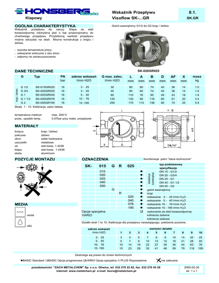 Wskaźnik Przepływu Visoflow SK-...GR Klapowy OGÓLNA CHARAKTERYSTYKA 8.1. SK.GR Gwint wewnętrzny G1/2 do G2 brąz / żeliwo Wskaźnik przepływu do cieczy. Klapa ze stali kwasoodpornej odchylana jest o kąt proporcjonalny do chwilowego przepływu. Przybliżoną wartość przepływu można odczytać na skali. Mocna konstrukcja z brązu i żeliwa. - wysoka temperatura pracy - wskazanie widoczne z obu stron - odporny na zanieczyszczenia DANE TECHNICZNE G Typ SK-020GR025 PN bar brąz / żeliwo G 1/2 16 SK-015GR025 G 3/4 16 SK-020GR025 G1 16 SK-025GR040 G 1 1/2 16 SK-040GR076 SK-050GR195 G2 16 Skala 1 - 10. Kalibracja: patrz tabela. temperatura medium przec. spadek temp. zakres wskazań l/min H2O 33510 - Q max. zalec. l/min H2O L mm A mm B mm D mm AF mm X mm masa kg 30 40 60 120 250 90 90 110 130 170 60 60 76 90 114 74 74 95 116 138 40 40 49 60 80 36 36 43 61 74 14 14 18 20 25 1.0 1.0 1.8 3.4 5.9 25 25 40 76 15 -195 max. 200°C 0.07bar przy maks. przepływie MATERIAŁY korpus pokrywa okno uszczelki oś klapa skala brąz / żeliwo żeliwo szkło hartowane metalowe stal kwas. 1.4436 stal kwas. 1.4436 aluminium POZYCJE MONTAŻU OZNACZENIA Kombinacje: patrz "dane techniczne" typ podstawowy specyfikacje z 015 DN 15 - G1/2 z 020 DN 20 - G3/4 z 025 DN 25 - G1 z 040 DN 40 - G1 1/2 z 050 DN 50 - G2 z gwint wewnętrzny G z brąz R z wskazanie 3 - 25 l/min H2O 025 z wskazanie 5 - 40 l/min H2O 040 z wskazanie 10 - 76 l/min H2O 076 z wskazanie 15 - 195 l/min H2O 195 wykonanie ze stali kwasoodpornej Opcja specjalna kołnierze żeliwne VARIO kołnierze stalowe Działki skali 1 to 10. Kalibracja dla przepływu narastającego, położenie poziome. 015 G R 025 średnica nominalna SK- MEDIA woda olej zakres wskazań l/min H2O 1 2 3 4 3- 25 5- 40 10- 76 15- 195 3 5 10 15 4 7 14 23 5 9 19 29 7 10 22 35 wartości działek 5 6 7 8 13 27 41 9 15 30 46 10 18 36 59 8 9 10 14 21 44 79 20 28 63 118 25 40 76 195 Zastrzega się prawo do zmian technicznych zBASIC Standard BASIC Opcja programowa VARIO Opcja specjalna ⊕ PLUS Wyposażenie przedstawiciel: "ZACH METALCHEM" Sp. z o.o. Gliwice, tel. 032 270 22 62, fax. 032 270 45 28 internet: www.metalchem.pl e-mail: [email protected] nie zalecane 2005-02-25 str. 1 z 1
