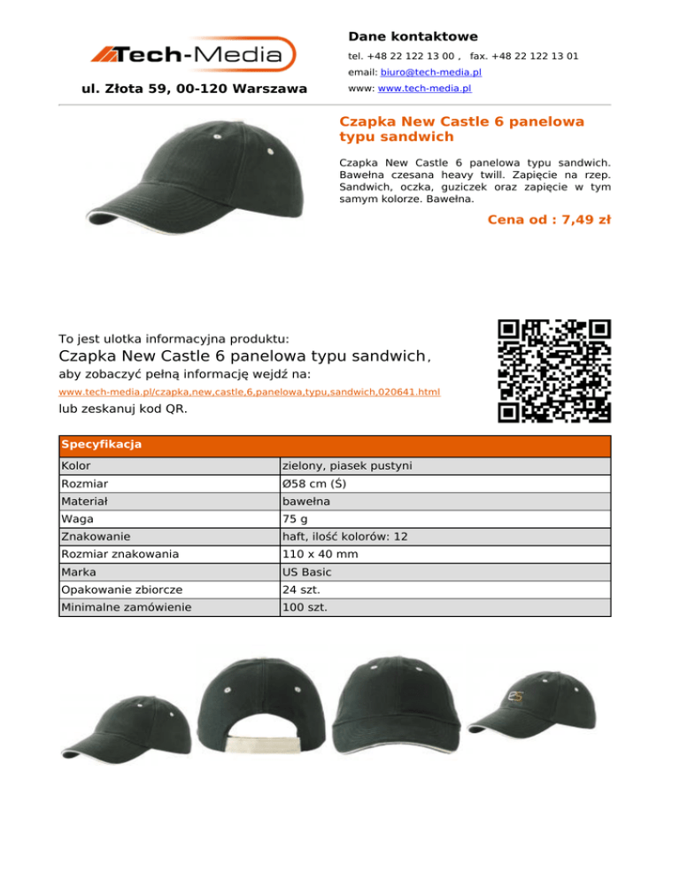 Dane kontaktowe tel. +48 22 122 13 00 , fax. +48 22 122 13 01 email: [email protected] ul. Złota 59, 00-120 Warszawa www: www.tech-media.pl Czapka New Castle 6 panelowa typu sandwich Czapka New Castle 6 panelowa typu sandwich. Bawełna czesana heavy twill. Zapięcie na rzep. Sandwich, oczka, guziczek oraz zapięcie w tym samym kolorze. Bawełna. Cena od : 7,49 zł To jest ulotka informacyjna produktu: Czapka New Castle 6 panelowa typu sandwich , aby zobaczyć pełną informację wejdź na: www.tech-media.pl/czapka,new,castle,6,panelowa,typu,sandwich,020641.html lub zeskanuj kod QR. Specyfikacja Kolor zielony, piasek pustyni Rozmiar Ø58 cm (Ś) Materiał bawełna Waga 75 g Znakowanie haft, ilość kolorów: 12 Rozmiar znakowania 110 x 40 mm Marka US Basic Opakowanie zbiorcze 24 szt. Minimalne zamówienie 100 szt.