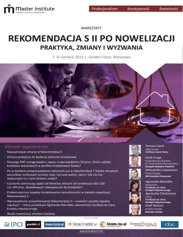 Profesjonalizm Kreatywnoœæ Rzetelnoœæ wiedza stwarza mo¿liwoœci WARSZTATY REKOMENDACJA S II PO NOWELIZACJI PRAKTYKA, ZMIANY I WYZWANIA 7- 8 czerwca 2011 r., Golden Floor, Warszawa G³ówne zagadnienia Tomasz Czech Najwa¿niejsze zmiany w Rekomendacji S radca prawny Raiffeisen Bank Polska Zmiana podejœcia do badania zdolnoœci kredytowej Jacek Furga Dlaczego KNF zrezygnowa³a z zapisu o wprowadzeniu 50-proc. limitu udzia³u Przewodnicz¹cy Komitetu ds. Finansowania Nieruchomoœci, kredytów walutowych w portfelu kredytowym banku? Zwi¹zek Banków Polskich Po co bankom przeprowadzanie opisanych ju¿ w rekomendacji T testów skrajnych warunków rynkowych (zmiany stóp i kursów walut), skoro i tak nie ma wytycznych co z tymi testami zrobiæ? Czy banki zamierzaj¹ ¿¹daæ od klientów, których LtV przekracza dziœ 130 czy 140 proc. dodatkowych zabezpieczeñ do kredytów? Problematyczne aspekty kredytowania nieruchomoœci w œwietle nowelizacji Rekomendacji S Aleksandra £ukasiewicz Prezes Zarz¹du HB Doradcy Finansowi Agnieszka Nierodka ekonomista Fundacja na rzecz Kredytu Hipotecznego Agnieszka Tu³odziecka Prezes Wprowadzenie znowelizowanej Rekomendacji S – nowoœci i punkty zapalne regulacji” – któr¹ przedstawi Agnieszka Nierodka, ekonomista Fundacji na rzecz Kredytu Hipotecznego Fundacja na rzecz Kredytu Hipotecznego Józef Wancer Doradca Zarz¹du Deloitte Polska Skutki nowelizacji zdaniem banków Patroni medialni wiedza stwarza mo¿liwoœci MASTER INSTITUTE WARSZTATY REKOMENDACJA S II PO NOWELIZACJI PRAKTYKA, ZMIANY I WYZWANIA 7-8 czerwca 2011 r., Golden Floor, Warszawa Pierwszy Dzieñ Warsztatów Drugi Dzieñ Warsztatów 09.30-10.00 Rejestracja i poranna kawa 09.30-10.00 Rejestracja i poranna kawa 10.00-11.30 Najwa¿niejsze zmiany w Rekomendacji S § Cele nowelizacji Rekomendacji S § Okres dostosowawczy § Najwa¿niejsze zmiany Porównanie Rekomendacji S I i S II § Ró¿nice § Wdro¿enie Rekomendacji S I – problemy w praktyce § Rekomendacja S II – implementacja w praktyce § Dostosowanie zaleceñ nadzoru do treœci Rekomendacji T i istniej¹cych zaleceñ w Rekomendacji S II Jacek Furga, Przewodnicz¹cy Komitetu ds. Finansowania Nieruchomoœci, Zwi¹zek Banków Polskich 10.00-11.30 Potrzeby zorganizowania dlugo-terminowego refinasowania w Polsce § Depozyty, listy zastawne, inne instrumenty § Ograniczenia prawne, regulacyjne, podatkowe § Wzorce z innych krajow Józef Wancer, by³y Prezes BPH Banku, doradca zarz¹du w Deloitte 11.30-11.45 Przerwa na kawê 11.45-12.15 Problem nak³adania siê ró¿nych Ÿróde³ prawa reguluj¹cego stosunki miêdzy bankiem a kredytobiorc¹ hipotecznym Agnieszka Tu³odziecka, Prezes Fundacji na rzecz Kredytu Hipotecznego 12.15-13.15 Wprowadzenie znowelizowanej Rekomendacji S § Nowoœci i punkty zapalne regulacji Agnieszka Nierodka, ekonomista Fundacji na rzecz Kredytu Hipotecznego 13.15-14.15 Lunch 14.15-15.45 Dyskusja panelowa Skutki nowelizacji zdaniem banków § Jak nowelizacja prze³o¿y siê na praktykê? § Jak wp³ynie na rynek kredytów? § Najlepsza instrukcja rozwi¹zañ wdro¿eniowych § Analiza pod k¹tem praktycznych zastosowañ § Koszmarna przysz³oœæ rynku kredytów konsumenckich? § Czy potrzebne s¹ kolejne regulacje i obostrzenia zwi¹zane z iloœci¹, wielkoœci¹ i rodzajem udzielanych kredytów mieszkaniowych? § Ograniczenia zamachem na wolnoœæ klientów? § Wp³yw na rozwój gospodarczy kraju Moderator dyskusji: Agnieszka Tu³odziecka Uczestnicy dyskusji Agnieszka Nierodka, ekonomista Fundacji na rzecz Kredytu Hipotecznego Jacek Furga, Przewodnicz¹cy Komitetu ds. Finansowania Nieruchomoœci, Zwi¹zek Banków Polskich Agnieszka Nachy³a, Dyrektor Departamentu Marketingu Bankowoœci Hipotecznej, Kredyt Bank Józef Wancer, by³y Prezes BPH Banku, doradca zarz¹du w Deloitte Tomasz Czech, radca prawny, Raiffeisen Bank Polska 11.30-11.45 Przerwa na kawê 11.45-12.45 Problematyczne aspekty kredytowania nieruchomoœci w œwietle nowelizacji Rekomendacji S Aleksandra £ukasiewicz, Prezes, Home Broker 12.45-13.45 Lunch 13.45-15.00 Dyskusja panelowa § Dlaczego KNF zrezygnowa³a z zapisu o wprowadzeniu 50-proc. limitu udzia³u kredytów walutowych w portfelu kredytowym banku? § Po co bankom przeprowadzanie opisanych ju¿ w rekomendacji T testów skrajnych warunków rynkowych (zmiany stóp i kursów walut), skoro i tak nie ma wytycznych co z tymi testami zrobiæ? § Czy banki zamierzaj¹ ¿¹daæ od klientów, których LtV przekracza dziœ 130 czy 140 proc. dodatkowych zabezpieczeñ do kredytów? Aleksandra £ukasiewicz, Prezes, Home Broker Józef Wancer, by³y Prezes BPH Banku, doradca zarz¹du w Deloitte Agnieszka Nierodka, ekonomista Fundacji na rzecz Kredytu Hipotecznego Agnieszka Nachy³a, Dyrektor Departamentu Marketingu Bankowoœci Hipotecznej, Kredyt Bank Przedstawiciel Banku Pekao 15.00 Zakoñczenie drugiego dnia warsztatu 15.45 Zakoñczenie pierwszego dnia warsztatu i wrêczenie certyfikatów Dlaczego warto wzi¹æ udzia³ w warsztatach: Warsztaty kierujemy do: Nowlizacja Rekomendacji S (II) wprowadzi³a szereg zmian w sektorze finansowym m.in. w kwestii kredytowania nieruchomoœci oraz kredytów walutowych. Komisja Nadzoru Finansowego na³o¿y³a na banki regulacje zmuszaj¹ce do zmiany polityki kredytowej. Wychodz¹c na przeciw wyzwaniom MASTER INSTITUTE organizuje praktyczne warsztaty pozwalaj¹ce na dyskusjê wœród ekspertów sektora finansowego. Instytucji finansowych, w szczególnoœci do kadry zarz¹dzaj¹cej oraz specjalistów z nastêpuj¹cych departamentów: Departamentów Finansowych Departamentów ds. Kredytów Departamentów ds. Ryzyka Departamentów Polityki Kredytowej Departamentów ds. Ryzyka Kredytowego Departamentów ds. Kredytów Hipotecznych Prawnych Dzia³ów Compliance Od dawna temat nowelizacji rekomendacji S II jest przewodnim wœród wielu specjalistów zastanawiaj¹cych siê jak nowelizacja wp³ynie w praktyce na bezpieczeñstwo w bankach. Dziêki panelom dyskusyjnym dowie