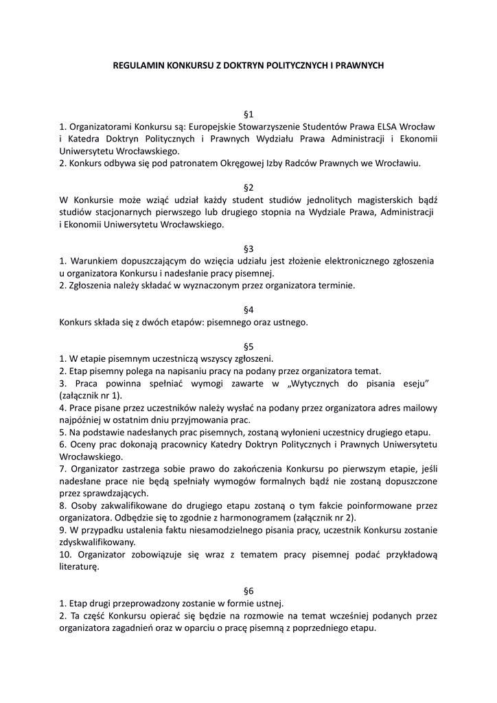REGULAMIN KONKURSU Z DOKTRYN POLITYCZNYCH I PRAWNYCH §1 1. Organizatorami Konkursu są: Europejskie Stowarzyszenie Studentów Prawa ELSA Wrocław i Katedra Doktryn Politycznych i Prawnych Wydziału Prawa Administracji i Ekonomii Uniwersytetu Wrocławskiego. 2. Konkurs odbywa się pod patronatem Okręgowej Izby Radców Prawnych we Wrocławiu. §2 W Konkursie może wziąć udział każdy student studiów jednolitych magisterskich bądź studiów stacjonarnych pierwszego lub drugiego stopnia na Wydziale Prawa, Administracji i Ekonomii Uniwersytetu Wrocławskiego. §3 1. Warunkiem dopuszczającym do wzięcia udziału jest złożenie elektronicznego zgłoszenia u organizatora Konkursu i nadesłanie pracy pisemnej. 2. Zgłoszenia należy składać w wyznaczonym przez organizatora terminie. §4 Konkurs składa się z dwóch etapów: pisemnego oraz ustnego. §5 1. W etapie pisemnym uczestniczą wszyscy zgłoszeni. 2. Etap pisemny polega na napisaniu pracy na podany przez organizatora temat. 3. Praca powinna spełniać wymogi zawarte w „Wytycznych do pisania eseju” (załącznik nr 1). 4. Prace pisane przez uczestników należy wysłać na podany przez organizatora adres mailowy najpóźniej w ostatnim dniu przyjmowania prac. 5. Na podstawie nadesłanych prac pisemnych, zostaną wyłonieni uczestnicy drugiego etapu. 6. Oceny prac dokonają pracownicy Katedry Doktryn Politycznych i Prawnych Uniwersytetu Wrocławskiego. 7. Organizator zastrzega sobie prawo do zakończenia Konkursu po pierwszym etapie, jeśli nadesłane prace nie będą spełniały wymogów formalnych bądź nie zostaną dopuszczone przez sprawdzających. 8. Osoby zakwalifikowane do drugiego etapu zostaną o tym fakcie poinformowane przez organizatora. Odbędzie się to zgodnie z harmonogramem (załącznik nr 2). 9. W przypadku ustalenia faktu niesamodzielnego pisania pracy, uczestnik Konkursu zostanie zdyskwalifikowany. 10. Organizator zobowiązuje się wraz z tematem pracy pisemnej podać przykładową literaturę. §6 1. Etap drugi przeprowadzony zostanie w formie ustnej. 2. Ta część Konkursu opierać się będzie na rozmowie na temat wcześniej podanych przez organizatora zagadnień oraz w oparciu o pracę pisemną z poprzedniego etapu. 3. Organizator przedstawi uczestnikom wspomnianą wyżej listę zagadnień. §7 1. Rozmowa prowadzona i oceniana będzie przez pracowników Katedry Doktryn Politycznych i Prawnych Uniwersytetu Wrocławskiego. 2. Podczas rozmowy uczestnicy nie mogą posługiwać się żadnymi pomocami naukowymi. §8 1. Najlepsi uczestnicy zostaną uhonorowani nagrodami rzeczowymi ufundowanymi przez Okręgową Izbę Radców Prawnych we Wrocławiu. 2. Organizator zastrzega sobie prawo do wyróżnienia prac, których autorzy nie zostaną zakwalifikowani do drugiego etapu. 3. Każdy uczestnik Konkursu otrzyma zaświadczenie o wzięciu udziału. 4. Zakwalifikowani do drugiego etapu otrzymują zaliczenie z egzaminu i ćwiczeń z Doktryn Politycznych i Prawnych, Political and legal thought oraz Wstępu do nauki o państwie i polityce w skali od oceny dostatecznej (3,0) do oceny bardzo dobrej (5,0). 5. Wysokość oceny zależy od poziomu zaprezentowanego przez uczestnika w całym Konkursie. 6. O ostatecznej ocenie decydują przeprowadzający rozmowę pracownicy Katedry Doktryn Politycznych i Prawnych w oparciu o obydwa etapy konkursu. 7. Przeprowadzający rozmowę mają prawo odmówić przyznania nagrody w postaci zaliczenia ww. przedmiotów, jeżeli w ich ocenie uczestnik prezentuje niewystarczającą po temu wiedzę. 8. Wszyscy zakwalifikowani do drugiego etapu otrzymują również pierwszeństwo przy zapisach na seminarium w Katedrze Doktryn Politycznych i Prawnych §9 Uczestnicy zobowiązani są do złożenia „Oświadczenia o byciu autorem pracy” (załącznik nr 3). §10 Organizator Konkursu ma prawo do dokonywania wykładni postanowień niniejszego Regulaminu oraz do rozstrzygania sporów powstałych przy jego stosowaniu. §11 Organizator Konkursu zastrzega sobie prawo do wprowadzania zmian zarówno w Regulaminie, jak i w załącznikach. ZAŁĄCZNIK NR 1 Wytyczne do pisania eseju. 1. Esej powinien składać się minimalnie z 2000, a maksymalnie z 3000 słów. 2. Powinien być napisany czcionką Times New Roman o rozmiarze 12, ze standardowymi ustawieniami marginesów w Microsoft Word oraz interlinią 1,5. 3. Praca powinna zostać nadesłana w formacie pdf. 4. Przypisy dolne powinny być zgodne z wytycznymi odnoszącymi się do prac magisterskich i licencjackich przygotowywanych na Wydziale Prawa, Administracji i Ekonomii UWr, o rozmiarze czcionki 10. 5. Do pracy dołączona powinna być bibliografia. 6. Praca opatrzona ma być stroną tytułową zawierającą: imię, nazwisko, rok i kierunek studiów. ZAŁĄCZNIK NR 2 Harmonogram Konkursu. 1 grudnia 2016 r. – oficjalne rozpoczęcie Konkursu; 1 – 10 grudnia 2016 r. – możliwość elektronicznego zgłoszenia udziału na utworzonej przez Organizatora stronie internetowej; 1 – 31 grudnia 2016 r. – okres, w który możliwe jest przesyłanie prac; … stycznia 2017 r. – opublikowanie wyników pierwszego etapu Konkursu; 17 stycznia 2017 r. (godzina 10:00) – finał Konkursu, wręczenie nagród. ZAŁĄCZNIK NR 3 Oświadczenie o byciu autorem pracy. ……………., dnia …………... Oświadczenie Ja, niżej podpisany/a ………………………………... oświadczam, że jestem jedynym autorem pracy przesłanej w ramach Konkursu z Doktryn Politycznych i Prawnych. Inne osoby, instytucje naukowo – badawcze, stowarzyszenia ani inne podmioty nie wniosły wkładu w powstanie w/w eseju. Oświadczam ponadto, że esej nie został wysłany do redakcji żadnego czasopisma i nie jest powtórzeniem innej pracy lub części pracy wcześniej opublikowanej. Podpis …………………………………..............