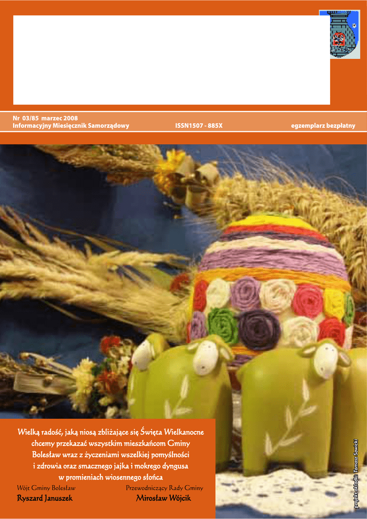B olesławskie Prezentacje Nr 03/85 marzec 2008 Informacyjny Miesięcznik Samorządowy 1 ISSN1507 - 885X egzemplarz bezpłatny chcemy przekazać wszystkim mieszkańcom Gminy Bolesław wraz z życzeniami wszelkiej pomyślności i zdrowia oraz smacznego jajka i mokrego dyngusa w promieniach wiosennego słońca Wójt Gminy Bolesław Przewodniczący Rady Gminy Ryszard Januszek Mirosław Wójcik projekt okładki: Tomasz Sawicki Wielką radość, jaką niosą zbliżające się Święta Wielkanocne B olesławskie Prezentacje 2 Projekt pn.: „II etap rewaloryzacji zabytkowego dworku w Bolesławiu” współfinansowany przez Unię Europejską z Europejskiego Funduszu Rozwoju Regionalnego oraz budżetu państwa w ramach Zintegrowanego Programu Operacyjnego Rozwoju Regionalnego Zakres rzeczowy Projektu: Powierzchnia modernizowanego obiektu dziedzictwa kulturowego – 1.122,1 m2 W ramach prowadzonych robót budowlano-montażowych zrealizowano: - dokończenie renowacji dachu, - stolarkę okienną i drzwiową, - instalacje C.O. i kotłownię, - instalacje wodno-kanalizacyjne i elektryczne, Widok wejścia na piętro - roboty wykończeniowe, - roboty zewnętrzne i elewacje, - zakup niezbędnego wyposażenia, dźwigi. Okres realizacji Projektu: grudzień 2006 r. - luty 2008 r. Widok dworku od strony podjazdu Duża wielofunkcyjna sala na parterze Mniejsza wielofunkcyjna sala na parterze z zabytkowym akcentem (odrestaurowany kominek) Widok dworku od strony parku Sala plastyczna na piętrze Widok holu głównego na piętrze Widok sali konsumpcyjnej w piwnicach Widok łazienki pokoju gościnnego na piętrze B olesławskie Prezentacje INFORMACJA Uprzejmie informuję wszystkich mieszkańców, iż z dniem 31 marca 2008 roku tracą ważność „książeczkowe” dowody osobiste. Istnieje zatem potrzeba niezwłocznej ich wymiany. Wnioski o wymianę dowodów osobistych składać można codziennie w godzinach od 7.30 do 14.30 (w poniedziałki od 8.30 do 16.00) w pokoju nr 17 Urzędu Gminy Bolesław – tel. 0-32 6424 071 wew. 109. Proszę również o odbiór nowych dowodów osobistych. Wójt /-/ Ryszard Januszek Ogłoszenie Zakład Gospodarki Komunalnej “Bolesław” Sp. z o.o. informuje mieszkańców gminy Bolesław, iż w każdy poniedziałek (począwszy od 3 marca 2008 roku) przedstawiciel naszego zakładu będzie przyjmował interesantów w siedzibie GOK Bolesław przy ulicy Głównej 46 w godzinach: 11.00-17.00. *** W wyznaczonych dniach można: - uiszczać opłaty za wywóz odpadów - zawierać umowy lub wprowadzać zmiany - zgłaszać wszystkie sprawy dotyczące świadczonych usług z zakresu wywozu odpadów. Zapraszamy! Z życzeniami wspaniałych ,wiosennych Świąt Wielkanocnych... ZGK”Bolesław”Sp.zo.o Uwaga Pary obchodzące w 2007 i w 2008 roku Jubileusz 60 – lecia pożycia małżeńskiego… Serdecznie zapraszam Dostojnych Jubilatów – mieszkańców naszej Gminy, którzy w 2007 roku obchodzili 60 – tą rocznicę pożycia małżeńskiego oraz tych, którzy w 2008 roku będą obchodzić 60 – tą rocznicę pożycia małżeńskiego do zgłaszania się w Urzędzie Stanu Cywilnego w Bolesławiu do dnia 30 kwietnia 2008 r. w godzinach pracy Urzędu Gminy / pokój nr 5 /. Kierownik Urzędu Stanu Cywilnego /-/ Elżbieta Kubańska 3 Ważniejsze inwestycje i remonty przewidziane do wykonania w 2008 r. Na bieżące utrzymanie dróg gminnych i budowę nowych odcinków dróg przewidziano wydatki w kwocie 890 000 zł. Do wykonania w tej kwocie przewidziano: - zimowe i letnie utrzymanie dróg - remonty bieżące i cząstkowe dróg - remont nawierzchni ul. Bolesławskiej w Kolonii - remont nawierzchni drogi Podlipie – Krze - remont nawierzchni odcinka drogi w Międzygórzu - wykonanie parkingu przy ul. Długiej w Ujkowie Nowym - udrożnienie przepustu pod drogą w Krzu - budowę łącznika od ul. Kluczewskiej do ul. Chmielnej w Bolesławiu - wykonanie dokumentacji na odbudowę ul. Wyzwolenia w Bolesławiu - wykonanie remontów dróg wewnętrznych – dojazdowych do pól Na pomoc finansową dla powiatu olkuskiego przeznaczono kwotę 550 000 zł na dofinansowanie remontów i modernizacji dróg powiatowych. Do wykonania w tej kwocie przewidziano: - remont chodnika i odwodnienie w Krzykawie - kontynuacja remontu nakładki w Laskach - uzupełnienie poboczy nakładką asfaltową przy ul. Górnej w Małobądzu - udrożnienie rowów przy drodze Fr. Nullo w Krzykawce - remont nakładki przy drodze Bolesław - Krążek - remont nakładki ul.Długiej w Kolonii - odwodnienie ul.Starowiejskiej w Krzykawce - wykonanie poboczy od wiaduktu przy ul. Kluczewskiej w Bolesławiu do Hutek - odwodnienie i budowa chodnika w Podlipiu Na remonty szkół przeznaczono kwotę 185 400 zł, natomiast na rozbudowę Szkoły Podstawowej w Bolesławiu na cele gimnazjalne kwotę 258 000 zł. Na remont mieszkań komunalnych (adaptacja pomieszczenia po byłym kinie) planuje się kwotę 45 000 zł. Na dalsze zagospodarowanie parku przy Dworku w Bolesławiu planuje się kwotę 250 000 zł i na wyposażenie Dworku kwotę 250 000 zł. Na modernizację Dworku w Krzykawce poprzez adaptację strychu planuje się kwotę 50 000 zł. Na budowę kanalizacji sanitarnej dla Gminy Bolesław zadanie II- Bolesław Centrum planuje się kwotę 467 000 zł. Na opracowanie projektu kanalizacji sanitarnej w Ujkowie Nowym, Bolesławiu ul.Wyzwolenia oraz w części ul. Ponikowskiej planuje się kwotę 200 000 zł. Na opracowanie projektu i budowę kanalizacji sanitarnej do mieszkań komunalnych w Bolesławiu planuje się kwotę 170 000 zł. Na budowę przyłączy i sieci kanalizacyjnej wzdłuż kanału Dąbrówka w Bolesławiu planuje się kwotę 160 000 zł. Na budowę wodociągu w Kolonii przy ul. Cichej planuje się kwotę 140 000 zł. Na projekt i budowę sieci rozdzielczej wodociągowej w Krzykawie przy drodze Krzykawa-Laski planuje się kwotę 55 000 zł. Na remont Biblioteki (wymianę okien i docieplenie budynku) planuje się kwotę 20 000 zł. Bolesław