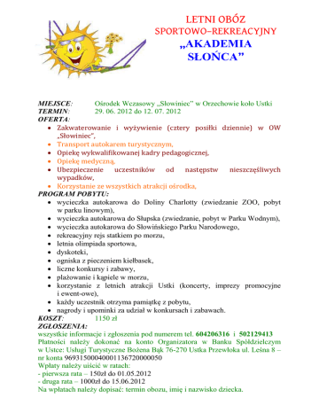 LETNI OBÓZ SPORTOWO–REKREACYJNY „AKADEMIA SŁOŃCA” MIEJSCE: Ośrodek Wczasowy „Słowiniec” w Orzechowie koło Ustki TERMIN: 29. 06. 2012 do 12. 07. 2012 OFERTA: Zakwaterowanie i wyżywienie (cztery posiłki dziennie) w OW „Słowiniec”, Transport autokarem turystycznym, Opiekę wykwalifikowanej kadry pedagogicznej, Opiekę medyczną, Ubezpieczenie uczestników od następstw nieszczęśliwych wypadków, Korzystanie ze wszystkich atrakcji ośrodka, PROGRAM POBYTU: wycieczka autokarowa do Doliny Charlotty (zwiedzanie ZOO, pobyt w parku linowym), wycieczka autokarowa do Słupska (zwiedzanie, pobyt w Parku Wodnym), wycieczka autokarowa do Słowińskiego Parku Narodowego, rekreacyjny rejs statkiem po morzu, letnia olimpiada sportowa, dyskoteki, ogniska z pieczeniem kiełbasek, liczne konkursy i zabawy, plażowanie i kąpiele w morzu, korzystanie z letnich atrakcji Ustki (koncerty, imprezy promocyjne i ewent-owe), każdy uczestnik otrzyma pamiątkę z pobytu, nagrody i upominki za udział w konkursach i zabawach. KOSZT: 1150 zł ZGŁOSZENIA: wszystkie informacje i zgłoszenia pod numerem tel. 604206316 i 502129413 Płatności należy dokonać na konto Organizatora w Banku Spółdzielczym w Ustce: Usługi Turystyczne Bożena Bąk 76-270 Ustka Przewłoka ul. Leśna 8 – nr konta 96931500040001136720000050 Wpłaty należy uiścić w ratach: - pierwsza rata – 150zł do 01.05.2012 - druga rata – 1000zł do 15.06.2012 Na wpłatach należy dopisać: termin obozu, imię i nazwisko dziecka.