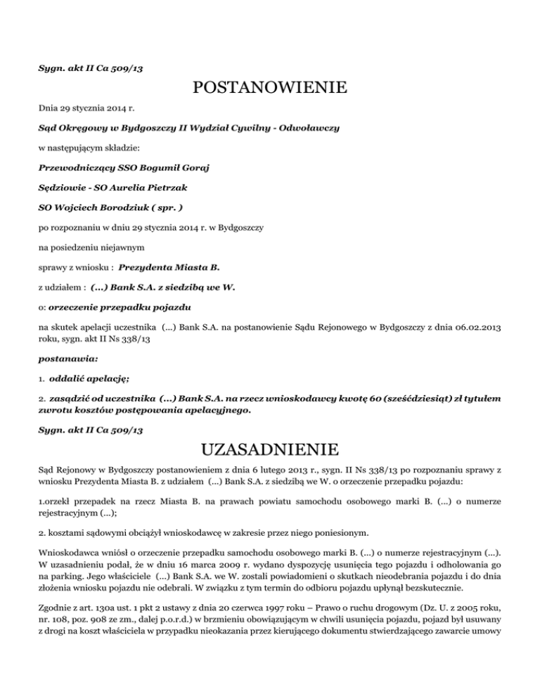 Sygn. akt II Ca 509/13 POSTANOWIENIE Dnia 29 stycznia 2014 r. Sąd Okręgowy w Bydgoszczy II Wydział Cywilny - Odwoławczy w następującym składzie: Przewodniczący SSO Bogumił Goraj Sędziowie - SO Aurelia Pietrzak SO Wojciech Borodziuk ( spr. ) po rozpoznaniu w dniu 29 stycznia 2014 r. w Bydgoszczy na posiedzeniu niejawnym sprawy z wniosku : Prezydenta Miasta B. z udziałem : (...) Bank S.A. z siedzibą we W. o: orzeczenie przepadku pojazdu na skutek apelacji uczestnika (...) Bank S.A. na postanowienie Sądu Rejonowego w Bydgoszczy z dnia 06.02.2013 roku, sygn. akt II Ns 338/13 postanawia: 1. oddalić apelację; 2. zasądzić od uczestnika (...) Bank S.A. na rzecz wnioskodawcy kwotę 60 (sześćdziesiąt) zł tytułem zwrotu kosztów postępowania apelacyjnego. Sygn. akt II Ca 509/13 UZASADNIENIE Sąd Rejonowy w Bydgoszczy postanowieniem z dnia 6 lutego 2013 r., sygn. II Ns 338/13 po rozpoznaniu sprawy z wniosku Prezydenta Miasta B. z udziałem (...) Bank S.A. z siedzibą we W. o orzeczenie przepadku pojazdu: 1.orzekł przepadek na rzecz Miasta B. na prawach powiatu samochodu osobowego marki B. (...) o numerze rejestracyjnym (...); 2. kosztami sądowymi obciążył wnioskodawcę w zakresie przez niego poniesionym. Wnioskodawca wniósł o orzeczenie przepadku samochodu osobowego marki B. (...) o numerze rejestracyjnym (...). W uzasadnieniu podał, że w dniu 16 marca 2009 r. wydano dyspozycję usunięcia tego pojazdu i odholowania go na parking. Jego właściciele (...) Bank S.A. we W. zostali powiadomieni o skutkach nieodebrania pojazdu i do dnia złożenia wniosku pojazdu nie odebrali. W związku z tym termin do odbioru pojazdu upłynął bezskutecznie. Zgodnie z art. 130a ust. 1 pkt 2 ustawy z dnia 20 czerwca 1997 roku – Prawo o ruchu drogowym (Dz. U. z 2005 roku, nr. 108, poz. 908 ze zm., dalej p.o.r.d.) w brzmieniu obowiązującym w chwili usunięcia pojazdu, pojazd był usuwany z drogi na koszt właściciela w przypadku nieokazania przez kierującego dokumentu stwierdzającego zawarcie umowy obowiązkowego ubezpieczenia odpowiedzialności cywilnej posiadacza pojazdu. W takim wypadku zgodnie z art. 130a ust. 10 p. o r. d. w brzmieniu obowiązującym sprzed wejścia w życie ustawy z dnia 22 lipca 2010 roku oz mianie ustawy – Prawo o ruchu drogowym i innych ustaw (Dz. U. nr 152, poz. 1018 ze zm., dalej zm. p. o r. d.), pojazd usunięty w trybie określonym w ust. 1 lub ust. 2 i nieodebrany przez uprawnioną osobę, w terminie 6 miesięcy od dnia usunięcia, uznaje się za porzucony z zamiarem wyzbycia się, a pojazd taki przechodzi na rzecz Skarbu Państwa z mocy ustawy. Zgodnie z art. 10 zm. p. o r. d. w przypadku pojazdów, które zostały usunięte przed wejściem w życie nowej zmienionej ustawy i do tego dnia nie zostały odebrane z parkingu strzeżonego przez uprawnioną osobę, termin określony w art. 130a ust. 10 ustawy zmienianej w art. 1 w brzmieniu dotychczasowym, po którego upływie starosta występuje do Sądu z wnioskiem o orzeczenie przepadku pojazdu, biegnie w dalszym ciągu od dnia usunięcia pojazdu. W przypadkach, w których bieg terminu określonego w art. 130a ust. 10 ustawy zmienianej w brzmieniu dotychczasowym, rozpoczął się i nie zakończył przed dniem wejścia w życie zmienionej ustawy, przepadek pojazdów orzeka się na rzecz powiatu (art. 11 ust. 1 ustawy). Ponadto jak wynika z brzmienia art. 12 ust. 1 zm. p.o r.d. postępowania w sprawach przejęcia na rzecz Skarbu Państwa własności pojazdów nieodebranych przez uprawnione osoby w terminie określonym w art. 130a ust. 10 ustawy zmienianej w art. 1 w brzmieniu dotychczasowym, niezakończone przed dniem wejścia w życie ustawy, umarza się, a sprawy przekazuje właściwym starostom. Przepis art. 11 stosuje się odpowiednio. Zgodnie z ust. 2 w przypadkach, w których termin określony w art. 130a ust. 10 ustawy zmienianej w art. 1 w brzmieniu dotychczasowym, upłynął przed dniem wejścia w życie ustawy i nie zostało wszczęte postępowania w sprawie przejęcia własności pojazdu na rzecz Skarbu Państwa, przepis art. 11 stosuje się odpowiednio. Sąd podkreślił, że rozpoznając złożony w tej sprawie wniosek, miał obowiązek zbadać, czy zostały spełnione przesłanki do orzeczenia przepadku pojazdu, w szczególności, czy usunięcie pojazdu było zasadne i czy w poszukiwaniu osoby uprawnionej do jego odbioru dołożono należytej staranności. Sąd ma też obowiązek rozważenia w każdej sprawie, czy orzeczenie przepadku nie będzie sprzeczne z zasadami współżycia społecznego. Należy przez to rozumieć, że przesłanki uzasadniające orzeczenie przepadku obowiązany jest wykazać wnioskodawca, a sąd dodatkowo rozważa z urzędu, czy uwzględnieniu wniosku nie sprzeciwiają się zasady współżycia społecznego, co powinno zapobiec niefrasobliwemu pozbawianiu prawa własności. Sąd podkreślił, że na gruncie niniejszej sprawy usunięcie pojazdu było zasadne, bowiem przedmiotowy samochód został usunięty na skutek nieokazania przez kierującego dokumentu stwierdzającego zawarcie umowy obowiązkowego ubezpieczenie odpowiedzialności cywilnej posiadacza pojazdu lub stwierdzającego opłacenie składki tego ubezpieczenia. Właściciel pojazdu prawidłowo został powiadomiony o możliwości jego odebrania z parkingu i skutkach jego nieodebrania. W konsekwencji Sad Rejonowy uznał, że wnioskodawca wykazał spełnienie przesłanki orzeczenia przepadku pojazdu wymagane przez ustawę – Prawo o ruchu drogowym, a jednocześnie Sąd działając z urzędu uznał, że orzeczenie przepadku nie narusza zasad współżycia społecznego. O kosztach postępowania Sąd orzekł na podstawie art. 520 §1 k.p.c., zgodnie z którym każdy uczestnik ponosi koszty postepowania związane ze swym udziałem w sprawie. Postanowienie Sądu Rejonowego zaskarżył apelacją uczestnik (...) Bank S.A., zarzucając: - błędne ustalenie stanu faktycznego mające znaczenie dla rozstrzygnięcia spr