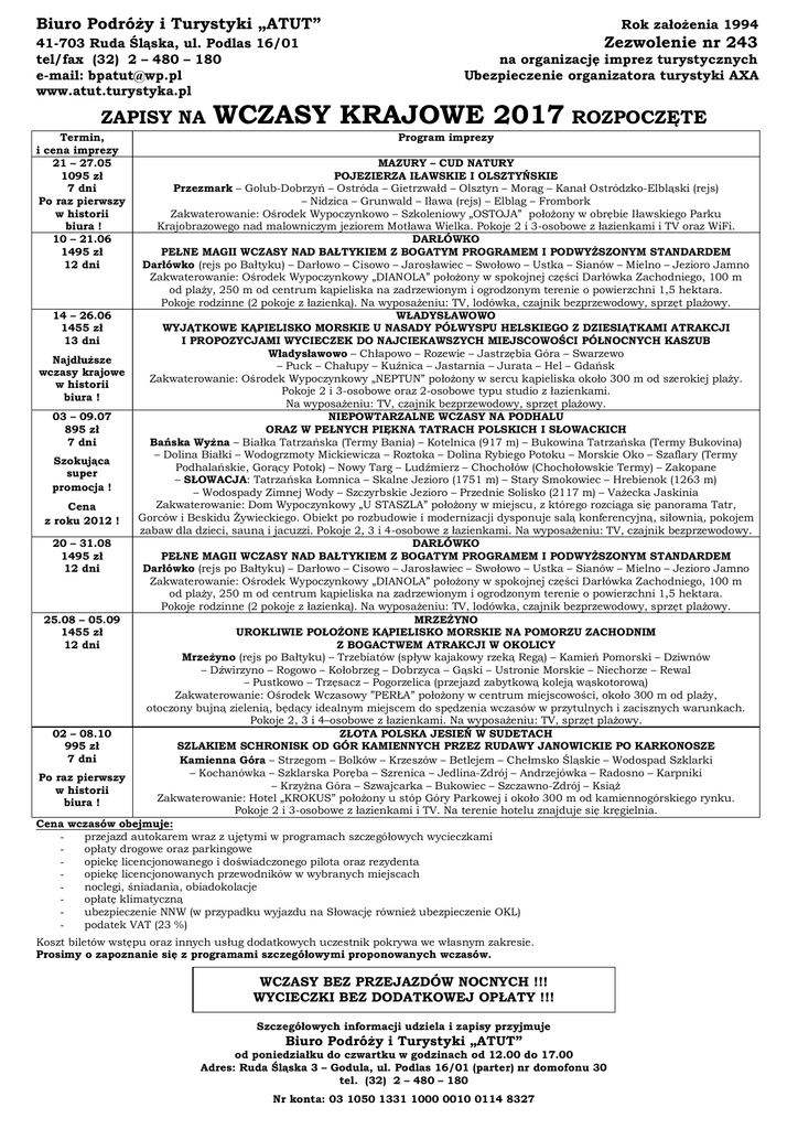 Biuro Podróży i Turystyki „ATUT” 41-703 Ruda Śląska, ul. Podlas 16/01 tel/fax (32) 2 – 480 – 180 e-mail: [email protected] www.atut.turystyka.pl ZAPISY NA Termin, i cena imprezy 21 – 27.05 1095 zł 7 dni Po raz pierwszy w historii biura ! 10 – 21.06 1495 zł 12 dni Rok założenia 1994 Zezwolenie nr 243 na organizację imprez turystycznych Ubezpieczenie organizatora turystyki AXA WCZASY KRAJOWE 2017 ROZPOCZĘTE Program imprezy MAZURY – CUD NATURY POJEZIERZA IŁAWSKIE I OLSZTYŃSKIE Przezmark – Golub-Dobrzyń – Ostróda – Gietrzwałd – Olsztyn – Morąg – Kanał Ostródzko-Elbląski (rejs) – Nidzica – Grunwald – Iława (rejs) – Elbląg – Frombork Zakwaterowanie: Ośrodek Wypoczynkowo – Szkoleniowy „OSTOJA” położony w obrębie Iławskiego Parku Krajobrazowego nad malowniczym jeziorem Motława Wielka. Pokoje 2 i 3-osobowe z łazienkami i TV oraz WiFi. DARŁÓWKO PEŁNE MAGII WCZASY NAD BAŁTYKIEM Z BOGATYM PROGRAMEM I PODWYŻSZONYM STANDARDEM Darłówko (rejs po Bałtyku) – Darłowo – Cisowo – Jarosławiec – Swołowo – Ustka – Sianów – Mielno – Jezioro Jamno Zakwaterowanie: Ośrodek Wypoczynkowy „DIANOLA” położony w spokojnej części Darłówka Zachodniego, 100 m od plaży, 250 m od centrum kąpieliska na zadrzewionym i ogrodzonym terenie o powierzchni 1,5 hektara. Pokoje rodzinne (2 pokoje z łazienką). Na wyposażeniu: TV, lodówka, czajnik bezprzewodowy, sprzęt plażowy. 14 – 26.06 WŁADYSŁAWOWO 1455 zł WYJĄTKOWE KĄPIELISKO MORSKIE U NASADY PÓŁWYSPU HELSKIEGO Z DZIESIĄTKAMI ATRAKCJI 13 dni I PROPOZYCJAMI WYCIECZEK DO NAJCIEKAWSZYCH MIEJSCOWOŚCI PÓŁNOCNYCH KASZUB Władysławowo – Chłapowo – Rozewie – Jastrzębia Góra – Swarzewo Najdłuższe – Puck – Chałupy – Kuźnica – Jastarnia – Jurata – Hel – Gdańsk wczasy krajowe Zakwaterowanie: Ośrodek Wypoczynkowy „NEPTUN” położony w sercu kąpieliska około 300 m od szerokiej plaży. w historii Pokoje 2 i 3-osobowe oraz 2-osobowe typu studio z łazienkami. biura ! Na wyposażeniu: TV, czajnik bezprzewodowy, sprzęt plażowy. 03 – 09.07 NIEPOWTARZALNE WCZASY NA PODHALU 895 zł ORAZ W PEŁNYCH PIĘKNA TATRACH POLSKICH I SŁOWACKICH 7 dni Bańska Wyżna – Białka Tatrzańska (Termy Bania) – Kotelnica (917 m) – Bukowina Tatrzańska (Termy Bukovina) – Dolina Białki – Wodogrzmoty Mickiewicza – Roztoka – Dolina Rybiego Potoku – Morskie Oko – Szaflary (Termy Szokująca Podhalańskie, Gorący Potok) – Nowy Targ – Ludźmierz – Chochołów (Chochołowskie Termy) – Zakopane super – SŁOWACJA: Tatrzańska Łomnica – Skalne Jezioro (1751 m) – Stary Smokowiec – Hrebienok (1263 m) promocja ! – Wodospady Zimnej Wody – Szczyrbskie Jezioro – Przednie Solisko (2117 m) – Vażecka Jaskinia Zakwaterowanie: Dom Wypoczynkowy „U STASZLA” położony w miejscu, z którego rozciąga się panorama Tatr, Cena Gorców i Beskidu Żywieckiego. Obiekt po rozbudowie i modernizacji dysponuje salą konferencyjną, siłownią, pokojem z roku 2012 ! zabaw dla dzieci, sauną i jacuzzi. Pokoje 2, 3 i 4-osobowe z łazienkami. Na wyposażeniu: TV, czajnik bezprzewodowy. 20 – 31.08 DARŁÓWKO 1495 zł PEŁNE MAGII WCZASY NAD BAŁTYKIEM Z BOGATYM PROGRAMEM I PODWYŻSZONYM STANDARDEM 12 dni Darłówko (rejs po Bałtyku) – Darłowo – Cisowo – Jarosławiec – Swołowo – Ustka – Sianów – Mielno – Jezioro Jamno Zakwaterowanie: Ośrodek Wypoczynkowy „DIANOLA” położony w spokojnej części Darłówka Zachodniego, 100 m od plaży, 250 m od centrum kąpieliska na zadrzewionym i ogrodzonym terenie o powierzchni 1,5 hektara. Pokoje rodzinne (2 pokoje z łazienką). Na wyposażeniu: TV, lodówka, czajnik bezprzewodowy, sprzęt plażowy. 25.08 – 05.09 MRZEŻYNO 1455 zł UROKLIWIE POŁOŻONE KĄPIELISKO MORSKIE NA POMORZU ZACHODNIM 12 dni Z BOGACTWEM ATRAKCJI W OKOLICY Mrzeżyno (rejs po Bałtyku) – Trzebiatów (spływ kajakowy rzeką Regą) – Kamień Pomorski – Dziwnów – Dźwirzyno – Rogowo – Kołobrzeg – Dobrzyca – Gąski – Ustronie Morskie – Niechorze – Rewal – Pustkowo – Trzęsacz – Pogorzelica (przejazd zabytkową koleją wąskotorową) Zakwaterowanie: Ośrodek Wczasowy ”PERŁA” położony w centrum miejscowości, około 300 m od plaży, otoczony bujną zielenią, będący idealnym miejscem do spędzenia wczasów w przytulnych i zacisznych warunkach. Pokoje 2, 3 i 4–osobowe z łazienkami. Na wyposażeniu: TV, sprzęt plażowy. 02 – 08.10 ZŁOTA POLSKA JESIEŃ W SUDETACH 995 zł SZLAKIEM SCHRONISK OD GÓR KAMIENNYCH PRZEZ RUDAWY JANOWICKIE PO KARKONOSZE 7 dni Kamienna Góra – Strzegom – Bolków – Krzeszów – Betlejem – Chełmsko Śląskie – Wodospad Szklarki – Kochanówka – Szklarska Poręba – Szrenica – Jedlina-Zdrój – Andrzejówka – Radosno – Karpniki Po raz pierwszy – Krzyżna Góra – Szwajcarka – Bukowiec – Szczawno-Zdrój – Książ w historii Zakwaterowanie: Hotel „KROKUS” położony u stóp Góry Parkowej i około 300 m od kamiennogórskiego rynku. biura ! Pokoje 2 i 3-osobowe z łazienkami i TV. Na terenie hotelu znajduje się kręgielnia. Cena wczasów obejmuje: przejazd autokarem wraz z ujętymi w programach szczegółowych wycieczkami opłaty drogowe oraz parkingowe opiekę licencjonowanego i doświadczonego pilota oraz rezydenta opiekę licencjonowanych przewodników w wybranych miejscach noclegi, śniadania, obiadokolacje opłatę klimatyczną ubezpieczenie NNW (w przypadku wyjazdu na Słowację również ubezpieczenie OKL) podatek VAT (23 %) Koszt biletów wstępu oraz innych usług dodatkowych uczestnik pokrywa we własnym zakresie. Prosimy o zapoznanie się z programami szczegółowymi proponowanych wczasów. WCZASY BEZ PRZEJAZDÓW NOCNYCH !!! WYCIECZKI BEZ DODATKOWEJ OPŁATY !!! Szczegółowych informacji udziela i zapisy przyjmuje Biuro Podróży i Turystyki „ATUT” od poniedziałku do czwartku w godzinach od 12.00 d