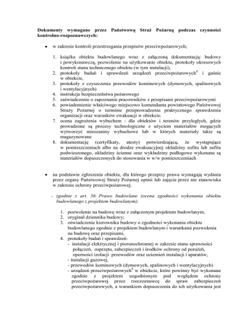 Dokumenty wymagane przez Państwową Straż Pożarną podczas czynności kontrolno-rozpoznawczych: w zakresie kontroli przestrzegania przepisów przeciwpożarowych; 1. książka obiektu budowlanego wraz z załączoną dokumentacją: budowy i powykonawczą, pozwolenie na użytkowanie obiektu, protokoły okresowych kontroli stanu technicznego obiektu (w tym instalacji), 2. protokoły badań i sprawdzeń urządzeń przeciwpożarowych1 i gaśnic w obiekcie, 3. protokoły z czyszczenia przewodów kominowych (dymowych, spalinowych i wentylacyjnych) 4. instrukcja bezpieczeństwa pożarowego 5. zaświadczenie o zapoznaniu pracowników z przepisami przeciwpożarowymi 6. powiadomienie właściwego miejscowo komendanta powiatowego Państwowej Straży Pożarnej o terminie przeprowadzenia praktycznego sprawdzenia organizacji oraz warunków ewakuacji w obiekcie. 7. ocena zagrożenia wybuchem - dla obiektów i terenów przyległych, gdzie prowadzone są procesy technologiczne z użyciem materiałów mogących wytworzyć mieszaniny wybuchowe lub w których materiały takie są magazynowane 8. dokumentację (certyfikaty, atesty) potwierdzającą, że występujące w pomieszczeniach albo na drodze ewakuacyjnej okładziny sufitu lub sufitu podwieszonego, okładziny ścienne oraz wykładziny podłogowe wykonane są materiałów dopuszczonych do stosowania w w/w pomieszczeniach na podstawie zgłoszenia obiektu, dla którego przepisy prawa wymagają wydania przez organy Państwowej Straży Pożarnej opinii lub zajęcia przez nie stanowiska w zakresie ochrony przeciwpożarowej; - zgodnie z art. 56 Prawo budowlane (ocena zgodności wykonania obiektu budowlanego z projektem budowlanym); 1. pozwolenie na budowę wraz z załączonym projektem budowlanym, 2. oryginał dziennika budowy; 3. oświadczenie kierownika budowy o zgodności wykonania obiektu budowlanego zgodnie z projektem budowlanym i warunkami pozwolenia na budowę oraz przepisami, 4. protokoły badań i sprawdzeń: - instalacji elektrycznej i piorunochronnej w zakresie stanu sprawności połączeń, osprzętu, zabezpieczeń i środków ochrony od porażeń, oporności izolacji przewodów oraz uziemień instalacji i aparatów, - instalacji gazowej, - przewodów kominowych (dymowych, spalinowych i wentylacyjnych) - urządzeń przeciwpożarowych1 w obiekcie, które powinny być wykonane zgodnie z projektem uzgodnionym pod względem ochrony przeciwpożarowej przez rzeczoznawcę do spraw zabezpieczeń przeciwpożarowych, a warunkiem dopuszczenia do ich użytkowania jest przeprowadzenie odpowiednich dla danego urządzenia prób i badań, potwierdzających prawidłowość ich działania. 5. dokumenty świadczące o dopuszczeniu wyrobów do obrotu i powszechnego stosowania w budownictwie w zakresie ochrony przeciwpożarowej (certyfikaty, atesty) 6. w razie zmian nieodstępujących w sposób istotny od zatwierdzonego projektu lub warunków pozwolenia na budowę, należy dołączyć kopie rysunków wchodzących w skład zatwierdzonego projektu budowlanego, z naniesionymi zmianami, a w razie potrzeby także uzupełniający opis. W takim przypadku oświadczenie kierownika budowy o zgodności wykonania obiektu budowlanego z projektem budowlanym i warunkami pozwolenia na budowę oraz przepisami, powinno być potwierdzone przez projektanta i inspektora nadzoru inwestorskiego, jeżeli został ustanowiony. W przypadku gdy powyższe zmiany mają wpływ na bezpieczeństwo pożarowe, a projekt budowlany wymagał zgodnie z odrębnymi przepisami uzgodnienia przez rzeczoznawcę ds. zabezpieczeń przeciwpożarowych, zmiany te powinny również być potwierdzone przez rzeczoznawcę ds. zabezpieczeń przeciwpożarowych. - inne opinie, np. w sprawie spełnienia wymagań przeciwpożarowych dla planowanej imprezy masowej czy punktu przedszkolnego lub zespołu wychowania przedszkolnego 1. książka obiektu budowlanego wraz z załączoną dokumentacją: budowy i powykonawczą, pozwolenie na użytkowanie obiektu, protokoły okresowych kontroli stanu technicznego obiektu, 2. protokoły badań i sprawdzeń urządzeń przeciwpożarowych1 i gaśnic w obiekcie, 3. protokoły z czyszczenia przewodów kominowych (dymowych, spalinowych i wentylacyjnych) 4. instrukcja bezpieczeństwa pożarowego 5. zaświadczenie o zapoznaniu pracowników z przepisami przeciwpożarowymi 6. powiadomienie właściwego miejscowo komendanta powiatowego Państwowej Straży Pożarnej o terminie przeprowadzenia praktycznego sprawdzenia organizacji oraz warunków ewakuacji. 7. ocena zagrożenia wybuchem - dla obiektów i terenów przyległych, gdzie prowadzone są procesy technologiczne z użyciem materiałów mogących wytworzyć mieszaniny wybuchowe lub w których materiały takie są magazynowane 8. dokumentację (certyfikaty, atesty) potwierdzającą, że występujące w pomieszczeniach albo na drodze ewakuacyjnej okładziny sufitu lub sufitu podwieszonego, okładziny ścienne oraz wykładziny podłogowe wykonane są materiałów dopuszczonych do stosowania w w/w pomieszczeniach 1 rozumie się przez to urządzenia (stałe lub półstałe, uruchamiane ręcznie lub samoczynnie) służące do wykrywania i zwalczania pożaru lub ograniczania jego skutków, a w szczególności: stałe i półstałe urządzenia gaśnicze i zabezpieczające, urządzenia inertyzujące, urządzenia wchodzące w skład dźwiękowego systemu ostrzegawczego i systemu sygnalizacji pożarowej, w tym urządzenia sygnalizacyjno-alarmowe, urządzenia odbiorcze alarmów pożarowych i urządzenia odbiorcze sygnałów uszkodzeniowych, instalacje oświetlenia ewakuacyjnego, hydranty wewnętrzne i zawory hydrantowe, hydranty zewnętrzne, pompy w pompowniach przeciwpożarowych, przeciwpożarowe klapy odcinające, urządzenia oddymiające, urządzenia zabezpieczające przed powstaniem wybuchu i ograniczające jego skutki, kurtyny dymowe oraz drzwi, bramy przeciwpożarowe i inne zamknięcia, jeżeli są wyposażone w systemy sterowania, przeciwpożarowe w