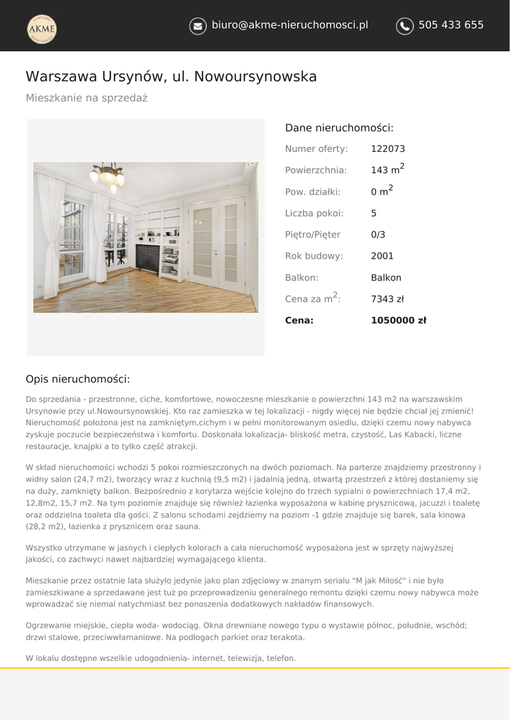[email protected] 505 433 655 Warszawa Ursynów, ul. Nowoursynowska Mieszkanie na sprzedaż Dane nieruchomości: Numer oferty: 122073 Powierzchnia: 143 m Pow. działki: 0m Liczba pokoi: 5 Piętro/Pięter 0/3 Rok budowy: 2001 Balkon: Balkon 2 2 2 Cena za m : 7343 zł Cena: 1050000 zł Opis nieruchomości: Do sprzedania - przestronne, ciche, komfortowe, nowoczesne mieszkanie o powierzchni 143 m2 na warszawskim Ursynowie przy ul.Nowoursynowskiej. Kto raz zamieszka w tej lokalizacji - nigdy więcej nie będzie chciał jej zmienić! Nieruchomość położona jest na zamkniętym,cichym i w pełni monitorowanym osiedlu, dzięki czemu nowy nabywca zyskuje poczucie bezpieczeństwa i komfortu. Doskonała lokalizacja- bliskość metra, czystość, Las Kabacki, liczne restauracje, knajpki a to tylko część atrakcji. W skład nieruchomości wchodzi 5 pokoi rozmieszczonych na dwóch poziomach. Na parterze znajdziemy przestronny i widny salon (24,7 m2), tworzący wraz z kuchnią (9,5 m2) i jadalnią jedną, otwartą przestrzeń z której dostaniemy się na duży, zamknięty balkon. Bezpośrednio z korytarza wejście kolejno do trzech sypialni o powierzchniach 17,4 m2, 12,8m2, 15,7 m2. Na tym poziomie znajduje się również łazienka wyposażona w kabinę prysznicową, jacuzzi i toaletę oraz oddzielna toaleta dla gości. Z salonu schodami zejdziemy na poziom -1 gdzie znajduje się barek, sala kinowa (28,2 m2), łazienka z prysznicem oraz sauna. Wszystko utrzymane w jasnych i ciepłych kolorach a cała nieruchomość wyposażona jest w sprzęty najwyższej jakości, co zachwyci nawet najbardziej wymagającego klienta. Mieszkanie przez ostatnie lata służyło jedynie jako plan zdjęciowy w znanym serialu "M jak Miłość" i nie było zamieszkiwane a sprzedawane jest tuż po przeprowadzeniu generalnego remontu dzięki czemu nowy nabywca może wprowadzać się niemal natychmiast bez ponoszenia dodatkowych nakładów finansowych. Ogrzewanie miejskie, ciepła woda- wodociąg. Okna drewniane nowego typu o wystawie północ, południe, wschód; drzwi stalowe, przeciwwłamaniowe. Na podłogach parkiet oraz terakota. W lokalu dostępne wszelkie udogodnienia- internet, telewizja, telefon. [email protected] 505 433 655 Istnieje możliwość zakupu miejsca postojowego w garażu podziemnym w cenie 30 000 zł oraz naziemnego miejsca parkingowego w cenie 10 000 zł. Idealne miejsce do zamieszkania dla rodzin z dziećmi. W pobliżu plac zabaw, Las Kabacki, hala widowiskowa - Arena Ursynów, Multikino, ogród botaniczny w Powsinie,liczne szkoły ( SGGW,Szkoła Podstawowa im. Przymierza Rodzin, przedszkole, żłobek) Wspaniała lokalizacja, cisza, świeże powietrze. W sąsiedztwie liczne tereny zielone i rekreacyjne. Nie czekaj! Zadzwoń i umów się na dzień pokazowy! [email protected] 505 433 655