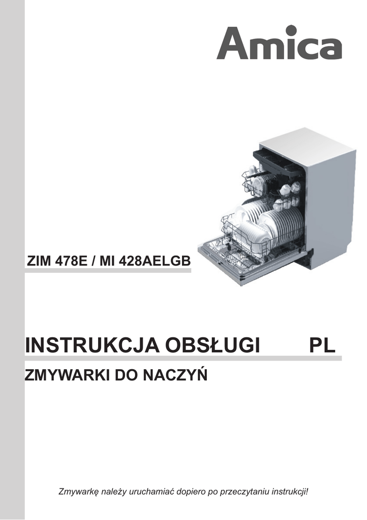 ZIM 478E / MI 428AELGB INSTRUKCJA OBSŁUGI ZMYWARKI DO NACZYŃ Zmywarkę należy uruchamiać dopiero po przeczytaniu instrukcji! PL GRATULUJEMY WYBORU SPRZĘTU MARKI AMICA SZANOWNY KLIENCIE! Przed podłączeniem wtyczki zmywarki do naczyń do gniazda zasilania i rozpoczęciem eksploatacji należy koniecznie uważnie przeczytać całą instrukcję obsługi i instalacji. Zawarte w niej wskazówki pomogą uniknąć ryzyka obrażeń ciała i uszkodzenia urządzenia. Dokumentację zmywarki należy przechować w bezpiecznym miejscu w celu poprawnego użytkowania i ewentualnych konsultacji. Niniejsza instrukcja obsługi została przygotowana dla różnych urządzeń i pewne opisane w niej funkcje mogą nie dotyczyć posiadanego przez Państwa urządzenia. Poniżej znajdują się objaśnienia dotyczące symboli występujących w niniejszej instrukcji: Ważne informacje dotyczące bezpieczeństwa użytkownika urządzenia oraz prawidłowej jego eksploatacji. Zagrożenia wynikające z niewłaściwego postępowania z urządzeniem oraz czynnościach, które może wykonać jedynie wykwalifikowana osoba, na przykład z serwisu producenta. i Wskazówki związane z użytkowaniem sprzętu. Informacje dotyczące ochrony środowiska naturalnego. Zakaz wykonywania pewnych czynności przez użytkownika. SPIS TREŚCI WSKAZÓWKI DOTYCZĄCE BEZPIECZEŃSTWA UŻYTKOWANIA 3 JAK DBAĆ O ŚRODOWISKO 6 INSTALACJA URZĄDZENIA 7 POZNAJ SWOJE URZĄDZENIE 9 PRZYGOTOWANIE URZĄDZENIA DO PRACY 11 ZAŁADUNEK ZMYWARKI NACZYNIAMI 15 WŁĄCZANIE URZĄDZENIA I WYBÓR PROGRAMU 18 TABELA PROGRAMÓW 20 CZYSZCZENIE I KONSERWACJA 21 KODY BŁĘDÓW I DZIAŁANIA W PRZYPADKU AWARII 22 PORADY PRAKTYCZNE I PRZYDATNE INFORMACJE 23 MONTAŻ URZĄDZENIA W ZABUDOWIE MEBLOWEJ 24 i Zmywarka przeznaczona jest wyłącznie do użytku domowego. Producent zastrzega sobie możliwość dokonywania zmian niewpływających na działanie urządzenia. 2 Masz wątpliwości? Nie wszystko, co przeczytałeś w instrukcji jest zrozumiałe zadzwoń do Centrum Serwisowego, gdzie uzyskasz wszechstronną pomoc. WSKAZÓWKI DOTYCZĄCE BEZPIECZEŃSTWA UŻYTKOWANIA Przed instalacją Sprawdź urządzenie pod kątem uszkodzeń transportowych. Nigdy nie instaluj ani nie używaj uszkodzonego urządzenia. W razie wątpliwości skontaktuj się ze sprzedawcą. Przed pierwszym użyciem • Patrz Uwagi dotyczące instalacji (poniżej). • Zleć instalację systemu uziemienia wykwalifikowanemu elektrykowi. • Producent nie odpowiada za jakiekolwiek szkody powstałe w wyniku użytkowania nieuziemionego urządzenia. • Przed uruchomieniem urządzenia sprawdź, czy dane podane na tabliczce znamionowej są zgodne z danymi lokalnej sieci zasilającej. • Na c z as i n s t a l a c j i odłącz zmywarkę do naczyń od zasilania. • Zawsze używaj oryginalnej wtyczki dostarczonej z urządzeniem. • Nie podłączaj urządzenia do sieci zasilającej za pomocą przedłużacza. Przedłużacze nie zapewniają dostatecznego bezpieczeństwa (np. mogą się przegrzewać). • Po zainstalowaniu urządzenia, wtyczka powinna być łatwo dostępna. Niniejszy sprzęt może być użytkowany przez dzieci w wieku co najmniej 8 lat i przez osoby o obniżonych możliwościach fizycznych, umysłowych i osoby o braku doświadczenia i znajomości sprzętu, jeżeli zapewniony zostanie nadzór lub instruktaż odnośnie do użytkowania sprzętu w bezpieczny sposób, tak aby związane z tym zagrożenia były zrozumiałe. Dzieci nie powinny bawić się sprzętem. Dzieci bez nadzoru nie powinny wykonywać czyszczenia i konserwacji sprzętu. Dzieci poniżej 3 roku życia powinny trzymać się z daleka, chyba że są pod stałą opieką. 3 WSKAZÓWKI DOTYCZĄCE BEZPIECZEŃSTWA UŻYTKOWANIA Bezpieczeństwo dzieci • Nie pozwalaj dzieciom bawić się tym urządzeniem. • Detergenty do zmywarek do naczyń mogą mieć działanie żrące dla oczu, ust i gardła. Przeczytaj uwagi dotyczące bezpieczeństwa, umieszczane przez producentów detergentów. • Nigdy nie zostawiaj dzieci bez nadzoru, kiedy urządzenie jest otwarte. Mogą w nim być pozostałości detergentów. • Woda w zmywarce nie nadaje się do picia. Niebezpieczeństwo obrażeń ze strony środków żrących. • Podczas otwierania drzwi w trakcie trwania programu należy zachować ostrożność ze względu na wysoką temperaturę wody • Zawsze umieszczaj długie i ostre/spiczaste przedmioty (np. widelce, noże) w koszyku na sztućce, skierowane czubkiem w dół lub płasko na górnym koszu, aby uniknąć ewentualnych obrażeń. Codzienna obsługa • Używaj urządzenie tylko w gospodarstwie domowym do następującej czynności: zmywanie naczyń. • Nie stosuj rozpuszczalników chemicznych w urządzeniu; istnieje zagrożenie wybuchem. • Nie siadaj ani nie stawaj na otwartych drzwiach, ani nie kładź na nich żadnych przedmiotów. Urządzenie może się przewrócić. • Nie otwieraj drzwi, kiedy urządzenie pracuje. Możesz wypuścić gorącą wodę lub parę. • Nie zostawiaj otwartych drzwi, ponieważ mogą stwarzać zagrożenie. W razie problemów • Zlecaj naprawy i modyfikacje urządzenia tylko wykwalifikowanym pracownikom serwisu. • W razie problemów lub napraw, odłącz urządzenie od sieci zasilającej: • odłącz urządzenie, wyciągając wtyczkę, • wyłącz bezpiecznik. • Nie ciągnij za kabel, tylko za wtyczkę. Zamknij dopływ wody. 4 WSKAZÓWKI DOTYCZĄCE BEZPIECZEŃSTWA UŻYTKOWANIA Zalecenia • D l a o s z c z ę d n o ś c i energii i wody przed włożeniem naczyń do zmywarki spłukać pozostałości potraw. Uruchamiać zmywarkę w pełni załadowaną. • Nie wkładać do urządzenia naczyń z resztkami żywności. • Z programu mycia wstępnego korzystać tylko w razie potrzeby. • Miski, szklanki i kubki wkładać do urządzenia spodem do góry. • Nie wkładać do urządzenia naczyń nie przeznaczonych do mycia w zmywarce oraz nie przepełniać zmywarki. i • Plastikowe naczynia nie odporne na działani