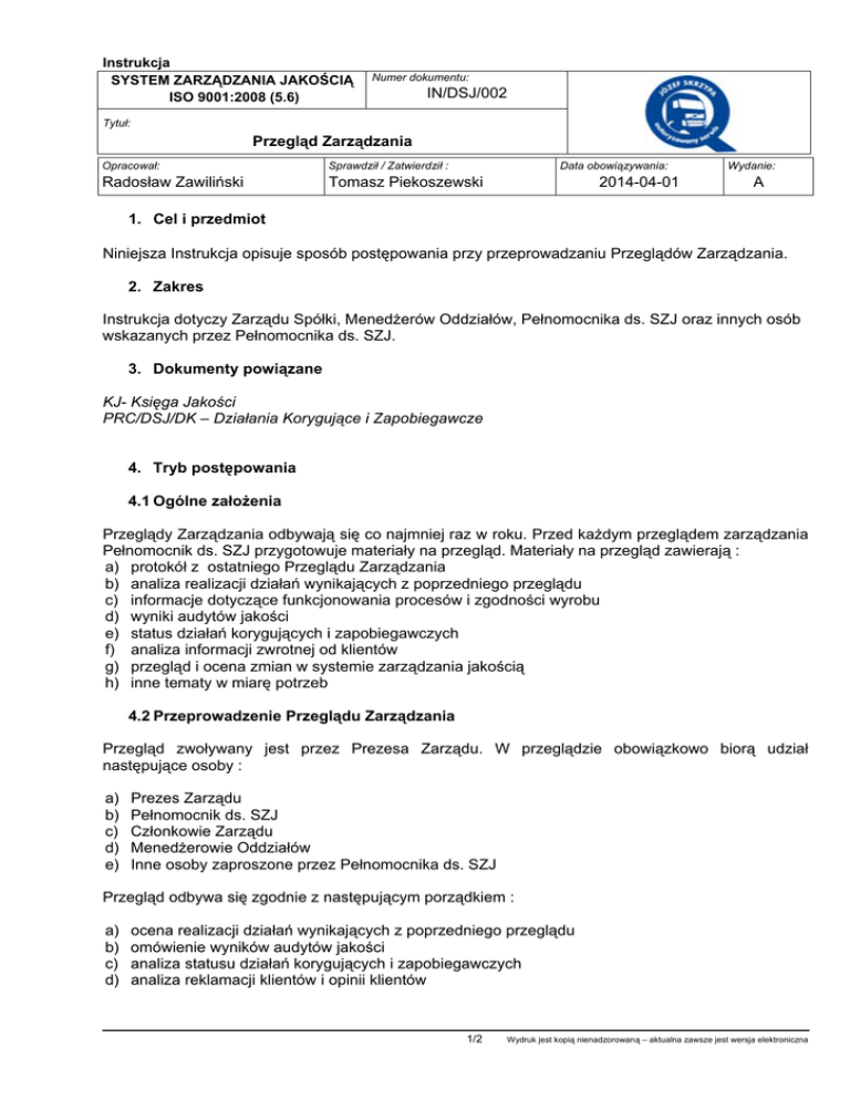Instrukcja SYSTEM ZARZĄDZANIA JAKOŚCIĄ ISO 9001:2008 (5.6) Numer dokumentu: IN/DSJ/002 Tytuł: Przegląd Zarządzania Opracował: Sprawdził / Zatwierdził : Radosław Zawiliński Tomasz Piekoszewski Data obowiązywania: 2014-04-01 Wydanie: A 1. Cel i przedmiot Niniejsza Instrukcja opisuje sposób postępowania przy przeprowadzaniu Przeglądów Zarządzania. 2. Zakres Instrukcja dotyczy Zarządu Spółki, Menedżerów Oddziałów, Pełnomocnika ds. SZJ oraz innych osób wskazanych przez Pełnomocnika ds. SZJ. 3. Dokumenty powiązane KJ- Księga Jakości PRC/DSJ/DK – Działania Korygujące i Zapobiegawcze 4. Tryb postępowania 4.1 Ogólne założenia Przeglądy Zarządzania odbywają się co najmniej raz w roku. Przed każdym przeglądem zarządzania Pełnomocnik ds. SZJ przygotowuje materiały na przegląd. Materiały na przegląd zawierają : a) protokół z ostatniego Przeglądu Zarządzania b) analiza realizacji działań wynikających z poprzedniego przeglądu c) informacje dotyczące funkcjonowania procesów i zgodności wyrobu d) wyniki audytów jakości e) status działań korygujących i zapobiegawczych f) analiza informacji zwrotnej od klientów g) przegląd i ocena zmian w systemie zarządzania jakością h) inne tematy w miarę potrzeb 4.2 Przeprowadzenie Przeglądu Zarządzania Przegląd zwoływany jest przez Prezesa Zarządu. W przeglądzie obowiązkowo biorą udział następujące osoby : a) b) c) d) e) Prezes Zarządu Pełnomocnik ds. SZJ Członkowie Zarządu Menedżerowie Oddziałów Inne osoby zaproszone przez Pełnomocnika ds. SZJ Przegląd odbywa się zgodnie z następującym porządkiem : a) b) c) d) ocena realizacji działań wynikających z poprzedniego przeglądu omówienie wyników audytów jakości analiza statusu działań korygujących i zapobiegawczych analiza reklamacji klientów i opinii klientów 1/2 Wydruk jest kopią nienadzorowaną – aktualna zawsze jest wersja elektroniczna Instrukcja SYSTEM ZARZĄDZANIA JAKOŚCIĄ ISO 9001:2008 (5.6) Numer dokumentu: IN/DSJ/002 Tytuł: Przegląd Zarządzania e) omówienie problemów pojawiających się przy współpracy z klientami i planowanie doskonalenia usług świadczonych dla klientów f) omówienie problemów jakościowych i skuteczności podjętych działań korygujących g) omówienie potrzeb szkoleniowych i realizacji opracowanego planu szkoleń h) analiza realizacji celów wynikających z Polityki Jakości firmy i) analiza wskaźników procesów j) planowanie doskonalenia systemu zarządzania jakością k) planowanie zasobów do realizacji działań wynikających z przeglądu oraz działań mających na celu doskonalenie SZJ. 4.3 Wdrożenie ustaleń z Przeglądu Zarządzania Pełnomocnik ds. SZJ opracowuje protokół z przeglądu zarządzania. Protokół obejmuje wszystkie tematy poruszone w trakcie przeglądu. Protokół jest zatwierdzany przez Właściciela firmy i przechowywany przez Pełnomocnika ds. SZJ. Po przeglądzie systemu Pełnomocnik ds. SZJ nadzoruje realizację działań dotyczących ustaleń z przeglądu. W tym celu przesyła pisemne informacje do wszystkich zainteresowanych o konieczności podjęcia działań. W ustaleniu z zainteresowanymi określa sposób i termin przeprowadzenia wymienionych powyżej działań. Pełnomocnik ds. SZJ może podjąć decyzję o wystawieniu Karty Działań Poaudytowych FO/DSJ/005 dla problemów wynikających z przeglądu wykonywanego przez kierownictwo. W takiej sytuacji postępuje zgodnie z procedura PRC/DSJ/DK – Działania Korygujące i Zapobiegawcze 5. ZAPISY Lp. Zapis 1 6. Protokół z Przeglądu Zarządzania Zasoby sieciowe oraz pokój Dyrekcji Kto jest odpowiedzialny Pełnomocnik ds. SZJ Jak długo przechowywany 3 lata OPIS ZMIAN Wydanie: A Miejsce przechowywania Opis zmiany: Nazwisko: Data aktualizacji: Utworzenie Instrukcji Zawiliński 2014-02-15 2/2 Wydruk jest kopią nienadzorowaną – aktualna zawsze jest wersja elektroniczna