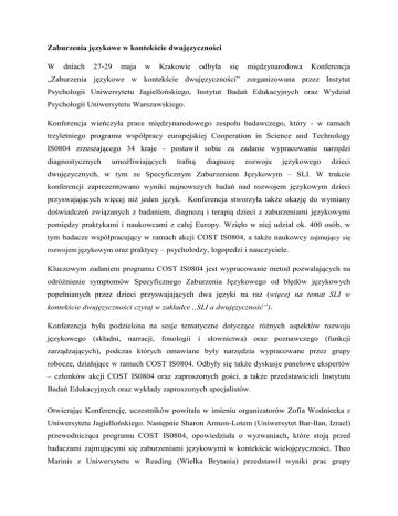 Zaburzenia językowe w kontekście dwujęzyczności W dniach 27-29 maja w Krakowie odbyła się międzynarodowa Konferencja „Zaburzenia językowe w kontekście dwujęzyczności” zorganizowana przez Instytut Psychologii Uniwersytetu Jagiellońskiego, Instytut Badań Edukacyjnych oraz Wydział Psychologii Uniwersytetu Warszawskiego. Konferencja wieńczyła prace międzynarodowego zespołu badawczego, który - w ramach trzyletniego programu współpracy europejskiej Cooperation in Science and Technology IS0804 zrzeszającego 34 kraje - postawił sobie za zadanie wypracowanie narzędzi diagnostycznych umożliwiających trafną diagnozę rozwoju językowego dzieci dwujęzycznych, w tym ze Specyficznym Zaburzeniem Językowym – SLI. W trakcie konferencji zaprezentowano wyniki najnowszych badań nad rozwojem językowym dzieci przyswajających więcej niż jeden język. Konferencja stworzyła także okazję do wymiany doświadczeń związanych z badaniem, diagnozą i terapią dzieci z zaburzeniami językowymi pomiędzy praktykami i naukowcami z całej Europy. Wzięło w niej udział ok. 400 osób, w tym badacze współpracujący w ramach akcji COST IS0804, a także naukowcy zajmujący się rozwojem językowym oraz praktycy – psycholodzy, logopedzi i nauczyciele. Kluczowym zadaniem programu COST IS0804 jest wypracowanie metod pozwalających na odróżnienie symptomów Specyficznego Zaburzenia Językowego od błędów językowych popełnianych przez dzieci przyswajających dwa języki na raz (więcej na temat SLI w kontekście dwujęzyczności czytaj w zakładce „SLI a dwujęzyczność”). Konferencja była podzielona na sesje tematyczne dotyczące różnych aspektów rozwoju językowego (składni, narracji, fonologii i słownictwa) oraz poznawczego (funkcji zarządzających), podczas których omawiane były narzędzia wypracowane przez grupy robocze, działające w ramach COST IS0804. Odbyły się także dyskusje panelowe ekspertów – członków akcji COST IS0804 oraz zaproszonych gości, a także przedstawicieli Instytutu Badań Edukacyjnych oraz wykłady zaproszonych specjalistów. Otwierając Konferencję, uczestników powitała w imieniu organizatorów Zofia Wodniecka z Uniwersytetu Jagiellońskiego. Następnie Sharon Armon-Lotem (Uniwersytet Bar-Ilan, Izrael) przewodnicząca programu COST IS0804, opowiedziała o wyzwaniach, które stoją przed badaczami zajmującymi się zaburzeniami językowymi w kontekście wielojęzyczności. Theo Marinis z Uniwersytetu w Reading (Wielka Brytania) przedstawił wyniki prac grupy zajmującej się tworzeniem zadań do badania rozwoju gramatycznego dzieci dwujęzycznych z SLI. Rezultaty prac nad narzędziami służącymi do badania różnych aspektów rozwoju gramatycznego zaprezentowali też Philippe Prévost z Uniwersytetu w Tours (Francja) i Petra Schulz z Uniwersytetu Goethego we Frankfurcie nad Menem (Niemcy). Podczas dyskusji panelowej, w której uczestniczyły również Johanne Paradis z Uniwersytetu Alberty w Kanadzie oraz Magdalena Smoczyńska z Instytutu Badań Edukacyjnych, rozmawiano o problemach w tworzeniu narzędzi do oceny kompetencji gramatycznych u dzieci przyswajających różne typologicznie języki (w tym dzieci przyswajających języki słowiańskie, np. polski). Magdalena Smoczyńska zaprezentowała również projekt „Entuzjaści Edukacji”, realizowany przez Instytut Badań Edukacyjnych, w ramach którego opracowywane są pierwsze w Polsce narzędzia do diagnozy SLI. Gośćmi specjalnymi konferencji były Kathryn Kohnert z Uniwersytetu w Minnesocie oraz Barbara Zurer Pearson z Uniwersytetu Massachussets (USA). Kathryn Kohnert wygłosiła wykład o terapii dzieci z SLI posługujących się językiem angielskim i hiszpańskim. Barbara Zurer Pearson mówiła o specyfice badań nad rozwojem językowym i zaburzeniami językowymi w kontekście różnic dialektalnych. Perspektywa międzykulturowa była też obecna w wykładzie Elin Thordardottir z Uniwersytetu McGill w Montrealu (Kanada) i Akademii w Rejkiawiku (Islandia), która zwróciła uwagę na to, jak istotne jest tworzenie metod diagnostycznych w różnych językach, które mogą być ze sobą porównywane, oraz w wystąpieniu Haliny Grzymały-Moszczyńskiej (UJ), odnoszącej się do wielokulturowości w kontekście polskim, a w szczególności do konieczności uwzględniania tego kontekstu w diagnozie psychologicznej. Podczas dwóch sesji plakatowych zaprezentowano blisko 80 plakatów, dotyczących badań nad rozwojem słownictwa, znajomości składni i morfologii, umiejętności narracyjnych a także rozwoju poznawczego, i fonologicznego Większość plakatów prezentowała badania przeprowadzone w ramach współpracy w programie COST IS0804. Zarówno w pierwszym wystąpieniu przewodniczącej programu, Sharon Armon-Lotem, jak i podczas dyskusji panelowych podkreślano, że dzieci dwujęzyczne powinny być badane w obydwu językach, którymi się posługują oraz że spełnienie tego postulatu jest w praktyce bardzo trudne. Zwracano uwagę, że o zaburzeniach językowych u dzieci dwujęzycznych można mówić, jeśli deficyty występują w obydwu z przyswajanych języków. Podkreślano też, że ważnym czynnikiem wpływającym na rozwój językowy dziecka może być status społeczno- ekonomiczny i że narzędzia służące do diagnozy powinny ten czynnik uwzględniać, a ponadto brać pod uwagę różnice kulturowe oraz czas jaki dzieci spędzają używając każdego z przyswajanych przez nie języków. Przypominano, że nadrzędnym celem nie jest samo stawianie diagnozy, ale raczej podejmowanie decyzji, czy potrzebna jest interwencja i terapia, a jeśli tak, to w jaki sposób powinna być ona dobrana, by najlepiej wspierać rozwój dzieci. Konferencja w Krakowie zgromadziła specjalistów z różnorodnych środowisk i krajów. Umożliwiła ona spotkanie się naukowców i praktyków oraz dyskusję na temat dalszej współpracy nad tworzeniem narzędzi badawczych i di