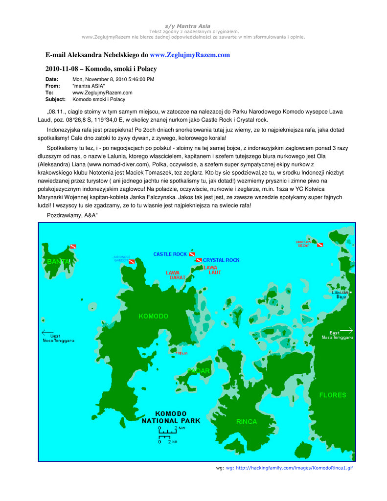 ! !"#$%&'()&$*!+&$ "#$%&!'()*+,!'!+-*#%.-+,/!)0,(1+-.#/2! 33324#(567/,8-'#/!+1#!91#0'#!:-*+#7!)*;)31#*'1-5+)<=1!'-!'-3-0&#!3!+1/!%>)0/6.)3-+1-!1!);1+1#2! ! E-mail Aleksandra Nebelskiego do www.ZeglujmyRazem.com 2010-11-08 – Komodo, smoki i Polacy Date: From: To: Subject: Mon, November 8, 2010 5:46:00 PM "mantra ASIA" www.ZeglujmyRazem.com Komodo smoki i Polacy „08.11., ciagle stoimy w tym samym miejscu, w zatoczce na nalezacej do Parku Narodowego Komodo wysepce Lawa Laud, poz. 08°26,8 S, 119°34,0 E, w okolicy znanej nurkom jako Castle Rock i Crystal rock. Indonezyjska rafa jest przepiekna! Po 2och dniach snorkelowania tutaj juz wiemy, ze to najpiekniejsza rafa, jaka dotad spotkalismy! Cale dno zatoki to zywy dywan, z zywego, kolorowego korala! Spotkalismy tu tez, i - po negocjacjach po polsku! - stoimy na tej samej bojce, z indonezyjskim zaglowcem ponad 3 razy dluzszym od nas, o nazwie Lalunia, ktorego wlascicielem, kapitanem i szefem tutejszego biura nurkowego jest Ola (Aleksandra) Liana (www.nomad-diver.com), Polka, oczywiscie, a szefem super sympatycznej ekipy nurkow z krakowskiego klubu Nototenia jest Maciek Tomaszek, tez zeglarz. Kto by sie spodziewal,ze tu, w srodku Indonezji niezbyt nawiedzanej przez turystow ( ani jednego jachtu nie spotkalismy tu, jak dotad!) wezmiemy prysznic i zimne piwo na polskojezycznym indonezyjskim zaglowcu! Na poladzie, oczywiscie, nurkowie i zeglarze, m.in. 1sza w YC Kotwica Marynarki Wojennej kapitan-kobieta Janka Falczynska. Jakos tak jest jest, ze zawsze wszedzie spotykamy super fajnych ludzi! I wszyscy tu sie zgadzamy, ze to tu wlasnie jest najpiekniejsza na swiecie rafa! Pozdrawiamy, A&A”!! ! 3(?!3(?!@&&;?AA@-=$1+(>-/15,2=)/A1/-(#%AB)/)*)81+=-C2(1>!