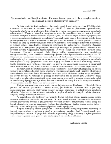 grudzień 2014 Sprawozdanie z realizacji projektu „Poprawa jakości pracy szkoły z uwzględnieniem specjalnych potrzeb edukacyjnych uczniów” W listopadzie 2014 roku odbyłam obserwację typu job shadowing w szkole IES Miguel de Cervantes w Mostoles w Hiszpanii. Jak już zostało to ujęte w poprzednim sprawozdaniu, hiszpańska placówka ma wieloletnie doświadczenie w pracy z uczniami o specjalnych potrzebach edukacyjnych. Wizyta w Mostoles zainspirowała mnie do poszukiwań nowych metod i technik nauczania nie tylko w pracy z uczniami z dysfunkcjami, ale również z tymi nieposiadającymi opinii i orzeczeń o potrzebie kształcenia specjalnego. To co zachwyciło mnie w hiszpańskiej szkole, to na pewno praktyczne podejście stosowane na każdym kroku. Uczniowie liceum Miguel de Cervantes w Mostoles uczą się przede wszystkim przez doświadczenie, metodami projektowymi, korzystając z różnych źródeł, samodzielnie poszukując informacji do realizowanych projektów. Rzadziej proszeni są o pamięciowe przyswajanie informacji zawartych w podręcznikach. Placówka ma również świetne wyposażenie technologiczne. W wielu salach na wszystkich ławkach stoją komputery, Hiszpanie dysponują dużą ilością tablic interaktywnych oraz specjalnym oprogramowaniem, które umożliwia tworzenie projektów online i prowadzenie wirtualnych klas. W Hiszpanii po raz pierwszy miałam okazję zobaczyć, jak funkcjonuje wirtualna klasa. Wspomniana technologia wykorzystywana jest np. w nauczaniu matematyki uczniów o specjalnych potrzebach edukacyjnych. Dzięki programowi uczeń wykonujący ćwiczenia ma od razu informację zwrotną, każde ćwiczenie może wykonać wiele razy, co ułatwia mu opanowanie materiału, a nauczyciel może kontrolować ile razy uczeń próbował rozwiązać dane ćwiczenie i ile czasu na to poświęcił. Postanowiłam skorzystać z doświadczenia Hiszpanów i założyłam wirtualną klasę dla moich uczniów na portalu zondle.com. Portal umożliwia tworzenie gier językowych i quizów. Ma również atrakcyjną dla młodzieży formę. Uczniowie rozwiązując quizy, zdobywają punkty, mogą podglądać, na którym miejscu w rankingu się plasują, co mobilizuje ich do dalszej gry. Uczniowie mogą korzystać z portalu codziennie, dzięki czemu mają szansę przyswoić wymagane przeze mnie treści w sposób łatwy i przyjemny, a ja wiem, ile czasu poświęcili na naukę. Z portalu korzystam również, aby urozmaicać niektóre lekcje, np. powtórzeniowe. Kolejną wprowadzoną przeze mnie innowacją jest grupa na Facebooku „I liceali del Bem parlano in italiano (Licealiści z Bema mówią po włosku)”. Powstała ona z potrzeby zaproponowania uczniom zdobywania wiedzy poprzez obcowanie z autentycznym językiem włoskim. Pojawiają się tam ciekawe materiały w języku włoskim tj. teledyski, teksty piosenek, artykuły, memy, zwiastuny filmów itd. W przyszłości, gdy dojdziemy do tematyki kuchni włoskiej planuję zaproponować moim uczniom wykonanie projektów na ten temat. W imię nauki poprzez doświadczenie uczniowie zostaną poproszenie również o przygotowanie włoskich potraw i przyniesienie ich na lekcję, na której odbędzie się wspólna degustacja. Kuchnia jest nieodłączną i bardzo istotną częścią kultury włoskiej i warto poświęcić jej wiele uwagi podczas nauki tego języka. Chętnie dzielę się moimi pomysłami i doświadczeniem zdobytym podczas obserwacji z innymi nauczycielami – podczas spotkań z uczestnikami projektu, Rad Pedagogicznych oraz indywidualnych rozmów. W przyszłości chętnie poprowadzę lekcję pokazową z wykorzystaniem opracowanych przeze mnie quizów i gier edukacyjnych na portalu zondle.com. Aleksandra Lasota