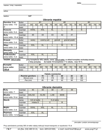 data nazwa / imię i nazwisko adres NIP telefon Ubranie męskie Garnitur 3 cz. cena netto: 110 zł kolor rozmiar ilość Koszula rozmiar cena netto: 9 zł ilość Buty rozmiar cena netto: 15 zł ilość Krawat kolor cena netto: 3 zł ilość Slipy rozmiar cena netto: 2 zł ilość Skarpety ilość cena netto: 1 zł Podkoszulka rozmiar cena netto: 4 zł ilość RAZEM: 144 zł netto Komplet cena netto: 130 zł 84 #1 82 80 78 76 #2 82 80 84 78 XXXL XXL XL L M 45 44 43 42 41 szary czarny poł. granat XXL XL L XXL XL L 76 84 #3 82 80 78 76 S granat paski M S przy komplecie 10% rabatu, cena: 130 zł netto, w skład kompletu wchodzą towary z listy powyżej. Za każde 10 kompletów 1 % rabatu, max 10 % kolor rozmiar ilość 84 82 #1 80 78 76 84 82 #2 80 78 76 84 82 #3 80 78 76 Tabela rozmiarów Rozmiar garnituru Wzrost (cm) Pas (cm) 76 176 80 78 178 88 80 180 92 82 182 96 84 184 102 Ubranie damskie Buty cena netto: 7 rozmiar ilość Bluzka rozmiar cena netto 19 zł ilość Stanik cena rozmiar ilość Majtki rozmiar cena netto: 2 zł ilość Rajstopy rozmiar cena netto: 1,9 zł ilość 40 XXL/52 39 38 37 XL/50 L/48 M/46 6,5 zł netto miska D 36 5 zł netto C XXXL XXL XXL XL B XL L S pieczątka i podpis zamawiającego Przy zamówieniu poniżej 300 zł netto należy doliczyć koszt transportu w wysokości 15 zł 7&7 tel./fax. (54) 280 55 31, kom. 609 619 903, e-mail: [email protected] www.pog77.pl