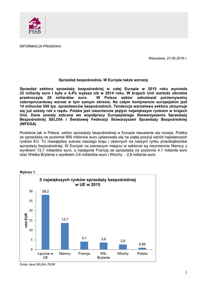 INFORMACJA PRASOWA Warszawa, 27.06.2016 r. Sprzedaż bezpośrednia. W Europie także wzrosty Sprzedaż sektora sprzedaży bezpośredniej w całej Europie w 2015 roku wyniosła 32 miliardy euro i była o 4,4% wyższa niż w 2014 roku. W krajach Unii wartość obrotów przekroczyła 28 miliardów euro. W Polsce sektor odnotował porównywalny czteroprocentowy wzrost w tym samym okresie. Na całym kontynencie europejskim jest 14 milionów 550 tys. sprzedawców bezpośrednich. Tendencja wzrostowa sektora utrzymuje się już szósty rok z rzędu. Polska jest niezmiennie piątym największym rynkiem w krajach Unii. Dane zostały zebrane we współpracy Europejskiego Stowarzyszenia Sprzedaży Bezpośredniej SELDIA i Światowej Federacji Stowarzyszeń Sprzedaży Bezpośredniej (WFDSA) Podobnie jak w Polsce, sektor sprzedaży bezpośredniej w Europie nieustanie się rozwija. Polska ze sprzedażą na poziomie 956 milionów euro uplasowała się na piątej pozycji wśród największych rynków EU. To niewątpliwy sukces naszego kraju i obecnych na naszym rynku przedsiębiorstw sprzedaży bezpośredniej. W Europie na pierwszym miejscu w sektorze są niezmiennie Niemcy z wynikiem 13,7 miliardów euro, a następnie Francja ze sprzedażą na poziomie 4,1 miliarda euro oraz Wielka Brytania z wynikiem 3,6 miliardów euro i Włochy - 2,6 miliarda euro. Wykres 1. 5 największych rynków sprzedaży bezpośredniej w UE w 2015 30 28,2 25 mld EUR 20 13,7 15 10 4,1 5 3,6 2,6 0,95 0 Łącznie w UE Niemcy Francja Wlk. Brytania Włochy Polska Źródło: dane SELDIA, PSSB 1 W 2015 roku z firmami sprzedaży bezpośredniej w całej Europie współpracowało 14,5 miliona osób. Profil sprzedawcy nie uległ zmianie – dominują przede wszystkim kobiety, które stanowią 80% ogółu sprzedawców bezpośrednich. W Polsce jest to 86%. Struktura sprzedawców bezpośrednich ze względu na płeć w Europie w 2015 20% Kobiety Mężczyźni 80% Źródło: dane SELDIA, PSSB *********************************************************************** PSSB – Polskie Stowarzyszenie Sprzedaży Bezpośredniej działa od 1994 roku i grupuje kilkadziesiąt przedsiębiorstw prowadzących sprzedaż bezpośrednią na terenie Polski oraz firmy spoza branży. Ich łączny udział w rynku przekracza 65%. Główne cele Stowarzyszenia to m. in.: stanowienie etycznych standardów sprzedaży i monitorowanie ich przestrzegania przez firmy członkowskie, dotyczy to także zasad „Kodeksu Sprzedaży Bezpośredniej PSSB”, promocja i stały rozwój tego kanału dystrybucji, podnoszenie poziomu wiedzy społeczeństwa na temat sprzedaży bezpośredniej, wyjaśnianie jej ekonomicznego znaczenia i zalet dla klientów, oraz prezentowanie w kontaktach zewnętrznych stanowiska członków Stowarzyszenia w sprawach istotnych dla sektora sprzedaży bezpośredniej. Stowarzyszenie aktywnie działa także w obszarze edukacji i wspierania idei przedsiębiorczości wśród młodzieży i studentów, współpracując z kilkoma wyższymi uczelniami ekonomicznymi w kraju. Lista firm zrzeszonych w PSSB: Członkowie wspierający: ACN Communications Polska Sp. z o.o., Amway Polska Sp. z o.o., Arbonne Europe Sàrl, Avon Cosmetics Polska Sp. z o.o., Betterware Poland Limited Sp. z o.o., DLF Sp. z o.o., Energetyczne Centrum S.A., 2 Flavon Group Polska Sp. z o.o., Forever Living Products Poland Sp. z o.o., Herbalife Polska Sp. z o.o., JUST Polska Sp. z o.o., LR Health and Beauty Sp. z o.o., Mary Kay Cosmetics Poland Sp. z o.o., NSA GmbH, Nu Skin Enterprises Poland Sp. z o.o., Oriflame Poland Sp. z o.o., Partylite Sp. z o.o., Vorwerk Polska Sp. z o.o., Zepter International Poland Sp. z o.o., Członkowie pozabranżowi: Brian Tracy International, FranklinCovey Sp. z o.o., General Avdisors, InSee Sp. z o.o., epoint SA, PostNord Fulfilment Sp. z o.o. Członkowie oczekujący: TIENS Sp. z o.o., Zinzino Sp. z o.o., Nature’s Sunshine Products Poland Sp. z o.o.. PSSB jest członkiem Europejskiego Stowarzyszenia Sprzedaży Bezpośredniej SELDIA, Światowej Federacji Stowarzyszeń Sprzedaży Bezpośredniej (WFDSA), Konfederacji Lewiatan i Federacji Konsumentów. Więcej informacji na www.pssb.pl. 3