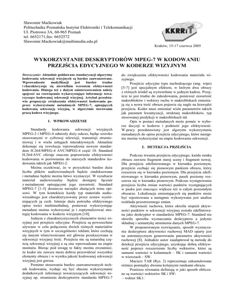 Sławomir Maćkowiak Politechnika Poznańska Instytut Elektroniki i Telekomunikacji Ul. Piotrowo 3A, 60-965 Poznań tel. 6652171,fax: 6652572 [email protected] Kraków, 15-17 czerwca 2005 WYKORZYSTANIE DESKRYPTORÓW MPEG-7 W KODOWANIU PRZEJŚCIA EDYCYJNEGO W KODERZE WIZYJNYM Streszczenie: Aktualnie poddawane standaryzacji algorytmy kodowania sekwencji wizyjnych są bardzo zaawansowane. Wprowadzenie modyfikacji jest bardzo trudne i charakteryzuje się niewielkim wzrostem efektywności kodowania. Dlatego też z dużym zainteresowaniem należy spojrzeć na rozwiązania wykorzystujące informacje towarzyszące kodowanej sekwencji wizyjnej. Artykuł przedstawia propozycje zwiększenia efektywności kodowania poprzez wykorzystanie metadanych MPEG-7, opisujących kodowaną sekwencję wizyjną, w algorytmie sterowania pracą kodera wizyjnego. 1. WPROWADZENIE Standardy kodowania sekwencji wizyjnych MPEG-2 i MPEG-4 odniosły duży sukces, będąc szeroko stosowanymi w cyfrowej telewizji, transmisji strumieniowej i w wielu usługach interaktywnych. Aktualnie dokonuje się rewolucja wprowadzona nowym standardem H.264/MPEG-4 AVC/MPEG-4 część 10. Standard H.264/AVC oferuje znaczne poprawienie efektywności kodowania w porównaniu do starszych standardów kodowania takich jak MPEG-2. Można oczekiwać, że w przyszłości bardzo duża liczba plików audiowizualnych będzie zindeksowana i metadane będzie można łatwo wyznaczyć. W rezultacie materiał audiowizualny będzie dostępny łącznie z metadanymi opisującymi jego zawartość. Standard MPEG-7 [1-3] dostarcza narzędzi służących temu opisowi. W tym kontekście każdy typ materiału audiowizualnego jest charakteryzowany przez zestaw wyróżniających ją cech. Istnieje duża potrzeba efektywnego opisu treści multimedialnej, ponieważ wykorzystując metadane można wykorzystać je i zoptymalizować strategię kodowania w koderze wizyjnym [10]. Jednym z charakterystycznych elementów treści wizyjnej jest przejście edycyjne. Przejścia są powszechnie używane w celu połączenia dwóch różnych materiałów wizyjnych w tym w szczególności reklam, które cechują się innymi właściwościami niż główna przekazywana w sekwencji wizyjnej treść. Przejścia nie są naturalną częścią sekwencji wizyjnej a są one wprowadzane na etapie montażu. Biorąc pod uwagę te fakty można zrozumieć, że koder nie zawsze może dobrze przewidzieć wszystkie elementy obrazu i w wyniku jakość kodowanej sekwencji wizyjnej jest gorsza. Pomimo stosowania bardzo zaawansowanych technik kodowania, wydaje się być słuszne wykorzystanie dodatkowych informacji towarzyszących sekwencji wizyjnej np. strumienia deskryptorów standardu MPEG-7 do zwiększenia efektywności kodowania materiału wizyjnego. Przejście edycyjne typu nachodzącego (ang. wipe) [5-7] jest specjalnym efektem, w którym dwa obrazy z różnych źródeł są wyświetlane w jednym kadrze. Przejście to jest trudne do zakodowania, ponieważ zawartość makrobloków i wektory ruchu w makroblokach zmieniają się a nowa treść obrazu pojawia się nagle na krawędzi przejścia. Koder musi zmieniać wiele parametrów takich jak parametr kwantyzacji, strukturę makrobloków, typ stosowanej predykcji w makroblokach itd. Opis w postaci metadanych może pomóc w wyborze decyzji w koderze i podnieść jego efektywność. W pracy przedstawiony jest algorytm wykorzystania metadanych do opisu przejścia edycyjnego, które następnie można wykorzystać na etapie kodowania sekwencji. 2. DETEKCJA PRZEJŚCIA Podczas trwania przejścia edycyjnego, każda ramka obrazu zawiera fragment starej sceny i fragment nowej. Dla przejścia zdefiniowanego w kierunku poziomym, przejście cechuje się pionowym paskiem obrazu, który rozszerza się w kierunku poziomym. Dla przejścia zdefiniowanego w kierunku pionowym, pasek poziomy rozszerza się w kierunku pionowym. Podczas występowania przejścia liczba zmian wartości punktów występujących w pasku jest znacząco większa niż w całym pozostałym obszarze. Lokalizacja zmieniających się punktów może być rejestrowana a następnie wykonywana jest analiza rozkładu przestrzennego zmian. Aktywność ruchowa, która określa stopień aktywności punktów w sekwencji wizyjnej została zdefiniowana jako deskryptor w standardzie MPEG-7. Standard nie określa sposobu wyznaczania deskryptora a jedynie składnię i semantykę strumienia danych MPEG-7. W proponowanym rozwiązaniu, sposób wyznaczania deskryptora aktywności ruchowej MAD oparty jest na automatycznym generowaniu parametru aktywności ruchowej [8]. Jednakże autor zaadaptował tą metodę do detekcji przejścia edycyjnego, uzyskując dobrą efektywność poprzez rozszerzenie liczby wektorów, które są sumami wartości w kolumnach – SK i sumami wartości w wierszach – SW. Macierz TAR (Rys. 2) reprezentuje zakumulowane różnice pomiędzy dwoma kolejnymi ramkami obrazu. Poniższe równania definiują w jaki sposób obliczane są wartości wektorów SK i SW: - wektor SK1: N N 1 1 N2 1 2 2 SK1 ai1 , ai 2 , , aiM i 0 i 0 i 0 (1) - wektor SK2: N N N SK 2 ai1 , ai 2 , , aiM N N i N i i 2 2 2 Cały obraz podzielony jest na dwa obszary, lewy i prawy. W proponowanym algorytmie, deskryptor koloru dominującego jest niezależnie obliczany dla każdego regionu. Jeżeli skwantowane wartości kolorów dominujących przekraczają próg, przejście edycyjne jest wykrywane. (2) Ramka n-1 - a wektor SW1: M M 1 1 M2 1 2 2 SW1 a1 j , a2 j , , a Nj j 0 j 0 j 0 Ramka n (3) + - wektor SW2: M M M SW2 a1 j , a2 j , , aNj N N j N j j 2 2 2 - TAR (4) SW1 SW2 gdzie: aij – zakumulowane różnice pomiędzy dwoma kolejnymi obrazami, M – rozdzielczość pozioma obrazu, N – rozdzielczość pionowa obrazu. Analiza dwóch wektorów SK poprzedzona jest analizą całkowitej aktywności ruchu w obrazie. Wyniki eksperymentalne pokazują, że ten parametr mocno zależy od treści sekwencji. Lokalizacja poruszającej się kraw