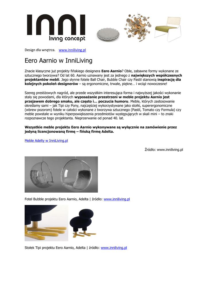 Design dla wnętrza. www.inniliving.pl Eero Aarnio w InniLiving Znacie klasyczne już projekty fińskiego designera Eero Aarnio? Obłe, zabawne formy wykonane ze sztucznego tworzywa? Od lat 60. Aarnio uznawany jest za jednego z największych współczesnych projektantów mebli. Jego słynne fotele Ball Chair, Bubble Chair czy Pastil stanowią inspirację dla kolejnych pokoleń designerów – są ergonomiczne, trwałe, piękne… i wciąż nowoczesne! Szereg prestiżowych nagród, ale przede wszystkim interesująca forma i najwyższej jakości wykonanie stały się powodami, dla których wyposażanie przestrzeni w meble projektu Aarnio jest przejawem dobrego smaku, ale często i… poczucia humoru. Meble, których zastosowanie określamy sami – jak Tipi czy Pony, najczęściej wykorzystywane jako stołki, superergonomiczne (wbrew pozorom) fotele w całości wykonane z tworzywa sztucznego (Pastil, Tomato czy Formula) czy meble powstałe w wyniku hiperpowiększenia przedmiotów występujących w skali mini – to znaki rozpoznawcze tego projektanta. Nieprzerwanie od ponad 40. lat. Wszystkie meble projektu Eero Aarnio wykonywane są wyłącznie na zamówienie przez jedyną licencjonowaną firmę – fińską firmę Adelta. Meble Adelty w InniLiving.pl Źródło: www.inniliving.pl Fotel Bubble projektu Eero Aarnio, Adelta | źródło: www.inniliving.pl Stołek Tipi projektu Eero Aarnio, Adelta | źródło: www.inniliving.pl