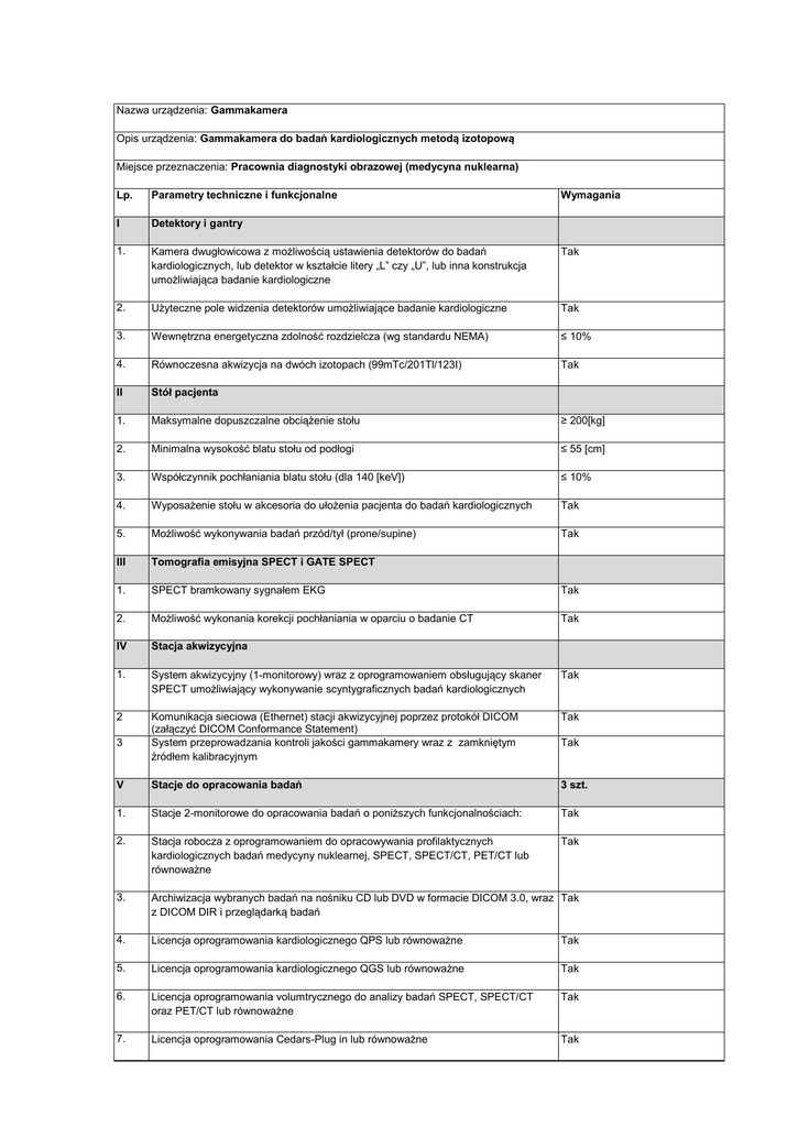Nazwa urządzenia: Gammakamera Opis urządzenia: Gammakamera do badań kardiologicznych metodą izotopową Miejsce przeznaczenia: Pracownia diagnostyki obrazowej (medycyna nuklearna) Lp. Parametry techniczne i funkcjonalne I Detektory i gantry 1. Kamera dwugłowicowa z możliwością ustawienia detektorów do badań kardiologicznych, lub detektor w kształcie litery „L” czy „U”, lub inna konstrukcja umożliwiająca badanie kardiologiczne Tak 2. Użyteczne pole widzenia detektorów umożliwiające badanie kardiologiczne Tak 3. Wewnętrzna energetyczna zdolność rozdzielcza (wg standardu NEMA) ≤ 10% 4. Równoczesna akwizycja na dwóch izotopach (99mTc/201Tl/123I) Tak II Stół pacjenta 1. Maksymalne dopuszczalne obciążenie stołu ≥ 200[kg] 2. Minimalna wysokość blatu stołu od podłogi ≤ 55 [cm] 3. Współczynnik pochłaniania blatu stołu (dla 140 [keV]) ≤ 10% 4. Wyposażenie stołu w akcesoria do ułożenia pacjenta do badań kardiologicznych Tak 5. Możliwość wykonywania badań przód/tył (prone/supine) Tak III Tomografia emisyjna SPECT i GATE SPECT 1. SPECT bramkowany sygnałem EKG Tak 2. Możliwość wykonania korekcji pochłaniania w oparciu o badanie CT Tak IV Stacja akwizycyjna 1. System akwizycyjny (1-monitorowy) wraz z oprogramowaniem obsługujący skaner SPECT umożliwiający wykonywanie scyntygraficznych badań kardiologicznych Tak 2 Komunikacja sieciowa (Ethernet) stacji akwizycyjnej poprzez protokół DICOM (załączyć DICOM Conformance Statement) System przeprowadzania kontroli jakości gammakamery wraz z zamkniętym źródłem kalibracyjnym Tak V Stacje do opracowania badań 3 szt. 1. Stacje 2-monitorowe do opracowania badań o poniższych funkcjonalnościach: Tak 2. Stacja robocza z oprogramowaniem do opracowywania profilaktycznych kardiologicznych badań medycyny nuklearnej, SPECT, SPECT/CT, PET/CT lub równoważne Tak 3. Archiwizacja wybranych badań na nośniku CD lub DVD w formacie DICOM 3.0, wraz Tak z DICOM DIR i przeglądarką badań 4. Licencja oprogramowania kardiologicznego QPS lub równoważne Tak 5. Licencja oprogramowania kardiologicznego QGS lub równoważne Tak 6. Licencja oprogramowania volumtrycznego do analizy badań SPECT, SPECT/CT oraz PET/CT lub równoważne Tak 7. Licencja oprogramowania Cedars-Plug in lub równoważne Tak 3 Wymagania Tak 8. Oprogramowanie do korekty ruchomości w badaniach SPECT lub równoważne Tak 9. Oprogramowanie umożliwiające porównanie dwóch badań SPECT w 3 płaszczyznach lub równoważne Tak 10. Oprogramowanie umożliwiające analizę „pierwszego przejścia” w badaniach kardiologicznych lub równoważne Tak 11. Oprogramowanie umożliwiające analizę frakcji wyrzutowej w planarnych badaniach „puli krwi” lub równoważne Tak 12. Oprogramowanie kardiologiczne umożliwiające analizę „L-R Shunt” lub równoważne Tak 13. Szkolenie z zakresu obsługi oprogramowania oraz dostosowanie protokołów dla potrzeb użytkownika Tak 14. Automatyczna fuzja obrazów 3D SPECT, CT, i innych (w tym PET, MR) Tak 15. Oprogramowanie do korekcji pochłaniania (attenuation corrections) z wykorzystaniem badania CT Tak 16. Stacje funkcjonują w modelu „klient-serwer”, umożliwiając podłączenie kolejnych użytkowników Tak 17. Narzędzia do tworzenia i uruchamiania własnych procedur do opracowania wyników Tak 18. Komunikacja sieciowa (Ethernet) stacji roboczej do opracowania badań poprzez protokół DICOM (z DICOM Conformance Statement) Tak