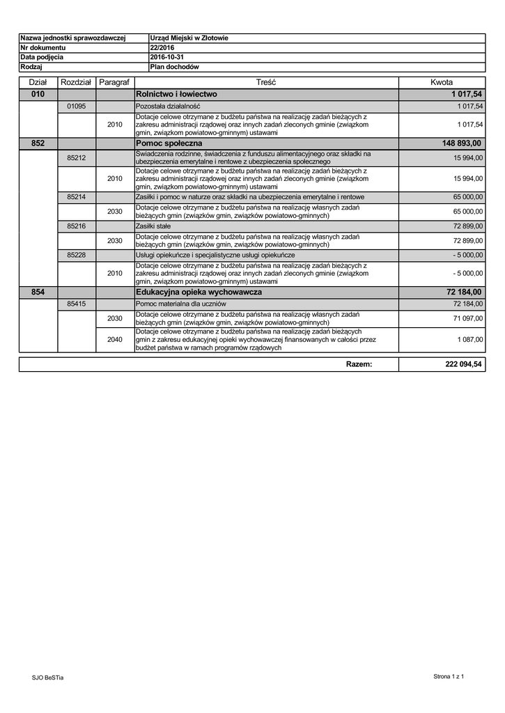Nazwa jednostki sprawozdawczej Nr dokumentu Data podjęcia Rodzaj Dział 010 Rozdział Paragraf 852 01095 85216 85228 85415 Treść Kwota 1 017,54 2010 Dotacje celowe otrzymane z budżetu państwa na realizację zadań bieżących z zakresu administracji rządowej oraz innych zadań zleconych gminie (związkom gmin, związkom powiatowo-gminnym) ustawami 2010 Świadczenia rodzinne, świadczenia z funduszu alimentacyjnego oraz składki na ubezpieczenia emerytalne i rentowe z ubezpieczenia społecznego Dotacje celowe otrzymane z budżetu państwa na realizację zadań bieżących z zakresu administracji rządowej oraz innych zadań zleconych gminie (związkom gmin, związkom powiatowo-gminnym) ustawami Zasiłki i pomoc w naturze oraz składki na ubezpieczenia emerytalne i rentowe Pomoc społeczna 2030 2030 2010 854 Rolnictwo i łowiectwo Pozostała działalność 85212 85214 Urząd Miejski w Złotowie 22/2016 2016-10-31 Plan dochodów Dotacje celowe otrzymane z budżetu państwa na realizację własnych zadań bieżących gmin (związków gmin, związków powiatowo-gminnych) Zasiłki stałe Dotacje celowe otrzymane z budżetu państwa na realizację własnych zadań bieżących gmin (związków gmin, związków powiatowo-gminnych) Usługi opiekuńcze i specjalistyczne usługi opiekuńcze Dotacje celowe otrzymane z budżetu państwa na realizację zadań bieżących z zakresu administracji rządowej oraz innych zadań zleconych gminie (związkom gmin, związkom powiatowo-gminnym) ustawami Edukacyjna opieka wychowawcza 2030 2040 Pomoc materialna dla uczniów Dotacje celowe otrzymane z budżetu państwa na realizację własnych zadań bieżących gmin (związków gmin, związków powiatowo-gminnych) Dotacje celowe otrzymane z budżetu państwa na realizację zadań bieżących gmin z zakresu edukacyjnej opieki wychowawczej finansowanych w całości przez budżet państwa w ramach programów rządowych Razem: SJO BeSTia 1 017,54 1 017,54 148 893,00 15 994,00 15 994,00 65 000,00 65 000,00 72 899,00 72 899,00 - 5 000,00 - 5 000,00 72 184,00 72 184,00 71 097,00 1 087,00 222 094,54 Strona 1 z 1