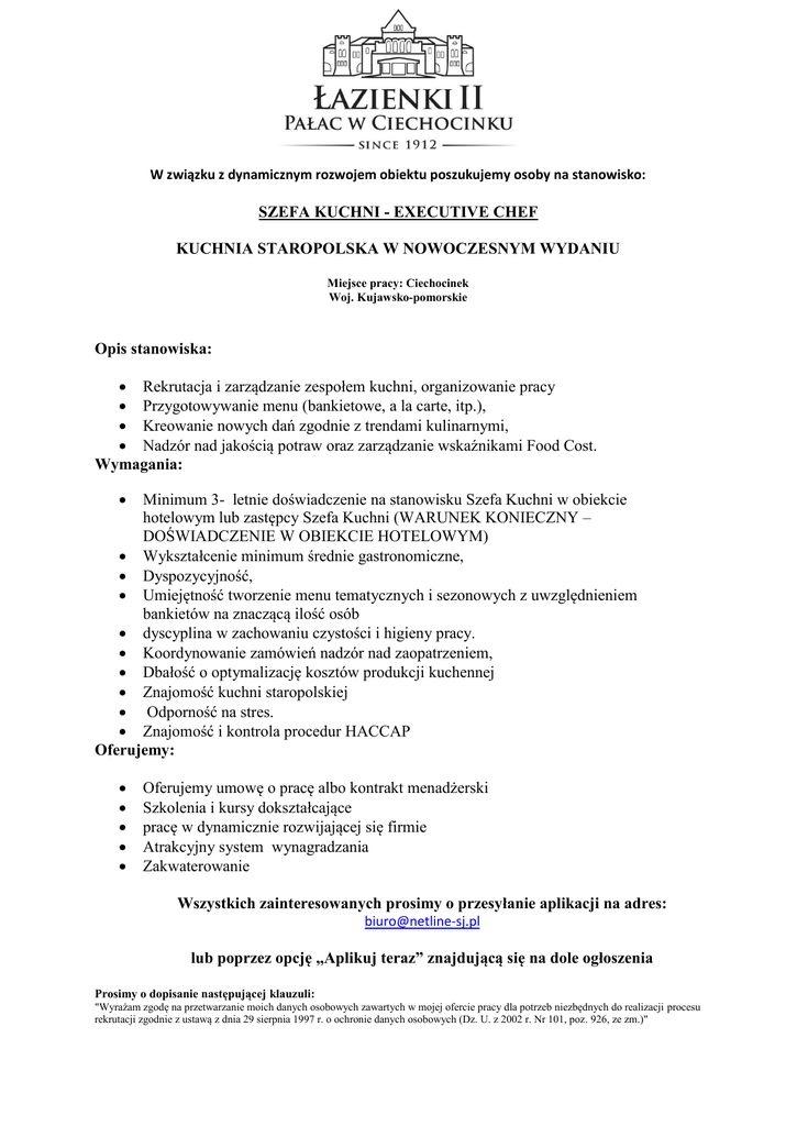 W związku z dynamicznym rozwojem obiektu poszukujemy osoby na stanowisko: SZEFA KUCHNI - EXECUTIVE CHEF KUCHNIA STAROPOLSKA W NOWOCZESNYM WYDANIU Miejsce pracy: Ciechocinek Woj. Kujawsko-pomorskie Opis stanowiska: Rekrutacja i zarządzanie zespołem kuchni, organizowanie pracy Przygotowywanie menu (bankietowe, a la carte, itp.), Kreowanie nowych dań zgodnie z trendami kulinarnymi, Nadzór nad jakością potraw oraz zarządzanie wskaźnikami Food Cost. Wymagania: Minimum 3- letnie doświadczenie na stanowisku Szefa Kuchni w obiekcie hotelowym lub zastępcy Szefa Kuchni (WARUNEK KONIECZNY – DOŚWIADCZENIE W OBIEKCIE HOTELOWYM) Wykształcenie minimum średnie gastronomiczne, Dyspozycyjność, Umiejętność tworzenie menu tematycznych i sezonowych z uwzględnieniem bankietów na znaczącą ilość osób dyscyplina w zachowaniu czystości i higieny pracy. Koordynowanie zamówień nadzór nad zaopatrzeniem, Dbałość o optymalizację kosztów produkcji kuchennej Znajomość kuchni staropolskiej Odporność na stres. Znajomość i kontrola procedur HACCAP Oferujemy: Oferujemy umowę o pracę albo kontrakt menadżerski Szkolenia i kursy dokształcające pracę w dynamicznie rozwijającej się firmie Atrakcyjny system wynagradzania Zakwaterowanie Wszystkich zainteresowanych prosimy o przesyłanie aplikacji na adres: [email protected] lub poprzez opcję „Aplikuj teraz” znajdującą się na dole ogłoszenia Prosimy o dopisanie następującej klauzuli: "Wyrażam zgodę na przetwarzanie moich danych osobowych zawartych w mojej ofercie pracy dla potrzeb niezbędnych do realizacji procesu rekrutacji zgodnie z ustawą z dnia 29 sierpnia 1997 r. o ochronie danych osobowych (Dz. U. z 2002 r. Nr 101, poz. 926, ze zm.)"