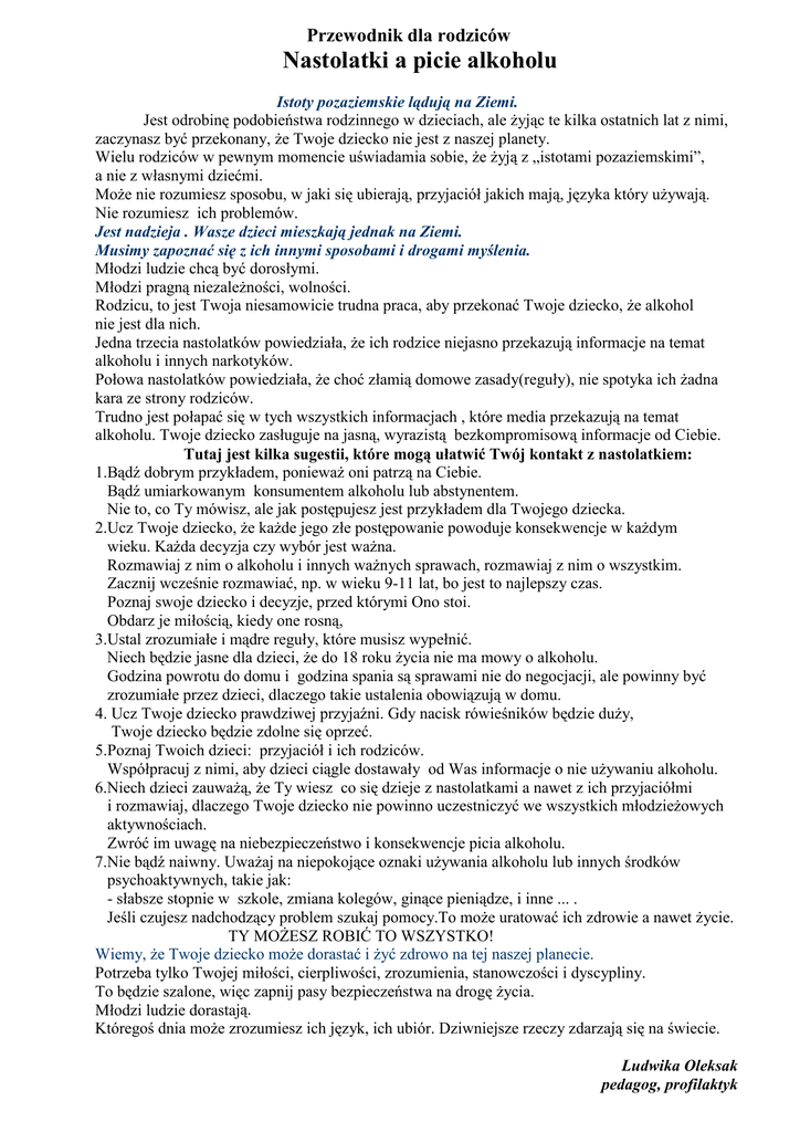 Przewodnik dla rodziców Nastolatki a picie alkoholu Istoty pozaziemskie lądują na Ziemi. Jest odrobinę podobieństwa rodzinnego w dzieciach, ale Ŝyjąc te kilka ostatnich lat z nimi, zaczynasz być przekonany, Ŝe Twoje dziecko nie jest z naszej planety. Wielu rodziców w pewnym momencie uświadamia sobie, Ŝe Ŝyją z „istotami pozaziemskimi”, a nie z własnymi dziećmi. MoŜe nie rozumiesz sposobu, w jaki się ubierają, przyjaciół jakich mają, języka który uŜywają. Nie rozumiesz ich problemów. Jest nadzieja . Wasze dzieci mieszkają jednak na Ziemi. Musimy zapoznać się z ich innymi sposobami i drogami myślenia. Młodzi ludzie chcą być dorosłymi. Młodzi pragną niezaleŜności, wolności. Rodzicu, to jest Twoja niesamowicie trudna praca, aby przekonać Twoje dziecko, Ŝe alkohol nie jest dla nich. Jedna trzecia nastolatków powiedziała, Ŝe ich rodzice niejasno przekazują informacje na temat alkoholu i innych narkotyków. Połowa nastolatków powiedziała, Ŝe choć złamią domowe zasady(reguły), nie spotyka ich Ŝadna kara ze strony rodziców. Trudno jest połapać się w tych wszystkich informacjach , które media przekazują na temat alkoholu. Twoje dziecko zasługuje na jasną, wyrazistą bezkompromisową informacje od Ciebie. Tutaj jest kilka sugestii, które mogą ułatwić Twój kontakt z nastolatkiem: 1.Bądź dobrym przykładem, poniewaŜ oni patrzą na Ciebie. Bądź umiarkowanym konsumentem alkoholu lub abstynentem. Nie to, co Ty mówisz, ale jak postępujesz jest przykładem dla Twojego dziecka. 2.Ucz Twoje dziecko, Ŝe kaŜde jego złe postępowanie powoduje konsekwencje w kaŜdym wieku. KaŜda decyzja czy wybór jest waŜna. Rozmawiaj z nim o alkoholu i innych waŜnych sprawach, rozmawiaj z nim o wszystkim. Zacznij wcześnie rozmawiać, np. w wieku 9-11 lat, bo jest to najlepszy czas. Poznaj swoje dziecko i decyzje, przed którymi Ono stoi. Obdarz je miłością, kiedy one rosną, 3.Ustal zrozumiałe i mądre reguły, które musisz wypełnić. Niech będzie jasne dla dzieci, Ŝe do 18 roku Ŝycia nie ma mowy o alkoholu. Godzina powrotu do domu i godzina spania są sprawami nie do negocjacji, ale powinny być zrozumiałe przez dzieci, dlaczego takie ustalenia obowiązują w domu. 4. Ucz Twoje dziecko prawdziwej przyjaźni. Gdy nacisk rówieśników będzie duŜy, Twoje dziecko będzie zdolne się oprzeć. 5.Poznaj Twoich dzieci: przyjaciół i ich rodziców. Współpracuj z nimi, aby dzieci ciągle dostawały od Was informacje o nie uŜywaniu alkoholu. 6.Niech dzieci zauwaŜą, Ŝe Ty wiesz co się dzieje z nastolatkami a nawet z ich przyjaciółmi i rozmawiaj, dlaczego Twoje dziecko nie powinno uczestniczyć we wszystkich młodzieŜowych aktywnościach. Zwróć im uwagę na niebezpieczeństwo i konsekwencje picia alkoholu. 7.Nie bądź naiwny. UwaŜaj na niepokojące oznaki uŜywania alkoholu lub innych środków psychoaktywnych, takie jak: - słabsze stopnie w szkole, zmiana kolegów, ginące pieniądze, i inne ... . Jeśli czujesz nadchodzący problem szukaj pomocy.To moŜe uratować ich zdrowie a nawet Ŝycie. TY MOśESZ ROBIĆ TO WSZYSTKO! Wiemy, Ŝe Twoje dziecko moŜe dorastać i Ŝyć zdrowo na tej naszej planecie. Potrzeba tylko Twojej miłości, cierpliwości, zrozumienia, stanowczości i dyscypliny. To będzie szalone, więc zapnij pasy bezpieczeństwa na drogę Ŝycia. Młodzi ludzie dorastają. Któregoś dnia moŜe zrozumiesz ich język, ich ubiór. Dziwniejsze rzeczy zdarzają się na świecie. Ludwika Oleksak pedagog, profilaktyk