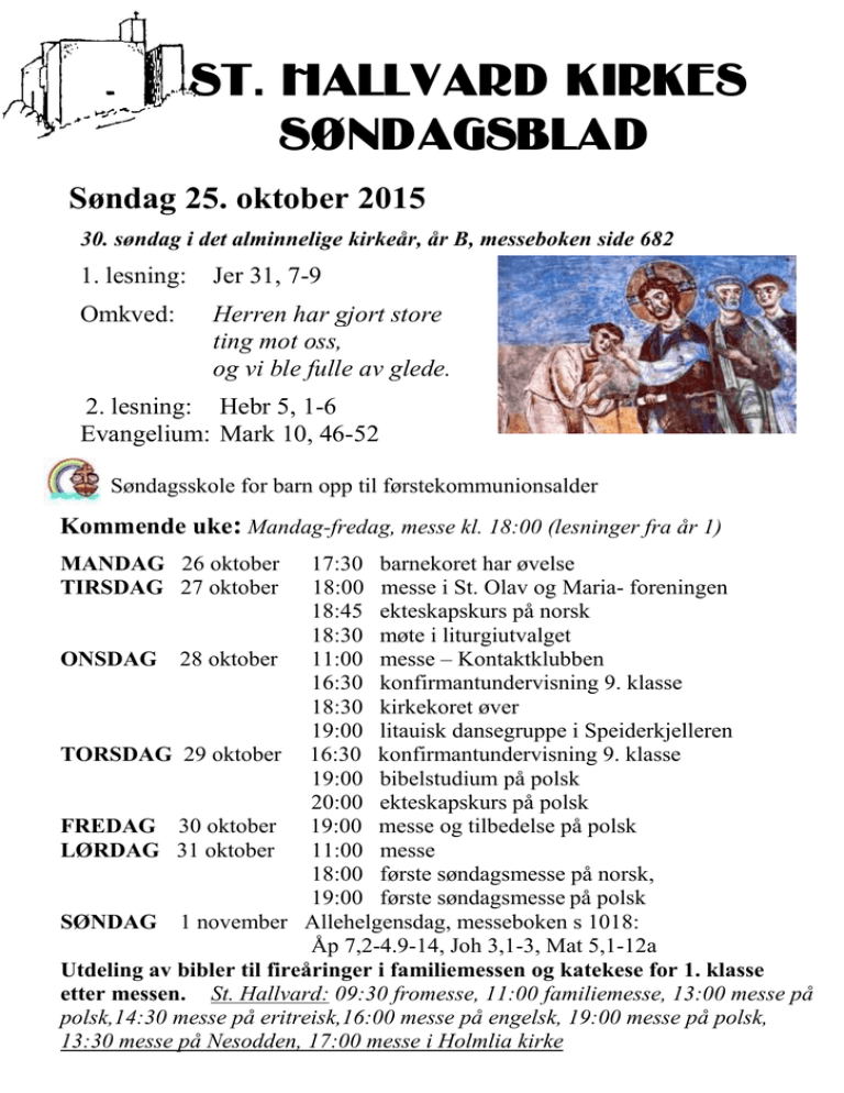 St. Hallvard kirkes søndagsblad Søndag 25. oktober 2015 30. søndag i det alminnelige kirkeår, år B, messeboken side 682 1. lesning: Jer 31, 7-9 Omkved: Herren har gjort store ting mot oss, og vi ble fulle av glede. 2. lesning: Hebr 5, 1-6 Evangelium: Mark 10, 46-52 Søndagsskole for barn opp til førstekommunionsalder Kommende uke: Mandag-fredag, messe kl. 18:00 (lesninger fra år 1) MANDAG 26 oktober TIRSDAG 27 oktober 17:30 barnekoret har øvelse 18:00 messe i St. Olav og Maria- foreningen 18:45 ekteskapskurs på norsk 18:30 møte i liturgiutvalget ONSDAG 28 oktober 11:00 messe – Kontaktklubben 16:30 konfirmantundervisning 9. klasse 18:30 kirkekoret øver 19:00 litauisk dansegruppe i Speiderkjelleren TORSDAG 29 oktober 16:30 konfirmantundervisning 9. klasse 19:00 bibelstudium på polsk 20:00 ekteskapskurs på polsk FREDAG 30 oktober 19:00 messe og tilbedelse på polsk LØRDAG 31 oktober 11:00 messe 18:00 første søndagsmesse på norsk, 19:00 første søndagsmesse på polsk SØNDAG 1 november Allehelgensdag, messeboken s 1018: Åp 7,2-4.9-14, Joh 3,1-3, Mat 5,1-12a Utdeling av bibler til fireåringer i familiemessen og katekese for 1. klasse etter messen. St. Hallvard: 09:30 fromesse, 11:00 familiemesse, 13:00 messe på polsk,14:30 messe på eritreisk,16:00 messe på engelsk, 19:00 messe på polsk, 13:30 messe på Nesodden, 17:00 messe i Holmlia kirke Oktober er Maria-måned. Derfor er det rosenkransandakt etter kveldsmessene kl 18:00 mandag til fredag og etter 11messen på lørdager i hele oktober. Løfteavleggelse hos St. Elisabeth-søstrene i St. Hallvard Vi gratulerer de syv St. Elisabeth-søstrene som i går, lørdag 24. oktober, avla sine første løfter. Menighetens varme tanker og lykkeønskninger går til alle St. Elisabethsøstre, men i særdeleshet til kommuniteten på St.Elisabeth-hjemmet på Nordstrand. Samtidig takker vi for at dere ville dele denne store dagen med menigheten i St. Hallvard. Alle sjelers dag 2. november Mandag 2. november feirer Kirken Alle sjelers dag for alle avdøde i menigheten og for andre som man ønsker at det skal bes for. Navn på avdøde leveres inn til kontoret på e-post [email protected] eller på telefon 23303200 innen fredag 30. oktober. De avdødes navn vil bli lest opp og bedt for under messen. Dersom du i tillegg ønsker at det skal feires en messe for en eller flere av dine avdøde slektninger og/eller venner, kan du fylle ut en messeintensjonskonvolutt (finnes bak i kirken, på menighetskontoret og kan fås av prestene) og gi den til kontoret eller en av prestene innen fredag 30. oktober. Man vil lese messe for disse i løpet av november måned. Så langt som det er mulig vil messen bli lest på eventuelt ønsket dato. Har du lyst å være kirkevert? Ønske velkommen til søndagsmesse, dele ut salmebøker, samle inn kollekt, stille opp noen søndager ( ca 3 ganger i løpet av høsthalvåret og ca 3-4 ganger i vårhalvåret) -og i høytider ? Da kan du sende mail til [email protected] eller henvende deg til menighetskontoret for mer informasjon om denne trivelige tjenesten i menigheten! BARNEVOGNER I KIRKEN Av sikkerhetsgrunner er det ikke tillatt å ha barnevogner inne i kirkerommet. Barn må gjerne være med inn i kirken, men barnevognen må settes utenfor eller i gangen foran menighetslokalet. I tilfelle brann eller sykdom må det være fri adgang inn og ut av kirkerommet. Vi håper på forståelse for dette. Vennlig hilsen fra kirkevertene Har du glemt noe i kirken? Hvis du har glemt en jakke, lue, eller paraply, blir det hengt opp i gangen utenfor menighetsalen- under trappen til andre etasje. Hvis du glemmer mobiltelefonen, briller, bank- eller busskort eller andre verdisaker, kan du henvende deg til menighetskontoret for å få dette tilbake. Sant’Egidio fellesskapet har kveldsbønn i St. Joseph kirke tirsdag 27. oktober kl. 1845 Etter kveldsbønnen, som varer om lag en halv time, møtes de som har anledning til samtale og refleksjon. Møtet avsluttes kl. 20.15. Sant’Egidio fellesskapet har kveldsbønn annen hver tirsdag i St. Joseph kirke. Alle er hjertelig velkomne! Notiser: Kontaktklubben møtes til lunsj og hyggelig samvær onsdager etter messen kl 11:00 Familiekoret har øvelse hver mandag kl 17:30 Kirkekoret har øvelse onsdager kl 18:30 og søndager kl 10:15 før høymesse kl 11:00 26. oktober 19:30: Kunstforedrag i St. Dominikus: VELASQUEZ, sevillianer og kongens maler 27. oktober kl 19:30: Katolsk Forum i St. Dominikus. Karl Gervin: BERNHARD AV CLAIRVAUX OG MARTIN LUTHER. 27. oktober: Møte i Maria-foreningen. Messe i St. Olav kl 18:00 31. oktober: St. Joseph-søstrenes retrettsenter, Glads vei 23: Åpent lørdagsseminar med Maristene. 13. og 14. november er det julemarked hos St. Joseph-søstrene. Se annonse 17. november 19:30 i St. Dominkus. «Mangfoldig, dog ens i grunnen» professor Jan Schumacher om salmesangens plass i kristen kultus. 28. november: Åpen dag på Sta. Katarinahjemmet. Se annonsen Samlet kollekt i anledning Misjonssøndag kr 18. 088 Hjertelig takk! JULEMARKED St. Josephsøstrenes Hjem Glads vei 23, 0489 Oslo inviterer til julemarked Fredag, 13. november 2015 Kl. 10.00 – 13.00 Lørdag, 14. november 2015 Kl. 10.00 – 13.00 NB! Betaling også med bankkort Hjertelig velkommen! Velkommen til Åpen dag på Sta. Katarinahjemmet lørdag 28. november fra 10:30 - 15:00 Vi har julesalg, utlodning, juleverksted og en hyggelig liten kafé, og gleder oss til å se familie, og nye og gamle venner og bekjente. Følg med på vår hjemmeside for oppdatert program; http://katarinahjemmet.katolsk.no Vi håper dere tar turen innom. Hilsen søstrene på Sta. Katarinahjemmet Sta. Katarinahjemmet, Gjørstadsgate 9, 0367 OsloTlf: 23 21 54 10 e-post: [email protected] SIDEN FOR BARN OG UNGE Husk! 1. november: 7. november: utdeling av 4-års bibel og katekese for 1. klasse menighetens barn med foreldre inviteres til kirken kl. 14.30-17.00 på familietreff! 14. november: katekese for 2.-8. klasse 28.-29.11: advent