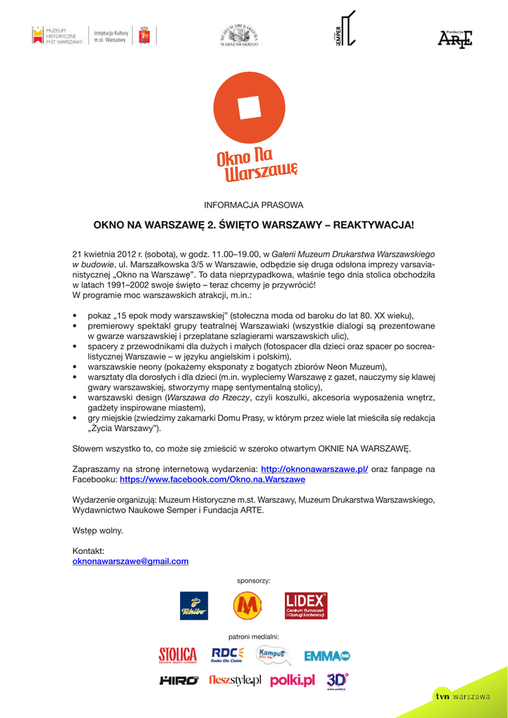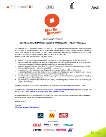 Informacja prasowa OKNO NA WARSZAWĘ 2. ŚWIĘTO WARSZAWY – REAKTYWACJA! 21 kwietnia 2012 r. (sobota), w godz. 11.00–19.00, w Galerii Muzeum Drukarstwa Warszawskiego w budowie, ul. Marszałkowska 3/5 w Warszawie, odbędzie się druga odsłona imprezy varsavianistycznej „Okno na Warszawę”. To data nieprzypadkowa, właśnie tego dnia stolica obchodziła w latach 1991–2002 swoje święto – teraz chcemy je przywrócić! W programie moc warszawskich atrakcji, m.in.: • • • • • • • pokaz „15 epok mody warszawskiej” (stołeczna moda od baroku do lat 80. XX wieku), premierowy spektakl grupy teatralnej Warszawiaki (wszystkie dialogi są prezentowane w gwarze warszawskiej i przeplatane szlagierami warszawskich ulic), spacery z przewodnikami dla dużych i małych (fotospacer dla dzieci oraz spacer po socrealistycznej Warszawie – w języku angielskim i polskim), warszawskie neony (pokażemy eksponaty z bogatych zbiorów Neon Muzeum), warsztaty dla dorosłych i dla dzieci (m.in. wypleciemy Warszawę z gazet, nauczymy się klawej gwary warszawskiej, stworzymy mapę sentymentalną stolicy), warszawski design (Warszawa do Rzeczy, czyli koszulki, akcesoria wyposażenia wnętrz, gadżety inspirowane miastem), gry miejskie (zwiedzimy zakamarki Domu Prasy, w którym przez wiele lat mieściła się redakcja „Życia Warszawy”). Słowem wszystko to, co może się zmieścić w szeroko otwartym OKNIE NA WARSZAWĘ. Zapraszamy na stronę internetową wydarzenia: http://oknonawarszawe.pl/ oraz fanpage na Facebooku: https://www.facebook.com/Okno.na.Warszawe Wydarzenie organizują: Muzeum Historyczne m.st. Warszawy, Muzeum Drukarstwa Warszawskiego, Wydawnictwo Naukowe Semper i Fundacja ARTE. Wstęp wolny. Kontakt: [email protected] sponsorzy: patroni medialni: