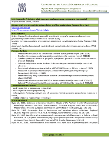 UNIWERSYTET IM. ADAMA MICKIEWICZA W POZNANIU Wydział Nauk Geograficznych i Geologicznych Instytut Geografii Społeczno-Ekonomicznej i Gospodarki Przestrzennej Imię i nazwisko (z tytułem i/lub stopniem naukowym oraz zajmowane stanowisko) Wojciech Dyba, dr inż., adiunkt Adres e-mail oraz strona internetowa (blog, profil na portalu typu ResearchGate itp.) [email protected], https://amu.academia.edu/WojciechDyba Wykształcenie Doktor Nauk o Ziemi w zakresie geografii, specjalność geografia społeczno-ekonomiczna, gospodarka przestrzenna (UAM Poznań, styczeń 2015) Magister inżynier gospodarki przestrzennej, specjalność rozwój regionalny (UAM Poznań, 2011, 2013) Absolwent studiów licencjackich z administracji, specjalność administracja samorządowa (WSB Poznań, 2012) Pełnione funkcje - Przedstawiciel IGSEiGP do kontaktu ze szkołami ponadgimnazjalnymi (od X 2016) - Opiekun kierunku gospodarka przestrzenna inżynierska zaoczna, rocznik 2016/17 - Opiekun praktyk na kierunku: geografia, specjalność geoanaliza społeczno-ekonomiczna (rocznik 2016/17) - Członek Rady Doktorantów Studium Doktoranckiego na WNGiG UAM (w roku akad. 2014/15) - Przedstawiciel doktorantów w Radzie IGSEiGP UAM (marzec 2014 r. – styczeń 2016) - Pracownik inżynieryjno-techniczny w Zakładzie Polityki Regionalnej i Integracji Europejskiej (IX 2011 – II 2016) - Przewodniczący Rady Doktorantów Studium Doktoranckiego na WNGiG UAM (w roku akad. 2012/13) - Przedstawiciel doktorantów WNGiG w Radzie WNGiG UAM (w roku akad. 2012/13) - Członek Wydziałowej Komisji Ekonomicznej na WNGiG UAM (w roku akad. 2011/12) Zainteresowania naukowe - klastry oraz sieci w gospodarce regionalnej, - lokalizacja działalności gospodarczej - wykorzystanie funduszy unijnych oraz ich wpływ na rozwój społeczno-gospodarczy regionów w Polsce, - strategie rozwoju regionalnego i lokalnego Wykaz publikacji Dyba W., 2016. Spillovers in Furniture Clusters: Effects of the Position in Inter-Organisational Knowledge Networks on Firms’ Innovativeness. European Regions and Cities – University Master Class. Brussels: European Commission, Committee of the Regions, pp. 180-191. Dyba W., 2016. Knowledge flows in bottom-up and top-down cluster initiatives. Regional Studies, Regional Science, vol.3, no.1. Routledge, Taylor&Francis Group, pp. 287-295. Dyba W., 2016. Współpraca i przepływy wiedzy w organizacjach klastrowych w świetle polityki klastrowej UE – przykład badania relacji łączących przedsiębiorstwa z wykorzystaniem analizy sieciowej. Prace Komisji Geografii Przemysłu PTG, Kraków-Warszawa, 125-143 Dyba W.M., 2015. Rozmieszczenie przestrzenne oraz cykl życia najaktywniejszych inicjatyw www.igsegp.amu.edu.pl UNIWERSYTET IM. ADAMA MICKIEWICZA W POZNANIU Wydział Nauk Geograficznych i Geologicznych Instytut Geografii Społeczno-Ekonomicznej i Gospodarki Przestrzennej klastrowych w województwie wielkopolskim. [W:] M. Liro, J. Liro (red.), Współczesne problemy i kierunki badawcze w geografii. Uniwersytet Jagielloński, Kraków, 21-35. Dyba W.M., 2015. Przemysł i handel wielkopowierzchniowy. [W:] M. Lasocki (red.), W poszukiwaniu miasta idealnego. Miejsce pracy w przestrzeni wielofunkcyjnej. Uniwersytet Warszawski, Warszawa, 43-51. Dyba W.M., Stryjakiewicz T., 2014. Inicjatywy klastrowe jako szansa rozwoju przemysłu meblarskiego w Polsce – przykład Swarzędzkiego Klastra Producentów Mebli. Prace Komisji Geografii Przemysłu Polskiego Towarzystwa Geograficznego PAN nr 27/2014, KrakówWarszawa, 134-146. Kołsut B., Dyba W.M. (red.), 2014. Czynniki i kierunki rozwoju gminy Lubniewice. Wydawnictwo Naukowe UAM, Poznań. Publikacja monograficzna . Kołsut B., Dyba W., 2014. Istota strategii rozwoju lokalnego i zakres prac nad opracowaniem Strategii rozwoju gminy Lubniewice na lata 2014–2020. [W:] Kołsut B., Dyba W.M. (red.). Czynniki i kierunki rozwoju gminy Lubniewice. Wyd. Nauk. UAM, Poznań: 13-27. Dyba W., Kołsut B., 2014. Zewnętrzne polityki publiczne jako uwarunkowania rozwoju gminy Lubniewice [W:] Kołsut B., Dyba W.M. (red.), Czynniki i kierunki rozwoju gminy Lubniewice. Wyd. Nauk. UAM, Poznań: 28-39. Kołsut B., Dzikowska A., Dyba W., Oko P., Sowada T., 2014. Problemy i potencjały rozwojowe gminy Lubniewice w świetle badań terenowych. [W:] Kołsut B., Dyba W.M. (red.), Czynniki i kierunki rozwoju gminy Lubniewice. Wyd. Nauk. UAM, Poznań: 126-137. Dębińska D., Dzikowska A., Dyba W.., Kołsut B., Kubiak B., Kuźmińska A., Oko P., Piątek B., Popkowski A., Przybysz K., Sińska W., Sowada T., Wawrzyniak P., 2014. Analiza problemowa, wizja i cele rozwoju gminy Lubniewice. [W:] Kołsut B., Dyba W.M. (red.) Czynniki i kierunki rozwoju gminy Lubniewice. Wyd. Nauk. UAM, Poznań: 138-150. Stryjakiewicz T., Dyba W.M., 2014. Organizacja przestrzenna i funkcjonowanie klastrów w województwie wielkopolskim. WROT, Poznań. Publikacja monograficzna – 81 stron. Dyba W.M., 2013. Wpływ dużych przedsiębiorstw na rozwój regionalny na przykładzie województwa wielkopolskiego. [W:] Rozwój regionalny i polityka regionalna nr 21. Wydawnictwo Naukowe Bogucki, Poznań. Dyba W.M., 2013. Polaryzacyjno-dyfuzyjny model rozwoju w polityce regionalnej województwa wielkopolskiego. [W:] T. Wiskulski, M. Pilarski (red.) Współczesne zagadnienia, problemy i wyzwania. w badaniach geograficznych. Tom II. Wyd. UG, Gdańsk. Dyba W. M., Kawińska M. 2012. Klasyfikacja rodzajowa i polityka wspierania klastrów gospodarczych w województwie wielkopolskim. [W:] Biuletyn Instytutu Geografii SpołecznoEkonomicznej i Gospodarki Przestrzennej Uniwersytetu im. Adama Mickiewicza w Poznaniu. Seria Rozwój Regionalny i Polityka Regionalna nr 20. Wydawnictwo Naukowe Bogucki, Poznań. Dyba W. M., Stryjakiewicz T., 2012. Zróżnicowanie poziomu rozwoju społeczno-gospodarczego gmin województwa wielkopolskiego w świetle realizacji polityki intraregionalnej. Wydawnictwo Naukowe Bogucki, Poznań. Publikacja monograficzna – 146 stron. Dy