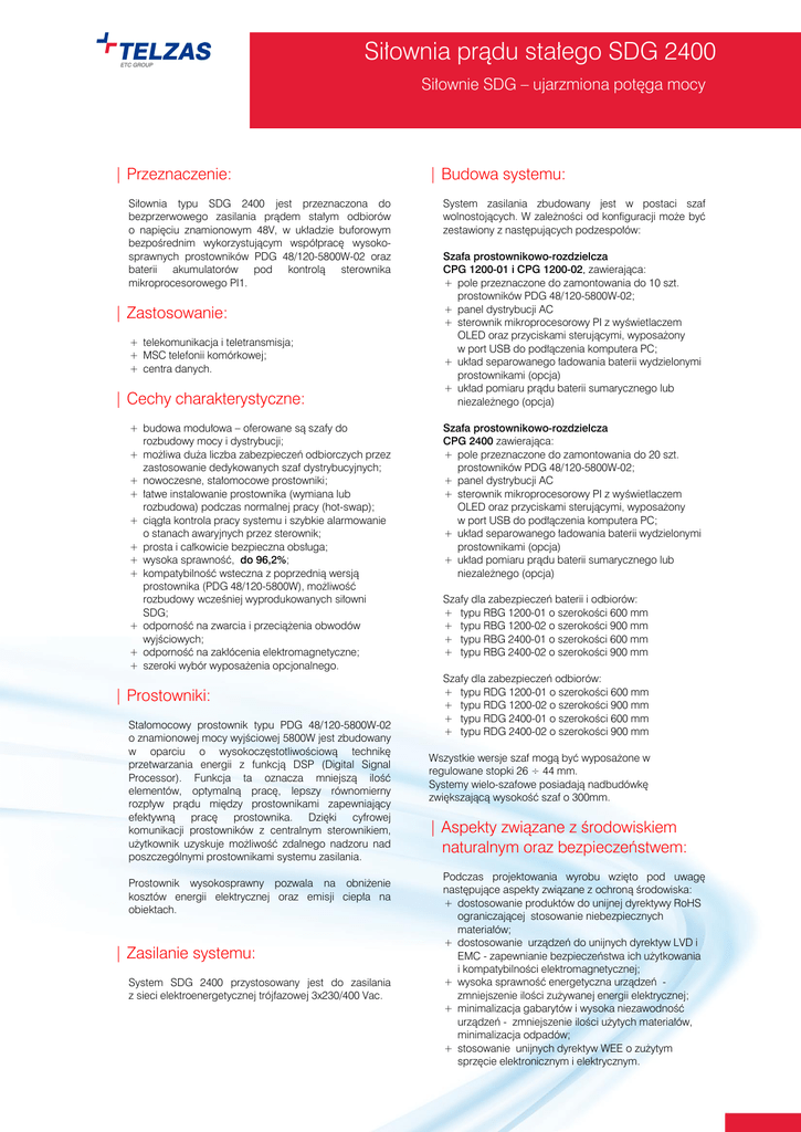 Siłownia prądu stałego SDG 2400 Siłownie SDG – ujarzmiona potęga mocy | Przeznaczenie: Siłownia typu SDG 2400 jest przeznaczona do bezprzerwowego zasilania prądem stałym odbiorów o napięciu znamionowym 48V, w układzie buforowym bezpośrednim wykorzystującym współpracę wysokosprawnych prostowników PDG 48/120-5800W-02 oraz baterii akumulatorów pod kontrolą sterownika mikroprocesorowego PI1. | Zastosowanie: + telekomunikacja i teletransmisja; + MSC telefonii komórkowej; + centra danych. | Cechy charakterystyczne: + budowa modułowa – oferowane są szafy do rozbudowy mocy i dystrybucji; + możliwa duża liczba zabezpieczeń odbiorczych przez zastosowanie dedykowanych szaf dystrybucyjnych; + nowoczesne, stałomocowe prostowniki; + łatwe instalowanie prostownika (wymiana lub rozbudowa) podczas normalnej pracy (hot-swap); + ciągła kontrola pracy systemu i szybkie alarmowanie o stanach awaryjnych przez sterownik; + prosta i całkowicie bezpieczna obsługa; + wysoka sprawność, do 96,2%; + kompatybilność wsteczna z poprzednią wersją prostownika (PDG 48/120-5800W), możliwość rozbudowy wcześniej wyprodukowanych siłowni SDG; + odporność na zwarcia i przeciążenia obwodów wyjściowych; + odporność na zakłócenia elektromagnetyczne; + szeroki wybór wyposażenia opcjonalnego. | Prostowniki: Stałomocowy prostownik typu PDG 48/120-5800W-02 o znamionowej mocy wyjściowej 5800W jest zbudowany w oparciu o wysokoczęstotliwościową technikę przetwarzania energii z funkcją DSP (Digital Signal Processor). Funkcja ta oznacza mniejszą ilość elementów, optymalną pracę, lepszy równomierny rozpływ prądu między prostownikami zapewniający efektywną pracę prostownika. Dzięki cyfrowej komunikacji prostowników z centralnym sterownikiem, użytkownik uzyskuje możliwość zdalnego nadzoru nad poszczególnymi prostownikami systemu zasilania. Prostownik wysokosprawny pozwala na obniżenie kosztów energii elektrycznej oraz emisji ciepła na obiektach. | Zasilanie systemu: System SDG 2400 przystosowany jest do zasilania z sieci elektroenergetycznej trójfazowej 3x230/400 Vac. | Budowa systemu: System zasilania zbudowany jest w postaci szaf wolnostojących. W zależności od konfiguracji może być zestawiony z następujących podzespołów: Szafa prostownikowo-rozdzielcza CPG 1200-01 i CPG 1200-02. zawierająca: + pole przeznaczone do zamontowania do 10 szt. prostowników PDG 48/120-5800W-02; + panel dystrybucji AC + sterownik mikroprocesorowy PI z wyświetlaczem OLED oraz przyciskami sterującymi, wyposażony w port USB do podłączenia komputera PC; + układ separowanego ładowania baterii wydzielonymi prostownikami (opcja) + układ pomiaru prądu baterii sumarycznego lub niezależnego (opcja) Szafa prostownikowo-rozdzielcza CPG 2400 zawierająca: + pole przeznaczone do zamontowania do 20 szt. prostowników PDG 48/120-5800W-02; + panel dystrybucji AC + sterownik mikroprocesorowy PI z wyświetlaczem OLED oraz przyciskami sterującymi, wyposażony w port USB do podłączenia komputera PC; + układ separowanego ładowania baterii wydzielonymi prostownikami (opcja) + układ pomiaru prądu baterii sumarycznego lub niezależnego (opcja) Szafy dla zabezpieczeń baterii i odbiorów: + typu RBG 1200-01 o szerokości 600 mm + typu RBG 1200-02 o szerokości 900 mm + typu RBG 2400-01 o szerokości 600 mm + typu RBG 2400-02 o szerokości 900 mm Szafy dla zabezpieczeń odbiorów: + typu RDG 1200-01 o szerokości 600 mm + typu RDG 1200-02 o szerokości 900 mm + typu RDG 2400-01 o szerokości 600 mm + typu RDG 2400-02 o szerokości 900 mm Wszystkie wersje szaf mogą być wyposażone w regulowane stopki 26 ÷ 44 mm. Systemy wielo-szafowe posiadają nadbudówkę zwiększającą wysokość szaf o 300mm. | Aspekty związane z środowiskiem naturalnym oraz bezpieczeństwem: Podczas projektowania wyrobu wzięto pod uwagę następujące aspekty związane z ochroną środowiska: + dostosowanie produktów do unijnej dyrektywy RoHS ograniczającej stosowanie niebezpiecznych materiałów; + dostosowanie urządzeń do unijnych dyrektyw LVD i EMC - zapewnianie bezpieczeństwa ich użytkowania i kompatybilności elektromagnetycznej; + wysoka sprawność energetyczna urządzeń zmniejszenie ilości zużywanej energii elektrycznej; + minimalizacja gabarytów i wysoka niezawodność urządzeń - zmniejszenie ilości użytych materiałów, minimalizacja odpadów; + stosowanie unijnych dyrektyw WEE o zużytym sprzęcie elektronicznym i elektrycznym. System zasilania prądem stałym SDG 2400 (WxSxG) Masa prostownika kg 10 | Podstawowe funkcje sterownika systemu: Podstawowe parametry systemu zasilania: Parametry wejściowe: Napięcie wejściowe VAC 3 x 230/400 Zakres zmian napięcia wejściowego fazowego VAC 260÷530 Częstotliwość Hz 45÷65 Konfiguracja sieci zasilającej - Prąd znamionowy (dla 20 x PDG 48/120-5800W-02) AAC Współczynnik mocy λ 2 linie (3W +PE) 2 linie (3x90) ∼1 Parametry wyjściowe: Zakres regulacji napięcia VDC 48÷58 Charakterystyka - UPI Stabilizacja napięcia wyjściowego % 1 Maks. prąd wyjściowy ADC 2400 Maks. moc wyjściowa kW 116 Psofometryczne napięcie tętnień mV <2 Zakres temp. pracy C +5÷+40 Chłodzenie - wymuszone Sprawność modułu prostownikowego % 96,2 (w najlepszym punkcie) Dane ogólne: Stopień ochrony Kompatybilność elektromagnetyczna Wymiary szaf (WxSxG): CPG 1200-01, CPG 1200-02, CPG 2400, RBG 1200-01, RBG 2400-01, RDG 1200-01, RDG 2400-01 IP20 - EN 300 386-2 class B | Rozszerzone funkcje sterownika systemu: + zdalny nadzór systemu zasilania oraz obiektu z Centrum Nadzoru za pomocą oprogramowania WinCN z wykorzystaniem: - linii komutowanych (modem telefoniczny), - sieci logicznej (TCP/IP), - sieci komórkowej GSM; + ładowanie dozorowane wydzielonymi prostownikami (dwa prostowniki); + niezależny pomiar prądu baterii; + rejestracja historii zdarzeń wraz z zapisem daty i godziny (moduł zapisu historii zdarzeń); + monitoring 10 sygnałów