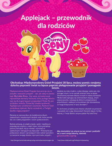 Applejack – przewodnik dla rodziców Obchodząc Międzynarodowy Dzień Przyjaźni 30 lipca, możesz pomóc swojemu dziecku poprawić świat na lepsze poprzez pielęgnowanie przyjaźni i pomaganie innym. Międzynarodowy Dzień Przyjaźni koncentruje się na potędze i znaczeniu przyjaźni – tak, jak robią to postaci bajki My Little Pony. Czy wiesz, że każdy kucyk reprezentuje elementy harmonii, który pomaga dziecku stać się dla kogoś lepszym przyjacielem? Pinkie Pie jest symbolem śmiechu, Fluttershy uosabia życzliwość, Applejack jest uosobieniem uczciwości, Rainbow Dash symbolizuje lojalność, Rarity szczodrość, a Twilight Sparkle magię przyjaźni!! Elementy te stanowią klucz do kształtowania silnych, opiekuńczych, empatycznych młodych osób, które potrafią dać coś z siebie przyjaciołom i swoim społecznościom. Badania pokazują, że zalążki empatii, opieki i współczucia pojawiają się wcześnie u małych dzieci, które potrzebują pomocy dorosłych, aby je rozwijać i wyrosnąć na opiekuńczych i kierujących się etyką ludzi1. Wolontariat jest praktycznym, łatwym i sprawiającym dużo radości sposobem na nauczenie swojego dziecka, czym jest troska, przyjaźń i 1 http://sites.gse.harvard.edu/making-caring-common/parents/strategies-tips dzielenie się sobą z ludźmi, a także dlaczego ważne jest, aby pomagać innym i w ten sposób zmieniać świat na lepsze. Wolontariat przyniesie dziecku korzyści w trakcie dorastania. Młodzi ludzie zajmujący się wolontariatem okazują „innym więcej szacunku, wykazują się dobrymi umiejętnościami przywódczymi i większym zrozumieniem idei obywatelstwa, co mogą kontynuować w życiu dorosłym.2” Po ukończeniu projektu przez dziecko odwiedź nas ponownie i opowiedz nam o jego dokonaniach! Zamieść zdjęcie i krótką historię, a Twoje dziecko otrzyma plakat My Little Pony! Aby dowiedzieć się więcej na ten temat i podzielić się z nami swoją historią, odwiedź generationOn.org/mlp 2 http://www.childtrends.org/?indicators=volunteering Kwestia środowiska naturalnego Applejack uwielbia spędzać dni na zewnątrz, opiekując się farmą Sweet Apple. Jest uczciwym kucykiem, na którym można polegać. Dba o swoich przyjaciół, rodzinę i środowisko. I nie jest ona kucykiem, któremu straszne są brudne kopytka! Biorąc przykład z Applejack, Twoje dziecko wraz ze swoimi przyjaciółkami może pomagać dbać o środowisko i posprzątać w miejscowym parku! Czy wiesz, że...? Środowisko naturalne na całym świecie jest zagrożone. Wiele z naszych cennych zasobów naturalnych jest zagrożonych w wyniku globalnego ocieplenia, wycinania lasów i zaśmiecania. Czy wiesz, że każdego roku wycina się prawie 17 tysięcy kilometrów kwadratowych brazylijskich lasów amazońskich? Lub że do 2050 r. może zniknąć 50% gatunków zamieszkujących planetę Ziemię? Czego nauczą się Twoje dzieci Gdzie będziecie pomagać • Dlaczego dbanie o środowisko jest ważne • Jak z „dzielenia się” sobą z innymi można w dzieciach wyrobić codzienny nawyk Kwestie, o których warto porozmawiać Skorzystaj z tych pytań, dzięki którym można rozpocząć rozmowę na ten temat i łatwiej go zrozumieć. 1 2 • W miejscowym parku lub na miejscowej przestrzeni zielonej 1 21 21 W jaki sposób możemy pomóc chronić środowisko? 3 2 3 3 Dlaczego ważne jest, żeby chronić ziemię? 4 Co jeszcze możemy zrobić, by pomóc? 3 Sugerowane lektury: The Adventures of a Plastic Bottle: A Story About Recycling - Alison Inches. Historia opowiedziana jest z perspektywy butelki na wodę, dzięki której dzieci mogą nauczyć się recyklingu! Książka ta jest pamiętnikiem butelki na wodę, która przebywa drogę z zakładów rafineryjnych przez linię produkcyjną na półkę sklepową, lądując w koszu na śmieci, a ostatecznie w zakładzie recyklingu, gdzie zaczyna swoje nowe życie jako kurtka z polaru! Applejack and the Honest-to-Goodness Switcheroo - G.M. Berrow. W tej książce Applejack zaczyna prowadzić pamiętnik, w którym zapisuje całą swoją ciężką pracę zbierania jabłek na farmie Sweet Apple. Dzień po dniu szczerze opisuje wszystko, co ją denerwuje. Ale kiedy pamiętnik wpada w niewłaściwe kopytka, znajduje się w niezłych tarapatach! Historia ta uczy dzieci znaczenia ciężkiej pracy i szczerości wobec swoich przyjaciół. Sprzątanie placu zabaw lub parku! Czego potrzebujesz • Worków na śmieci • Rękawiczek ochronnych • Ubrań, które można pobrudzić • Środka czyszczącego do rąk Worków na śmieci Kroki • Wybierz dzień, aby wspólnie z osobą dorosłą, swoimi przyjaciółmi lub swoją paczką posprzątać na placu zabaw lub w parku. Rękawiczek ochronnych • Zachowajcie bezpieczeństwo! Podczas sprzątania koniecznie miej na sobie rękawiczki i czapkę ochronną! • Zbieraj śmieci z placu zabaw lub parku do worków na śmieci. • Wyrzuć je do kontenera na śmieci lub zabierz je ze sobą. Ubrań, które można pobrudzić Środka czyszczącego do rąk CZYM JEST GENERATIONON? generationOn to oddział Points of Light zrzeszający młodzież działającą na rzecz innych osób, który zachęca dzieci i młodzież do polepszania świata we własnym zakresie. generationOn inspiruje i mobilizuje rocznie setki tysięcy dzieci i nastolatków i wyposaża ich w odpowiednie narzędzia, dzięki którym podejmują działania służące innym, uczą się, jak pomagać ludziom potrzebującym i jak stać się liderem młodzieży. Zapewnia również narzędzia i zasoby dzieciom, nastolatkom, opiekunom młodzieży i nauczycielom, które pozwalają zmieniać świat i siebie poprzez pomaganie innym.Więcej informacji znajduje się na www.generationon.org