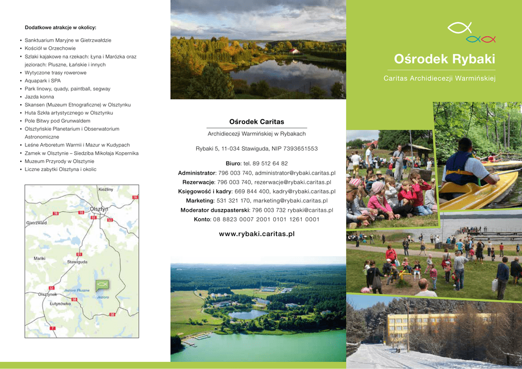 Dodatkowe atrakcje w okolicy: • Sanktuarium Maryjne w Gietrzwałdzie • Kościół w Orzechowie • Szlaki kajakowe na rzekach: Łyna i Marózka oraz Ośrodek Rybaki jeziorach: Pluszne, Łańskie i innych • Wytyczone trasy rowerowe • Aquapark i SPA • Park linowy, quady, paintball, segway • Jazda konna • Skansen (Muzeum Etnograficzne) w Olsztynku • Huta Szkła artystycznego w Olsztynku • Pole Bitwy pod Grunwaldem • Olsztyńskie Planetarium i Obserwatorium Astronomiczne • Leśne Arboretum Warmii i Mazur w Kudypach • Zamek w Olsztynie – Siedziba Mikołaja Kopernika • Muzeum Przyrody w Olsztynie • Liczne zabytki Olsztyna i okolic Caritas Archidiecezji Warmińskiej Ośrodek Caritas Archidiecezji Warmińskiej w Rybakach Rybaki 5, 11-034 Stawiguda, NIP 7393651553 Biuro: tel. 89 512 64 82 Administrator: 796 003 740, [email protected] Rezerwacje: 796 003 740, [email protected] Księgowość i kadry: 669 844 400, [email protected] Marketing: 531 321 170, [email protected] Moderator duszpasterski: 796 003 732 [email protected] Konto: 0 8 8 823 0 0 07 20 01 0101 1261 0 0 01 www.rybaki.caritas.pl Do dyspozycji gości: • 3 sale konferencyjne wyposażone w sprzęt multimedialny (na 20, 4 0 i 10 0 osób) • stołówka (3 sale: sala główna i 2 sale kameralne oraz patio wewnętrzne), która zapewnia możliwość korzystania z całodziennego wyżywienia przygoto wywanego we własnej kuchni dzięki czemu zapewniamy smaczne i zdrowe posiłki O nas • Ośrodek Caritas w Rybakach położony jest w odległości 25 km od Olsztyna, nad jeziorem Łańskim, w gminie Stawiguda. Otoczenie jeziora rowery wodne, rowery turystyczne • • Napiwodzko-Ramuckiej, różnorodną roślinnością i licznymi osobliwościami przyrody jest objęte • programem Natura 2000 Dysponujemy około 200 miejscami noclegowymi w całorocznych domach: • • Bielik – pokoje 2, 3 i 4 osobowe w budynku dwupiętrowym z kuchnią i oddzielnymi sanitariatami dla dziewcząt i chłopców, na każdym piętrze 2 osobowe z łazienkami. Do dyspozycji gości: Organizujemy o każdej porze roku: boiska do piłki nożnej, siatkowej, koszykowej, • rekolekcje, plażowej oraz do tenisa ziemnego • spotkania rodzinne, bezpośredni dostęp do własnego, strzeżonego • rozgrywki sportowo turystyczne, miejsca do kąpieli oraz plaża • weekendy formacyjne, atrakcyjny plac zabaw dla najmłodszych • zielone i białe szkoły, Kaplica wraz z obsługą duszpasterską miejscowego • obozy integracyjne dla dzieci i młodzieży, księdza • noclegi dla pielgrzymów, • mini Z O O • stanowiska wędkarskie, pomosty na jeziorze Dom Wędkarza – 20 miejsc: apartament 2 poko jowy z aneksem kuchennym i łazienką oraz pokoje miniamfiteatr zadaszony na ponad 10 0 osób publiczności, usytuowany nad własnym stawem z urozmaiconą, polodowcową rzeźbą terenu, rozległym kompleksem świerkowo-sosnowej puszczy sprzęt turystyczny – kajaki, łódki wędkarskie, i wewnętrznym łowisku Ośrodka • jedyny w regionie podwodny poligon ćwiczebny – baza dla płetwonurków aneks kuchenny, sauna, sala telewizyjna, sala kominkowa z wyposażeniem multimedialnym – kino • pole namiotowe domowe. Dom po gruntownym remoncie w 2014 r. • rozległy i urozmaicony teren Ośrodka a także • spotkania firmowe, • szkolenia, • konferencje, • spływy kajakowe, • kursy żeglarskie stacjonarne. Ośrodek jest wymarzonym miejscem do wypo czynku indywidualnego, rodzinnego i dla grup zorganizowanych Usytuowanie ośrodka stwarza wysoki komfort bezpiecznego wypoczynku Serdecznie zapraszamy