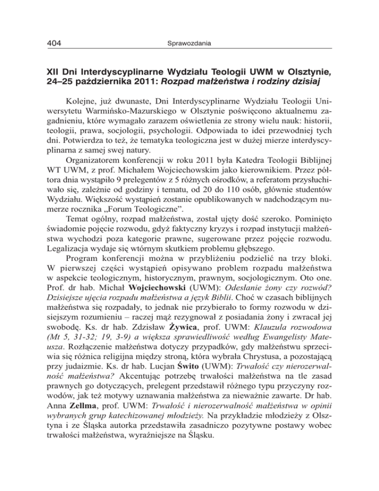 404 Sprawozdania Historia XII Dni Interdyscyplinarne Wydziału Teologii UWM w Olsztynie, 24–25 października 2011: Rozpad małżeństwa i rodziny dzisiaj Kolejne, ju¿ dwunaste, Dni Interdyscyplinarne Wydzia³u Teologii Uniwersytetu Warmiñsko-Mazurskiego w Olsztynie powiêcono aktualnemu zagadnieniu, które wymaga³o zarazem owietlenia ze strony wielu nauk: historii, teologii, prawa, socjologii, psychologii. Odpowiada to idei przewodniej tych dni. Potwierdza to te¿, ¿e tematyka teologiczna jest w du¿ej mierze interdyscyplinarna z samej swej natury. Organizatorem konferencji w roku 2011 by³a Katedra Teologii Biblijnej WT UWM, z prof. Micha³em Wojciechowskim jako kierownikiem. Przez pó³tora dnia wyst¹pi³o 9 prelegentów z 5 ró¿nych orodków, a referatom przys³uchiwa³o siê, zale¿nie od godziny i tematu, od 20 do 110 osób, g³ównie studentów Wydzia³u. Wiêkszoæ wyst¹pieñ zostanie opublikowanych w nadchodz¹cym numerze rocznika Forum Teologiczne. Temat ogólny, rozpad ma³¿eñstwa, zosta³ ujêty doæ szeroko. Pominiêto wiadomie pojêcie rozwodu, gdy¿ faktyczny kryzys i rozpad instytucji ma³¿eñstwa wychodzi poza kategorie prawne, sugerowane przez pojêcie rozwodu. Legalizacja wydaje siê wtórnym skutkiem problemu g³êbszego. Program konferencji mo¿na w przybli¿eniu podzieliæ na trzy bloki. W pierwszej czêci wyst¹pieñ opisywano problem rozpadu ma³¿eñstwa w aspekcie teologicznym, historycznym, prawnym, socjologicznym. Oto one. Prof. dr hab. Micha³ Wojciechowski (UWM): Odes³anie ¿ony czy rozwód? Dzisiejsze ujêcia rozpadu ma³¿eñstwa a jêzyk Biblii. Choæ w czasach biblijnych ma³¿eñstwa siê rozpada³y, to jednak nie przybiera³o to formy rozwodu w dzisiejszym rozumieniu raczej m¹¿ rezygnowa³ z posiadania ¿ony i zwraca³ jej swobodê. Ks. dr hab. Zdzis³aw ¯ywica, prof. UWM: Klauzula rozwodowa (Mt 5, 31-32; 19, 3-9) a wiêksza sprawiedliwoæ wed³ug Ewangelisty Mateusza. Roz³¹czenie ma³¿eñstwa dotyczy przypadków, gdy ma³¿eñstwu sprzeciwia siê ró¿nica religijna miêdzy stron¹, która wybra³a Chrystusa, a pozostaj¹c¹ przy judaizmie. Ks. dr hab. Lucjan wito (UWM): Trwa³oæ czy nierozerwalnoæ ma³¿eñstwa? Akcentuj¹c potrzebê trwa³oci ma³¿eñstwa na tle zasad prawnych go dotycz¹cych, prelegent przedstawi³ ró¿nego typu przyczyny rozwodów, jak te¿ motywy uznawania ma³¿eñstwa za niewa¿nie zawarte. Dr hab. Anna Zellma, prof. UWM: Trwa³oæ i nierozerwalnoæ ma³¿eñstwa w opinii wybranych grup katechizowanej m³odzie¿y. Na przyk³adzie m³odzie¿y z Olsztyna i ze l¹ska autorka przedstawi³a zasadniczo pozytywne postawy wobec trwa³oci ma³¿eñstwa, wyraniejsze na l¹sku. Sprawozdania 405 Studia Warmińskie 48 (2011) Druga grupa referatów dotyczy³a oceny rozpadu ma³¿eñstwa od strony moralnej i psychologicznej. Ks. dr Ryszard Kuczer (UAM): Moralna ocena rozpadu ma³¿eñstwa w nauczaniu Jana Paw³a II. Temat wa¿ny dla Ojca wiêtego, który widzia³ rozwody w wietle wznios³ej wizji ma³¿eñstwa. Ks. dr hab. Antoni Bartoszek (U): Moralne aspekty duszpasterstwa osób w separacji i po rozwodzie. Nie powinno ono zaniedbywaæ praw osób pokrzywdzonych przez rozpad ma³¿eñstwa. Dr hab. Urszula Dudziak (KUL): Psychologiczne skutki rozwodów. Dotycz¹ one nie tylko dzieci, lecz tak¿e stron, które pod wp³ywem rozwodu doznaj¹ niekorzystnych zmian psychicznych. Pozosta³e wyst¹pienia dotyczy³y praktycznych aspektów przeciwdzia³ania rozpadowi ma³¿eñstwa. Mgr Ireneusz Dzier¿êga (Centrum Praw Ojca i Dziecka): Wp³yw braku prawid³owego wzorca mê¿czyzny-ojca na kszta³towanie siê postaw osobowych u dzieci i m³odzie¿y. Statystyki dowodz¹, ¿e przerzucanie wychowania na matki powoduje trudnoci ¿yciowe, w tym rodzinne, u wychowanków, a praktyka polska dyskryminuje ojców. Ks. dr Cezary Opalach (UWM): Zapobieganie rozpadowi ma³¿eñstwa (perspektywa psychologiczna). Duszpasterstwo powinno wykorzystaæ wiedzê o procesach psychologicznych w sk³óconych ma³¿eñstwach. Udanym dope³nieniem konferencji by³o spotkanie na temat kryzysu rodziny w Domu Rzemios³a w Olsztynie w poniedzia³ek 24 padziernika 2011 r. Marek Jurek, by³y marsza³ek Sejmu RP, wyg³osi³ prelekcjê Polityczne uwarunkowania kryzysu rodziny. Po niej odby³a siê dyskusja panelowa na temat kryzysu rodziny, w której wziêli udzia³ niektórzy uczestnicy konferencji (M. Wojciechowski, U. Dudziak, I. Dzier¿êga). Micha³ Wojciechowski Olsztyn