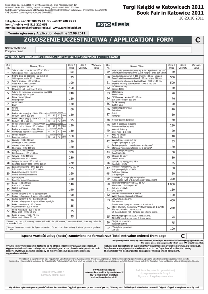 Expo Silesia Sp. z o.o. (Ltd), 41-219 Sosnowiec, ul. Braci Mieroszewskich 124 NIP (VAT ID) PL 9591726258, Kapita³ zak³adowy (Initial capital) PLN 2.225.000 S¹d Rejonowy w Katowicach, VIII Wydzia³ Gospodarczy (District Court in Katowice, 8th Economic Department) KRS (National Court Registry Number) 0000252032 Targi Ksi¹¿ki w Katowicach 2011 Book Fair in Katowice 2011 20-23.10.2011 tel./phone +48 32 788 75 43 fax +48 32 788 75 22 kom./mobile +48 515 220 058 [email protected] www.targiksiazki.eu Termin zg³oszeñ / Application deadline 12.09.2011 C ZG£OSZENIE UCZESTNICTWA / APPLICATION FORM Nazwa Wystawcy/ Company name WYPOSA¯ENIE DODATKOWE STOISKA / SUPPLEMENTARY EQUIPMENT FOR THE STAND LP. / No. 1 2 3 4 5 6 7 8 9 10 11 12 Nazwa / Item Œciana bia³a do zaplecza - 100 x 250 cm White panel wall - 100 x 250 cm Œciana bia³a do zaplecza - 50 x 250 cm White panel wall - 50 x 250 cm Œciana szklana - 100 x 250 cm Glass wall - 100 x 250 cm 2 Œciana z plexi - za 1 m Plexiglass wall - price per 1 sqm Œciana do zapleczna, wzmocniona pod LCD Reinforced wall for LCD Drzwi harmonijkowe Folding door Drzwi pe³ne Door Kotara Curtain wysokoœæ /height Podest ekspozycyjny - 100 x 100 cm 30 50 70 100 Podium - 100 x 100 cm wysokoœæ /height Podest ekspozycyjny - 50 x 100 cm 30 50 70 100 Podium - 50 x 100 cm wysokoœæ /height Podest wzmocniony - 100 x 100 cm 30 50 70 100 Reinforced podium - 100 x 100 cm wysokoœæ /height Podest wzmocniony - 50 x 100 cm 30 50 70 100 Reinforced podium - 50 x 100 cm Cena / Price Wykonanie elementów powy¿ej 2,5 m wysokoœci - za 1 m Construction elements over 2,5 m height - price per 1 sqm 60 36 120 37 Konstrukcja obrotowa Ø 100 cm i H=100 cm - okr¹g³a Round rotating construction Ø 100 cm, height 100 cm Konstrukcja obrotowa kwadratowa - 100 x 100 cm Square rotating construction - 100 x 100 cm Stó³ kwadratowy Square table Stó³ okr¹g³y Round table Stó³ barowy - wysokoœæ 110 cm Bar table - height 110 cm Stolik kawowy Coffee table Krzes³o tapicerowane Soft chair Fotel Armchair 95 38 Hocker (sto³ek barowy) 150 39 130 40 Sofa 2-osobowa, skórzana Two seated leather sofa Wieszak œcienny Coat rack - 1 m long Kosz na œmieci Rubbish bin 2 Wyk³adzina - cena za 1 m Carpet - price per 1 sqm Zestaw gospodarczy 6-cio osobowy typowy* Standard household utensils for 6 persons* Czajnik bezprzewodowy Cordless kettle Ekspres do kawy Coffee maker Lampka na wysiêgniku 75 W Spotlight - 75 W Reflektor halogenowy 150 W Halogen spotlight - 150 W Reflektor gazowy Gas spotlight Lodówka (z 24h przy³¹czem pr¹du) Refrigerator (with 24h power supply connection) Telewizor Plazmowy lub LCD do 42’’ Plasma or LCD TV up to 42’’ Odtwarzacz DVD DVD player Terma i zlewozmywak + szafka Water heater, sink and sinkboard Zmywarka do naczyñ Dishwasher Zawieszenie i przymocowanie do konstrukcji sta³ej pawilonu elementów Wystawcy (cena za 1 punkt) Elements fixed to the structure of the exhibition hall - (charge per 1 fixing point) 35 30 100 31 150 32 240 33 120 34 120 35 Pó³ka metalowa - 100 x 30 cm Metal shelf - 100 x 30 cm 35 28 Pó³ka szklana - 100 x 30 cm Glass shelf - 100 x 30 cm 35 16 17 18 19 20 21 22 23 24 25 Cena / Price Nazwa / Item 29 27 15 LP. / No. 60 26 13 Wartoœæ / Value Iloœæ / Quantity Wartoœæ / Value 2 wysokoœæ /height Podest ³ukowy 30 50 70 100 Rounded podium Gablota - 100 x 100 cm Showcase - 100 x 100 cm Gablota - 50 x 100 cm Showcase - 50 x 100 cm Witryna - 100 x 100 cm Display case - 100 x 100 cm Witryna - 50 x 100 cm Display case - 50 x 100 cm Witryna ³ukowa - 100 x 100cm Rounded dispaly case - 100 x 100cm Lada informacyjna - 50 x 100 cm Information counter - 50 x 100 cm Lada informacyjna naro¿na Corner information counter Lada ³ukowa Rounded information counter Rega³ - 100 x 50 cm Rack - 100 x 50 cm Szafka kuchenna Cupboard 2 Raster sufitowy 1 m - z oœwietleniem Raster ceiling panel 1 sqm - with spotlight 2 Raster sufitowy 1 m - bez oœwietlenia Raster ceiling panel 1 sqm - without spotlight Pó³ka drewniana - 100 x 30 cm Wooden shelf - 100 x 30 cm 14 Iloœæ / Quantity 160 41 190 42 180 43 300 44 280 45 370 46 125 47 160 48 180 49 140 50 140 51 90 52 70 53 35 54 55 * Zestaw gospodarczy 6 osobowy zawiera – filiýanki, talerzyki, sztuãce, 2 zestawy szklanek, 2 zestawy kieliszków, cukierniczka, 2 miski * Standard household utensils for 6 persons consists of – tea cups, plates, cutlery, 4 sets of glasses, sugar bowl, 2 bowls 56 57 40 500 500 70 70 70 70 40 60 60 Konstrukcja typu TRILOCK - cena za 1mb. TRILOCK construction - per 1 linear metre Stojak na prospekty Rack for leaflets Wentylator powietrza Air fan 280 20 10 33 180 50 50 35 60 90 320 1 000 150 150 400 240 95 75 100 £¹czna wartoœæ us³ug (netto) zamówiona na formularzu/ Total net value ordered from page C Wszystkie podane kwoty s¹ kwotami netto, do których nale¿y doliczyæ obowi¹zuj¹cy podatek VAT. The above prices are net prices to which legal VAT should be added. Rysunki i opisy wyposa¿enia dostêpne s¹ na stronie internetowej www.exposilesia.pl. Wyposa¿enie dodatkowe podlega zwrotowi do Organizatora niezw³ocznie po zakoñczeniu targów. Wystawca zostanie obci¹¿ony za nie zwrócone lub zniszczone elementy wyposa¿enia stoiska. Pictures and descriptions of supplementary equipment are available on www.exposilesia.pl. Supplementary equipment are to be restored to the Organizer after the fair closing. The Exhibitor will be charged for damaged or missing stand equipment. Oœwiadczam, i¿ zapozna³em/³am siê z Regulaminem Uczestnictwa w Targach, dostêpnym na stronie www.targiksiazki.pl stanowi¹cym integraln¹ czêœæ niniejszego Zg³oszenia Uczestnictwa i akceptujê zapisy w nim zawarte I declare that I have read and understood the Regulations for Participants in Trade Fairs, which are available at the website www.targiksiazki.pl and which form an integral part of this Application Form, and I accept all the articles contained therein. Pieczêæ firmy, da