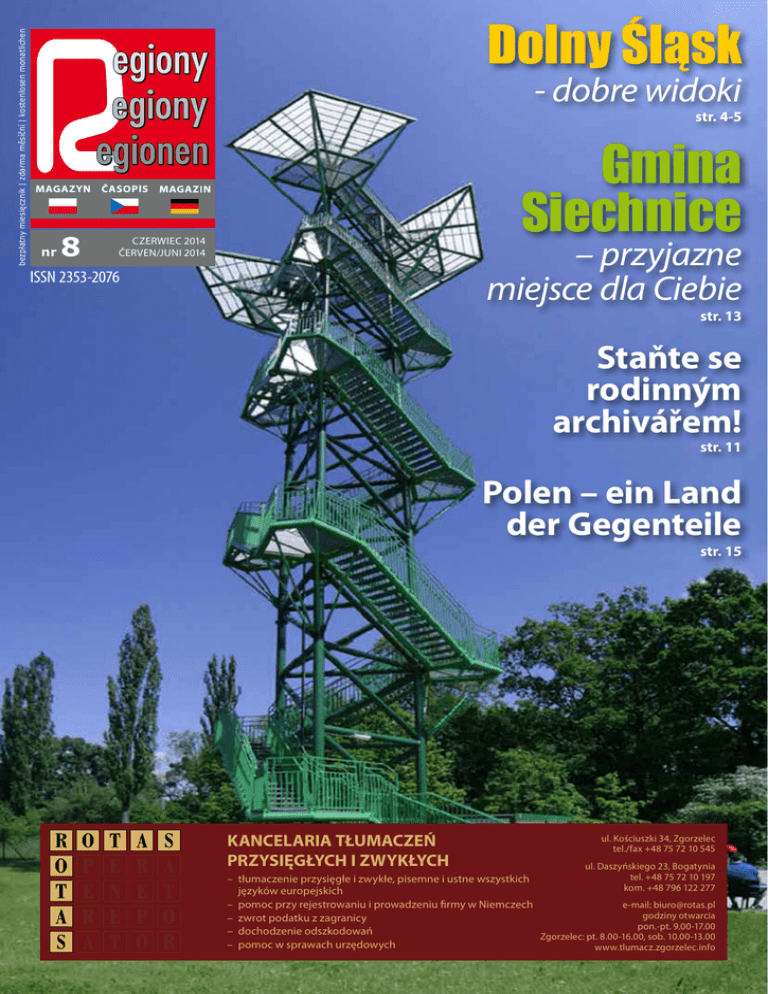 bezpłatny miesięcznik | zdarma měsíční | kostenlosen monatlichen Dolny Śląsk - dobre widoki str. 4-5 nr 8 Gmina Siechnice – przyjazne miejsce dla Ciebie Czerwiec 2014 červen/Juni 2014 ISSN 2353-2076 str. 13 Staňte se rodinným archivářem! str. 11 Polen – ein Land der Gegenteile str. 15 0088 KANCELARIA TŁUMACZEŃ PRZYSIĘGŁYCH I ZWYKŁYCH ul. Kościuszki 34, Zgorzelec tel./fax +48 75 72 10 545 ul. Daszyńskiego 23, Bogatynia tel. +48 75 72 10 197 – tłumaczenie przysięgłe i zwykłe, pisemne i ustne wszystkich kom. +48 796 122 277 języków europejskich – pomoc przy rejestrowaniu i prowadzeniu firmy w Niemczech e-mail: [email protected] godziny otwarcia – zwrot podatku z zagranicy pon.-pt. 9.00-17.00 – dochodzenie odszkodowań Zgorzelec: pt. 8.00-16.00, sob. 10.00-13.00 – pomoc w sprawach urzędowych www.tlumacz.zgorzelec.info ISSN 2353-2076 Bezpłatny miesięcznik polsko-czesko-niemiecki Jelenia Góra – Liberec – Goerlitz Za nami eurowybory. Pewnie niewielu już o nich pamięta, bo do urn poszło niespełna 24 proc. Polaków. O czym to świadczy? Może to, że nie wierzymy już politykom, że nie czujemy, aby jakiekolwiek decyzje zapadające w Parlamencie Europejskim nas dotykały, czy też o tym, że tak naprawdę nie wiemy, jakie znaczenie mają te wybory – każdy niech sobie sam wytłumaczy. Według mnie to ostatnie stwierdzenie jest najbliższe prawdy. Na każdym kroku słyszymy narzekania, że „Unia to, czy Unia tamto”, jeśli jednak chwilę porozmawiamy, okazuje się, że to nie Unia, tylko my – np. nasza administracja, która nadinterpretuje przepisy wspólnotowe i nakłada na nas nadmierne obowiązki, lub też że sami nie umiemy poruszać się w przepisach. Nie wiemy, jak się temu przeciwstawić i jak z tym sobie radzić. Brakuje nam wiedzy i edukacji na temat struktur wspólnotowych – może warto zadbać o to na poziomie gimnazjum czy szkoły średniej. Może wtedy łatwiej będzie nam korzystać ze wspólnych środków, na które przecież każdy z nas się składa. Czy chcemy, czy nie, funkcjonujemy w Unii Europejskiej – chyba warto wykorzystać tę sytuację najlepiej jak się da. Izabela Siwińska redaktor naczelna Zdarma měsíční polsko-české-německý Jelenia Góra – Liberec – Goerlitz Kostenloser monatlicher polnisch-tschechisch-deutschen Jelenia Góra – Liberec – Görlitz Właściciel Majitel Besitzer Wydawnictwo Regiony ul. Czecha 9/7 59-850 Świeradów-Zdrój www.region-press.eu Redakcja ul. Parkowa 25 Redakce 51-616 Wrocław Redaktion tel./fax 71 348 82 48 Redaktor naczelna Izabela Siwińska Šéfredaktor Chefredakteurin Reklama Werbung tel. kom. 500 391 067 tel. kom. 512 282 761 tel. kom. 503 422 579 tel. kom. 503 933 181 [email protected] DTP Rafał Tlak Korekta Barbara Surkont Oprava Korrektur Okładka: Wieża widokowa w Kotowicach Fot. Mariusz Różnowicz Redakcja nie ponosi odpowiedzialności za treść publikowanych reklam, ogłoszeń i listów. Zastrzegamy sobie prawo do skrótów i korekt przy publikacji nadesłanych listów. Materiałów niezamówionych redakcja nie zwraca. Teksty sponsorowane – (TS). Volby do evropského parlamentu jsou za námi. Jistě si už na ně mnozí z nás nepamatují, protože k urnám šlo necelých 24 proc. Poláků. O čem to svědčí? Možná o tom, že už nevěříme politikům, že necítíme, že by se nás jakákoliv rozhodnutí činěná v Evropském parlamentu dotýkala, nebo také, že ve skutečnosti nevím, jaký význam tyto volby mají – každý ať si odpoví sám. Podle mě se pravdě nejvíce blíží to poslední tvrzení. Na každém kroku slyšíme naříkání, že „Unie to nebo Unie tamto“, pokud si ale na chvíli popovídáme, ukáže se, že ne Unie, jen my - např. naše administrativa, která nadinterpretuje unijní předpisy a nanáší na nás nadměrné povinnosti, nebo také že se sami neumíme zorientovat v předpisech. Nevíme, jak se tomu postavit a jak si s tím poradit. Chybí nám znalosti a vzdělání týkající se unijních struktur – možná by se vyplatilo pamatovat na to na úrovni druhého stupně nebo střední školy. Možná by pak pro nás bylo lehčí využívat společné prostředky, na nichž se přece podílí každý z nás. Ať chceme nebo ne, fungujeme v Evropské unii – proto bychom tuto situaci měli využít, jak nejlépe se dá. Izabela Siwińska šéfredaktorka Die Europawahl ist hinter uns. Bestimmt können sich viele von uns nicht daran erinnern, denn nur knapp 24% der Polen sind zu den Wahlurnen gegangen. Was bedeutet das? Vielleicht, dass wir den Politikern nicht mehr glauben, dass wir die im Europaparlament fallenden Entscheidungen nicht spüren, oder dass wir eigentlich nicht wissen, was für eine Bedeutung diese Wahl hat – jeder sollte es sich selbst erklären. Meiner Meinung nach ist die letzte Feststellung der Wahrheit am nächsten. Ständig hört man Beschwerden, „EU das… EU dies“, aber wenn wir ein bisschen reden, dann stellt sich heraus, dass es nicht die EU ist, sondern wir – z. B. unsere Verwaltung, welche die Gemeinschafts- Vorschriften überinterpretiert und uns übermäßige Pflichten auferlegt, oder dass wir uns selber im Rahmen der Vorschriften nicht bewegen können. Wir wissen nicht, wie wir uns dem entgegensetzen können und wie wir damit umgehen sollen. Uns fehlen das Wissen und die Bildung über die Gemeinschaftsstruktur – vielleicht sollte man sich darum auf der Stufe der Mittelschule und des Gymnasiums kümmern. Vielleicht wird es uns dann leichter fallen, die gemeinsamen Mitteln zu nutzen, die sich aus uns allen zusammensetzen. Ob wir das wollen oder nicht, wir funktionieren in der Europäischen Union – es lohnt sich doch wohl, diese Situation so gut wie möglich auszunutzen. Izabela Siwińska Chefredakteur Redakcja/Redakce/Redaktion Bolesławiec Po raz trzeci w historii bolesławieckie Muzeum Ceramiki otrzymało Sybillę – wyróżnienie w ogólnopolskim Ko