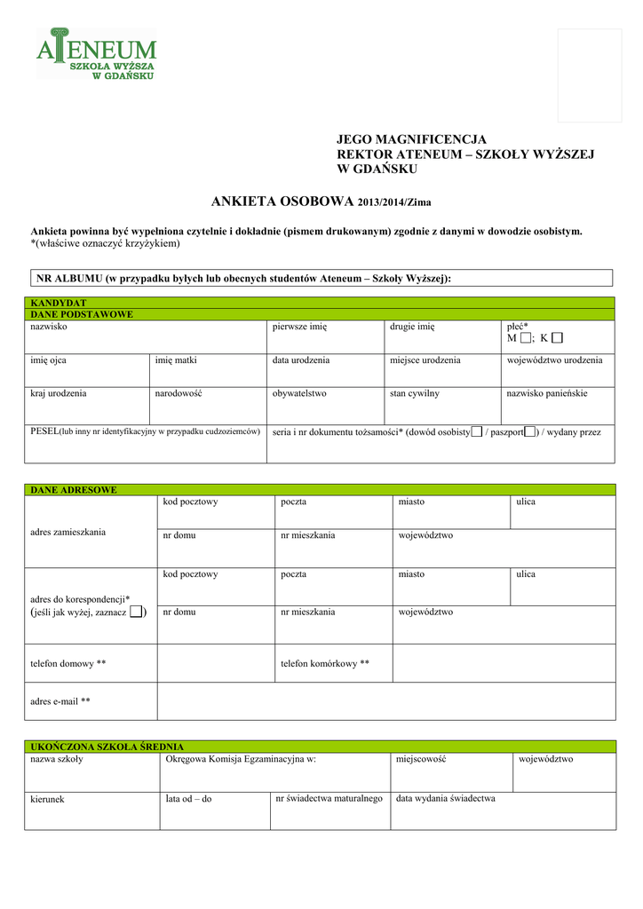 JEGO MAGNIFICENCJA REKTOR ATENEUM – SZKOŁY WYśSZEJ W GDAŃSKU ANKIETA OSOBOWA 2013/2014/Zima Ankieta powinna być wypełniona czytelnie i dokładnie (pismem drukowanym) zgodnie z danymi w dowodzie osobistym. *(właściwe oznaczyć krzyŜykiem) NR ALBUMU (w przypadku byłych lub obecnych studentów Ateneum – Szkoły WyŜszej): KANDYDAT DANE PODSTAWOWE nazwisko pierwsze imię drugie imię płeć* M ; K imię ojca imię matki data urodzenia miejsce urodzenia województwo urodzenia kraj urodzenia narodowość obywatelstwo stan cywilny nazwisko panieńskie PESEL(lub inny nr identyfikacyjny w przypadku cudzoziemców) seria i nr dokumentu toŜsamości* (dowód osobisty / paszport ) / wydany przez DANE ADRESOWE adres zamieszkania adres do korespondencji* (jeśli jak wyŜej, zaznacz ) kod pocztowy poczta miasto nr domu nr mieszkania województwo kod pocztowy poczta miasto nr domu nr mieszkania województwo telefon domowy ** ulica ulica telefon komórkowy ** adres e-mail ** UKOŃCZONA SZKOŁA ŚREDNIA nazwa szkoły Okręgowa Komisja Egzaminacyjna w: kierunek lata od – do nr świadectwa maturalnego miejscowość data wydania świadectwa województwo JĘZYK OBCY Wybieram w czasie studiów język obcy (nie dotyczy Filologii)*: j. angielski j. włoski j. hiszpański j. niemiecki inny (jaki?) W przypadku Filologii angielskiej, Filologii włoskiej, Filologii hiszpańskiej (wszystkie specjalizacje oprócz specjalizacji z drugim językiem obcym) wybieram drugi język obcy, inny niŜ główny na danej specjalności*: j. angielski j. włoski j. hiszpański j. niemiecki inny (jaki?) DEKLARACJA SPOSOBU PŁATNOŚCI Niniejszym deklaruję, iŜ czesne będę uiszczać w następującej formie*: semestralnie w 5 (pięciu) ratach W przypadku zmiany zadeklarowanej formy opłat czesnego konieczne jest złoŜenie stosownego podania na początku następnego semestru Do ankiety osobowej załączam: L.p. 1. Spis dokumentów Świadectwo dojrzałości 3. 3 aktualne fotografie kandydata, zgodne z wymaganiami obowiązującymi przy wydawaniu dowodów osobistych Kopia dowodu osobistego 4. Kopia dowodu wpłaty 2. Pokwitowanie w przypadku odbioru dokumentów przez kandydata Oświadczam, Ŝe wyraŜam zgodę na przetwarzanie swoich danych osobowych zgodnie z ustawą z dnia 29 sierpnia 1997 roku o ochronie danych osobowych (Dz.U. Nr 133, poz.883 z późn. zm.) na potrzeby Uczelni Ateneum – Szkoły WyŜszej związane z procesem rekrutacji oraz przebiegiem studiów. Oświadczam, Ŝe zostałem(am) poinformowany(a) o tym, Ŝe mam prawo do poprawiania i uzupełniania swoich danych osobowych zgodnie ze stanem aktualnym. Oświadczam, iŜ wyraŜam zgodę/ nie wyraŜam zgody * na wysyłanie na adres e-mail podany w niniejszej ankiecie oferty edukacyjnej oraz innych informacji dotyczącej działalności Ateneum – Szkoły WyŜszej. ** Podanie danych jest dobrowolne, aczkolwiek niezbędne w celu komunikacji z kandydatem / studentem w sprawach związanych z procesem rekrutacji oraz przebiegiem studiów. Prawidłowość danych zawartych w ankiecie osobowej stwierdzam własnoręcznym podpisem. Gdańsk, dnia ................................r. Przyjmujący ankietę osobową …………………………………………………………………………… (podpis, data) ……………………………………. (podpis kandydata) JEGO MAGNIFICENCJA REKTOR ATENEUM – SZKOŁY WYśSZEJ W GDAŃSKU Podanie o przyjęcie na studia w „Ateneum – Szkole WyŜszej” 2013/2014/ ZIMA *(właściwe oznaczyć krzyŜykiem) Proszę o przyjęcie mnie (imię i nazwisko)……………………………………………………………… do Ateneum – Szkoły WyŜszej: na studia pierwszego stopnia (licencjackie) prowadzone systemem*: stacjonarnym niestacjonarnym na kierunek* oraz w ramach wybranego kierunku studiów zainteresowany(a) był(a)bym następującą specjalnością*: PEDAGOGIKA Pedagogika resocjalizacyjna Pedagogika opiekuńczo-wychowawcza Wczesna edukacja z logopedią Pedagogika pracy i doradztwo zawodowe Nauczyciel – bibliotekarz szkolny Wczesna edukacja z nauczaniem języka angielskiego ** NAUKI O RODZINIE Mediator i Kurator Nauczyciel przedmiotu "Wychowanie do śycia w Rodzinie" Asystent i doradca rodzinny, koordynator rodzinnej pieczy zastępczej EUROPEISTYKA Integracja europejska Bezpieczeństwo europejskie Samorządność europejska i organizacje pozarządowe Europa śródziemnomorska Europa regionu Morza Bałtyckiego DZIENNIKARSTWO I KOMUNIKACJA SPOŁECZNA Marketing medialny Dziennikarstwo Dziennikarstwo internetowe Grafik komputerowy w mediach FILOLOGIA Filologia angielska Grupa początkująca 4- letnia Grupa zaawansowana Filologia hiszpańska Grupa początkująca Grupa zaawansowana Filologia włoska Grupa początkująca Grupa zaawansowana W ramach wybranej specjalności studiów na kierunku: FILOLOGIA zainteresowany(a) był(a)bym następującą specjalizacją*: Translatoryka Z drugim językiem obcym * włoski (nauka od podstaw) hiszpański (nauka od podstaw) szwedzki (nauka od podstaw) Anglistyczno - biznesowa Nauczycielska Translatoryka Z drugim językiem obcym * włoski (nauka od podstaw) angielski *** szwedzki (nauka od podstaw) Kultura i cywilizacja krajów śródziemnomorskich Nauczycielska **** Translatoryka Z drugim językiem obcym * hiszpański (nauka od podstaw) angielski *** szwedzki (nauka od podstaw) Kultura i cywilizacja krajów śródziemnomorskich Nauczycielska **** Oświadczam, iŜ: 1. zostałem(am) poinformowany(a), Ŝe nauka odpowiednio jęz. angielskiego na specjalności Filologia angielska, jęz. hiszpańskiego na specjalności Filologia hiszpańska, jęz. włoskiego na specjalności Filologia włoska w grupach początkujących odbywa się od podstaw; 2. moja znajomość odpowiednio: jęz. włoskiego na specjalności Filologia włoska (grupa zaawansowana), jęz. hiszpańskiego na specjalności Filologia hiszpańska (grupa zaawansowana), jęz. angielskiego na specjalności Filologia angielska (grupa z