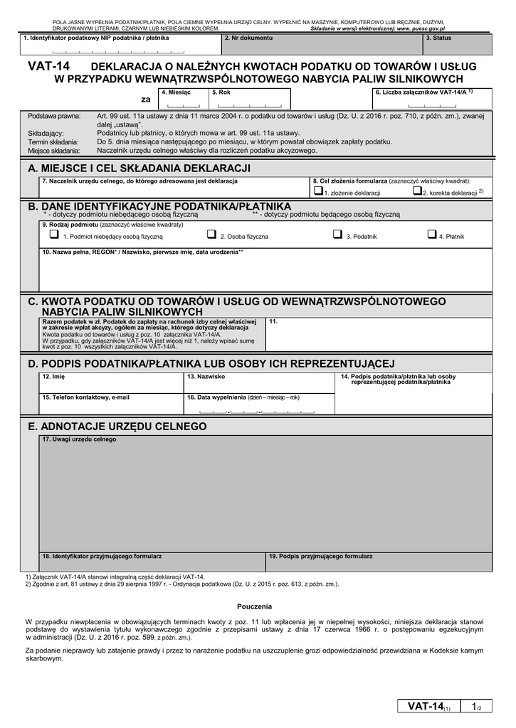 Załącznik do rozporządzenia Ministra Finansów z dnia ........................2016 r. (poz. .......) POLA JASNE WYPEŁNIA PODATNIK/PŁATNIK, POLA CIEMNE WYPEŁNIA URZĄD CELNY. WYPEŁNIĆ NA MASZYNIE, KOMPUTEROWO LUB RĘCZNIE, DUŻYMI, DRUKOWANYMI LITERAMI, CZARNYM LUB NIEBIESKIM KOLOREM. Składanie w wersji elektronicznej: www. puesc.gov.pl 3. Status 2. Nr dokumentu 1. Identyfikator podatkowy NIP podatnika / płatnika └────┴────┴────┴────┴────┴────┴────┴────┴────┴────┘ VAT-14 DEKLARACJA O NALEŻNYCH KWOTACH PODATKU OD TOWARÓW I USŁUG W PRZYPADKU WEWNĄTRZWSPÓLNOTOWEGO NABYCIA PALIW SILNIKOWYCH za Podstawa prawna: Składający: Termin składania: Miejsce składania: 4. Miesiąc 6. Liczba załączników VAT-14/A 1) 5. Rok └────┴────┴────┴────┘ └────┴────┘ └────┴────┴────┘ Art. 99 ust. 11a ustawy z dnia 11 marca 2004 r. o podatku od towarów i usług (Dz. U. z 2016 r. poz. 710, z późn. zm.), zwanej dalej ustawą”. ” Podatnicy lub płatnicy, o których mowa w art. 99 ust. 11a ustawy. Do 5. dnia miesiąca następującego po miesiącu, w którym powstał obowiązek zapłaty podatku. Naczelnik urzędu celnego właściwy dla rozliczeń podatku akcyzowego. A. MIEJSCE I CEL SKŁADANIA DEKLARACJI 7. Naczelnik urzędu celnego, do którego adresowana jest deklaracja 8. Cel złożenia formularza (zaznaczyć właściwy kwadrat): 1. złożenie deklaracji 2. korekta deklaracji 2) B. DANE IDENTYFIKACYJNE PODATNIKA/PŁATNIKA * - dotyczy podmiotu niebędącego osobą fizyczną 9. Rodzaj podmiotu (zaznaczyć właściwe kwadraty) 1. Podmiot niebędący osobą fizyczną ** - dotyczy podmiotu będącego osobą fizyczną 2. Osoba fizyczna 3. Podatnik 4. Płatnik 10. Nazwa pełna, REGON* / Nazwisko, pierwsze imię, data urodzenia** C. KWOTA PODATKU OD TOWARÓW I USŁUG OD WEWNĄTRZWSPÓLNOTOWEGO NABYCIA PALIW SILNIKOWYCH Razem podatek w zł. Podatek do zapłaty na rachunek izby celnej właściwej w zakresie wpłat akcyzy, ogółem za miesiąc, którego dotyczy deklaracja Kwota podatku od towarów i usług z poz. 10 załącznika VAT-14/A. W przypadku, gdy załączników VAT-14/A jest więcej niż 1, należy wpisać sumę kwot z poz. 10 wszystkich załączników VAT-14/A. 11. D. PODPIS PODATNIKA/PŁATNIKA LUB OSOBY ICH REPREZENTUJĄCEJ 12. Imię 13. Nazwisko 15. Telefon kontaktowy, e-mail 16. Data wypełnienia (dzień – miesiąc – rok) 14. Podpis podatnika/płatnika lub osoby reprezentującej podatnika/płatnika └────┴────┘-└────┴────┘-└────┴────┴────┴────┘ E. ADNOTACJE URZĘDU CELNEGO 17. Uwagi urzędu celnego 18. Identyfikator przyjmującego formularz 19. Podpis przyjmującego formularz 1) Załącznik VAT-14/A stanowi integralną część deklaracji VAT-14. 2) Zgodnie z art. 81 ustawy z dnia 29 sierpnia 1997 r. - Ordynacja podatkowa (Dz. U. z 2015 r. poz. 613, z późn. zm.). Pouczenia W przypadku niewpłacenia w obowiązujących terminach kwoty z poz. 11 lub wpłacenia jej w niepełnej wysokości, niniejsza deklaracja stanowi podstawę do wystawienia tytułu wykonawczego zgodnie z przepisami ustawy z dnia 17 czerwca 1966 r. o postępowaniu egzekucyjnym w administracji (Dz. U. z 2016 r. poz. 599, z późn. zm.). Za podanie nieprawdy lub zatajenie prawdy i przez to narażenie podatku na uszczuplenie grozi odpowiedzialność przewidziana w Kodeksie karnym skarbowym. VAT-14(1) 1/2 POLA JASNE WYPEŁNIA PODATNIK/PŁATNIK, POLA CIEMNE WYPEŁNIA URZĄD CELNY. WYPEŁNIĆ NA MASZYNIE, KOMPUTEROWO LUB RĘCZNIE, DUŻYMI, DRUKOWANYMI LITERAMI, CZARNYM LUB NIEBIESKIM KOLOREM. Składanie w wersji elektronicznej: www. puesc.gov.pl Objaśnienia do: 1) Deklaracji VAT-14: - w poz. 6 należy wpisać liczbę dołączonych załączników VAT-14/A, - jeżeli składający deklarację występuje w charakterze podatnika i płatnika, to składa 1-ną deklarację za dany okres rozliczeniowy; należy zaznaczyć w poz. 9 kwadrat nr 3 i 4, - w poz. 11 należy wpisać łączną kwotę podatku stanowiącą sumę kwot cząstkowych, które winny być wpłacone zgodnie z art. 103 ust. 5a i 5b ustawy, - w poz. 15 podanie informacji jest dobrowolne. 2) Załącznika VAT-14/A „ROZLICZENIE WEWNĄTRZWSPÓLNOTOWEGO NABYCIA PALIW SILNIKOWYCH”: - tabelę z części B załącznika należy wypełnić chronologicznie według dat transakcji, - jeżeli wystąpi konieczność wypełnienia więcej niż jednego załącznika w poz. 4 należy oznaczyć odpowiednio kolejne numery załaczników (np. 1, 2, 3), - w przypadku deklaracji składanej za pomocą środków komunikacji elektronicznej (interaktywnej) wiersze tabeli części B załącznika stanowią listę rozwijalną, - kolumnę b, c, oraz j wypełnia się tylko wówczas jeżeli składający deklarację występuje w charakterze płatnika, - jeżeli składający deklarację występuje w charakterze podatnika i płatnika (w poz. 5 zaznaczono kwadrat nr 3 i 4), to w przypadku transakcji dokonanej na własną rzecz w kolumnie d należy zaznaczyć kwadrat znakiem X; w pozostałych przypadkach kolumny d nie wypełnia się, - kolumnę e wypełnia się tylko w przypadku zastosowania procedury zawieszenia poboru akcyzy, - w kolumnie f należy wpisać datę transakcji powodującej powstanie obowiązku zapłaty kwoty podatku; przez datę transakcji należy rozumieć datę, od której liczy się termin wpłaty kwoty podatku zgodnie z art. 103 ust. 5a i 5b ustawy, - w kolumnie h należy wpisać wartość transakcji bez kwoty podatku, stanowiącą podstawę opodatkowania; jeżeli w danym dniu było więcej transakcji z tym samym kontrahentem, z zastrzeżeniem, że w przypadku płatnika transakcje te są rozliczane na rzecz tego samego podatnika, to można podać sumę wartości tych transakcji (z tego samego dnia), pod warunk