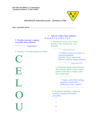 SZCZEP 462 DHiGZ w Łomiankach Gromada Zuchowa "Leśne Ludki" SPRAWNOŚĆ INDYWIDUALNA „ZNAWCA LITER” imię i nazwisko zucha............................................................................................................ 2. Potrafię odczytać i napisać wszystkie litery alfabetu. ______________________ 1. Zakreśl wielkie litery kółkiem. G, d, m, E, t, k, A, B, ć, F, p, Y (podpis rodzica) 3. Przeliteruj: swoje imię, totem, zbiórka, imię drużynowej, czuj, gromada. _________________________ (podpis drużynowej) 4. Narysuj, co przypominają ci te litery. C E L O U 5. Podziel wyrazy na sylaby za pomocą klaskania. Domino, litera, sprawność, bałwan, kolonia, lampa, drabina. _______________________ (podpis drużynowej) 6. Przygotuj zgadywankę literową dla gromady, gdzie swoim ciałem pokazywałeś litery. Napisz, jakie litery pokazałeś. ________________ 7. Napisz, jakie litery kolega napisał ci na plecach i podkreśl te, które zgadłeś. _______________________ 8. Wymień 4 sytuacje, w których czytanie i pisanie jest bardzo potrzebne. 9. Narysuj rysunek, którego nazwa zaczyna się na tą literę. A B C D E F G H I J K L L M N O P R S T U W Y Z