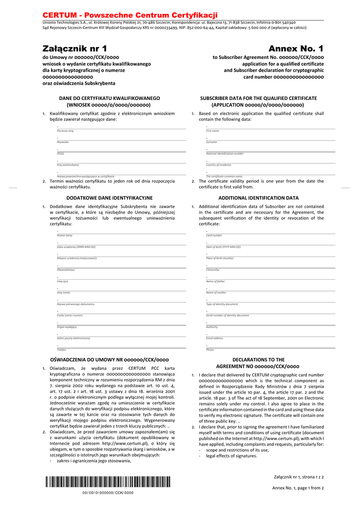 CERTUM - Powszechne Centrum Certyfikacji Unizeto Technologies S.A., ul. Królowej Korony Polskiej 21, 70-486 Szczecin; Korespondencja: ul. Bajeczna 13, 71-838 Szczecin, Infolinia 0-801 540340 Sąd Rejonowy Szczecin-Centrum XIII Wydział Gospodarczy KRS nr 0000233499, NIP: 852-000-64-44, Kapitał zakładowy: 5 600 000 zł (wpłacony w całości) Załącznik nr 1 Annex No. 1 do Umowy nr 000000/CCK/0000 wniosek o wydanie certyfikatu kwalifikowanego dla karty kryptograficznej o numerze 0000000000000000 oraz oświadczenia Subskrybenta to Subscriber Agreement No. 000000/CCK/0000 application for a qualified certificate and Subscriber declaration for cryptographic card number 0000000000000000 -DANE DO CERTYFIKATU KWALIFIKOWANEGO (WNIOSEK 00000/0/0000/000000) -SUBSCRIBER DATA FOR THE QUALIFIED CERTIFICATE (APPLICATION 00000/0/0000/000000) 1. Kwalifikowany certyfikat zgodnie z elektronicznym wnioskiem będzie zawierał następujące dane: . 1. Based on electronic application the qualified certificate shall contain the following data: . Pierwsze imię First name . . Nazwisko Surname . . PESEL National identification number . . Kraj zamieszkania Country of residence . . Nazwa powszechna występująca w certyfikacie 2. Termin ważności certyfikatu to jeden rok od dnia rozpoczęcia ważności certyfikatu. The certificate common name 2. The certificate validity period is one year from the date the certificate is first valid from. -DODATKOWE DANE IDENTYFIKACYJNE -ADDITIONAL IDENTIFICATION DATA 1. Dodatkowe dane identyfikacyjne Subskrybenta nie zawarte w certyfikacie, a które są niezbędne do Umowy, późniejszej weryfikacji tożsamości lub ewentualnego unieważnienia certyfikatu: . 1. Additional identification data of Subscriber are not contained in the certificate and are necessary for the Agreement, the subsequent verification of the identity or revocation of the certificate: . Numer karty Card number . . Data urodzenia (RRRR-MM-DD) Date of birth (YYYY-MM-DD) . . Miejsce urodzenia (miejscowość) Place of birth (locality) . . Obywatelstwo Citizenship . . Imię ojca Name of father . . Imię matki Name of mother . . Nazwa pierwszego dokumentu Type of identity document . . Cechy (seria i numer) Serial number of identity document . . Organ wydający Authority . . Adres poczty elektronicznej Email address . . Telefon Phone -OŚWIADCZENIA DO UMOWY NR 000000/CCK/0000 1. Oświadczam, że wydana przez CERTUM PCC karta kryptograficzna o numerze 0000000000000000 stanowiąca komponent techniczny w rozumieniu rozporządzenia RM z dnia 7. sierpnia 2002 roku wydanego na podstawie art. 10 ust. 4, art. 17 ust. 2 i art. 18 ust. 3 ustawy z dnia 18. września 2001 r. o podpisie elektronicznym podlega wyłącznej mojej kontroli. Jednocześnie wyrażam zgodę na umieszczenie w certyfikacie danych służących do weryfikacji podpisu elektronicznego, które są zawarte w tej karcie oraz na stosowanie tych danych do weryfikacji mojego podpisu elektronicznego. Wygenerowany certyfikat będzie zawierał jeden z trzech kluczy publicznych: .. 2. Oświadczam, że przed zawarciem umowy zapoznałem(am) się z warunkami użycia certyfikatu (dokument opublikowany w Internecie pod adresem http://www.certum.pl), o który się ubiegam, w tym o sposobie rozpatrywania skarg i wniosków, a w szczególności o istotnych jego warunkach obejmujących: - zakres i ograniczenia jego stosowania, -DECLARATIONS TO THE AGREEMENT NO 000000/CCK/0000 1. I declare that delivered by CERTUM cryptographic card number 0000000000000000 which is the technical component as defined in Rozporządzenie Rady Ministrów z dnia 7 sierpnia issued under the article 10 par. 4, the article 17 par. 2 and the article. 18 par. 3 of The act of 18 September, 2001 on Electronic remains solely under my control. I also agree to place in the certificate information contained in the card and using these data to verify my electronic signature. The certificate will contain one of three public key: .. 2. I declare that, prior to signing the agreement I have familiarized myself with terms and conditions of using certificate (document published on the Internet at http://www.certum.pl), with which I have applied, including complaints and requests, particularly for: - scope and restrictions of its use, - legal effects of signatures. Załącznik nr 1, strona 1 z 2 Annex No. 1, page 1 from 2 00/ 00/ 0/ 000000/ CCK/ 0000 CERTUM - Powszechne Centrum Certyfikacji Unizeto Technologies S.A., ul. Królowej Korony Polskiej 21, 70-486 Szczecin; Korespondencja: ul. Bajeczna 13, 71-838 Szczecin, Infolinia 0-801 540340 Sąd Rejonowy Szczecin-Centrum XIII Wydział Gospodarczy KRS nr 0000233499, NIP: 852-000-64-44, Kapitał zakładowy: 5 600 000 zł (wpłacony w całości) - skutki prawne składania podpisów. 3. Oświadczam, że wszystkie informacje podane przeze mnie w formularzu, są zgodne z prawdą. Wyrażam zgodę na przetwarzanie moich danych osobowych przez Unizeto Technologies S.A. i sieć Systemu Rejestracji, dla potrzeb niezbędnych do realizacji procesu certyfikacji. Ponadto, przyjmuję do wiadomości iż: mam prawo dostępu do treści danych osobowych, o których mowa wyżej, mam prawo do ich poprawiania, a administratorem tych danych będzie Unizeto Technologies S.A. z siedzibą w Szczecinie, ul. Królowej Korony Polskiej 21. 4. Adres do korespondencji: . 3. I declare that the information set forth in the form is true. I give my consent to process my personal data by Unizeto and affiliated Registration Offices for the purposes of the certification process. Furthermore, I acknowledge that: I have the right to access my personal data referred to above, I have the right to correct, and the administrator of these data will be Unizeto with seat in Szczecin, Królowej Korony Polskiej str. 21. 4. Address for correspondence: . Name and surname . Correspondence name . Imie i nazwisko Street address . . Nazwa korespondencyjna Postal code, Locality . Ulica, nr . Kod, Miasto Miejscowość i data P